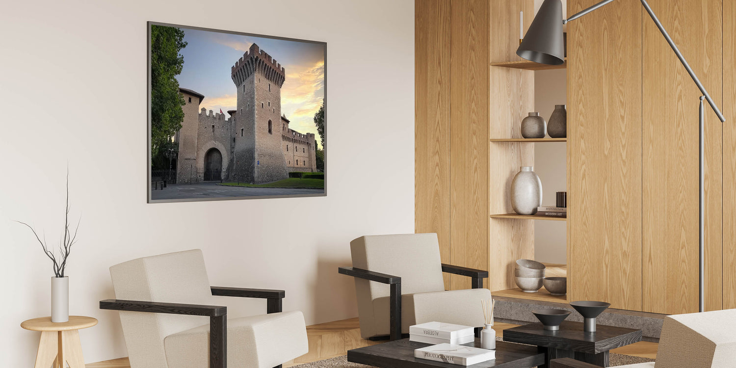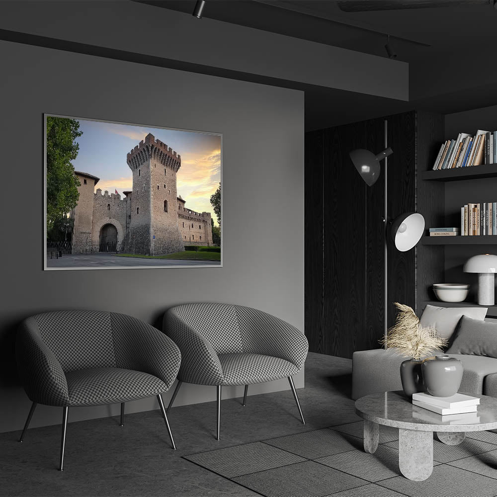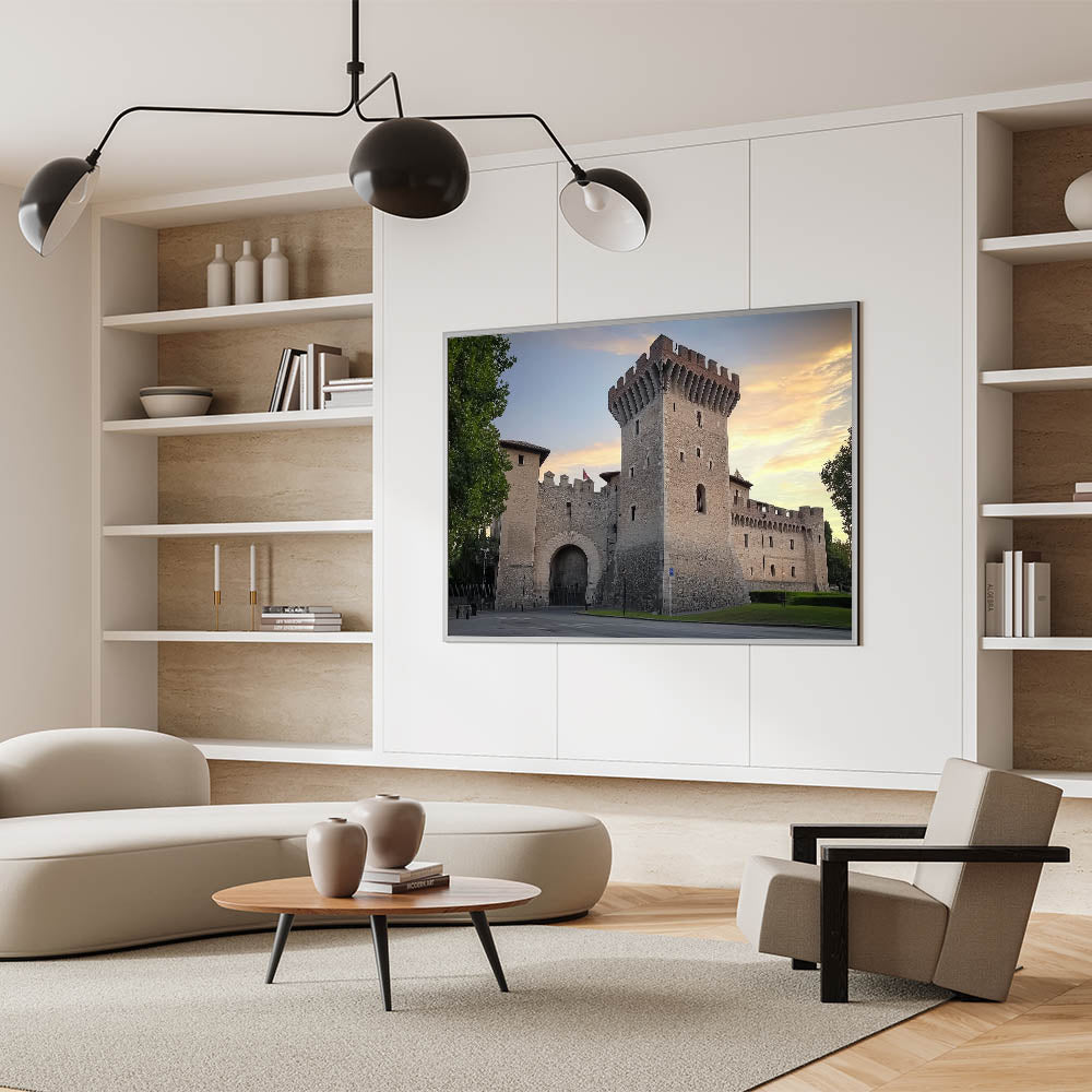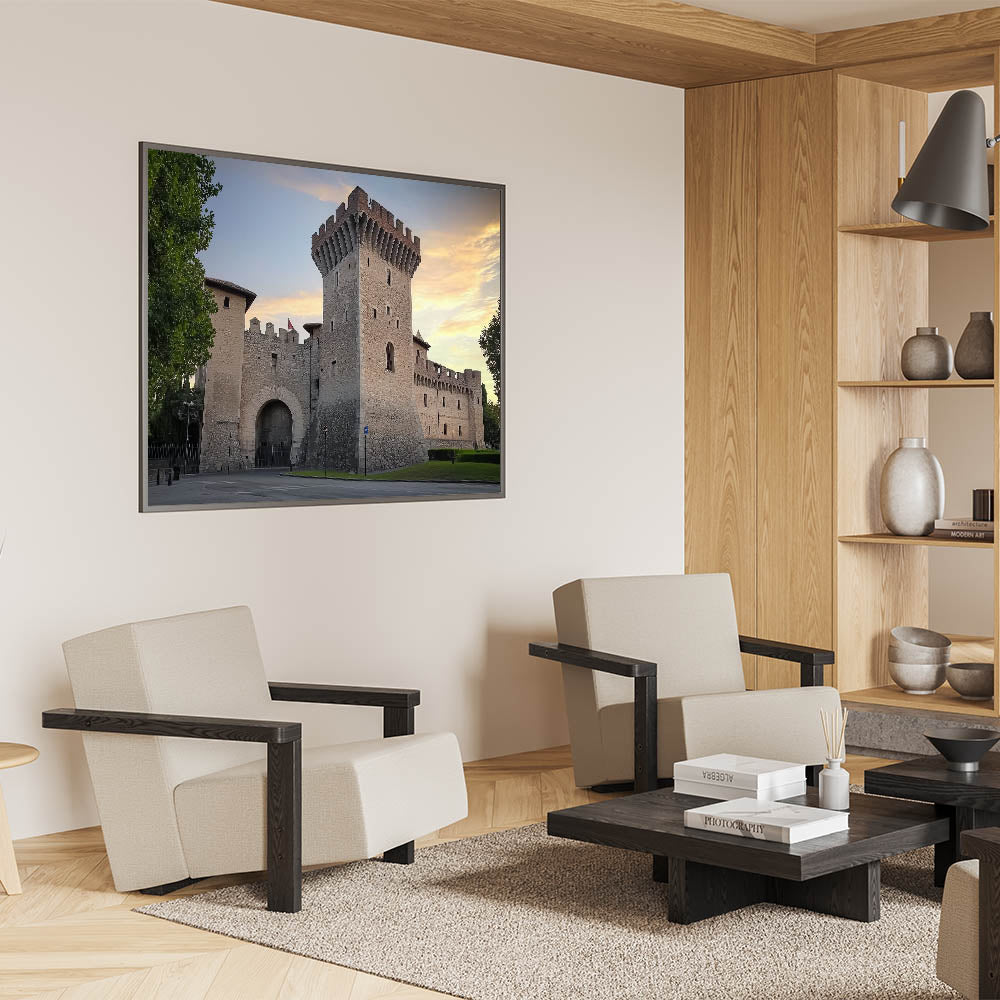 Capture the timeless allure of medieval architecture with this stunning artwork of a historic stone fortress, set against the warm hues of a serene sunset. The detailed craftsmanship of the fortress walls and its commanding tower evoke a sense of strength and history, making it a striking addition to any decor. This piece is perfect for history enthusiasts and those seeking to infuse their space with the charm of a bygone era.