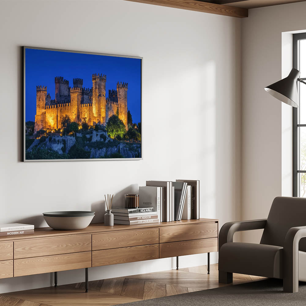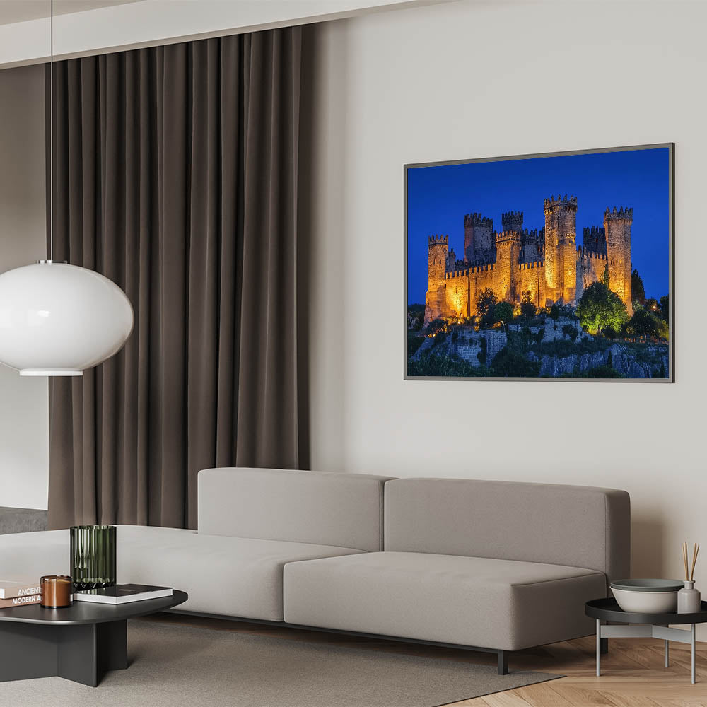 Bring the brilliance of history to your home with this illuminated castle wall art, featuring a majestic medieval fortress bathed in warm golden lights against a deep blue evening sky. The intricate details of the castle walls and the glowing ambiance create a stunning visual that exudes both grandeur and timeless charm. This captivating artwork is perfect for anyone who admires European castles and dramatic landscapes.