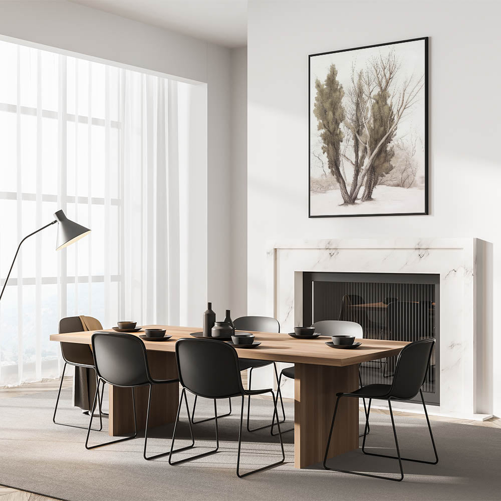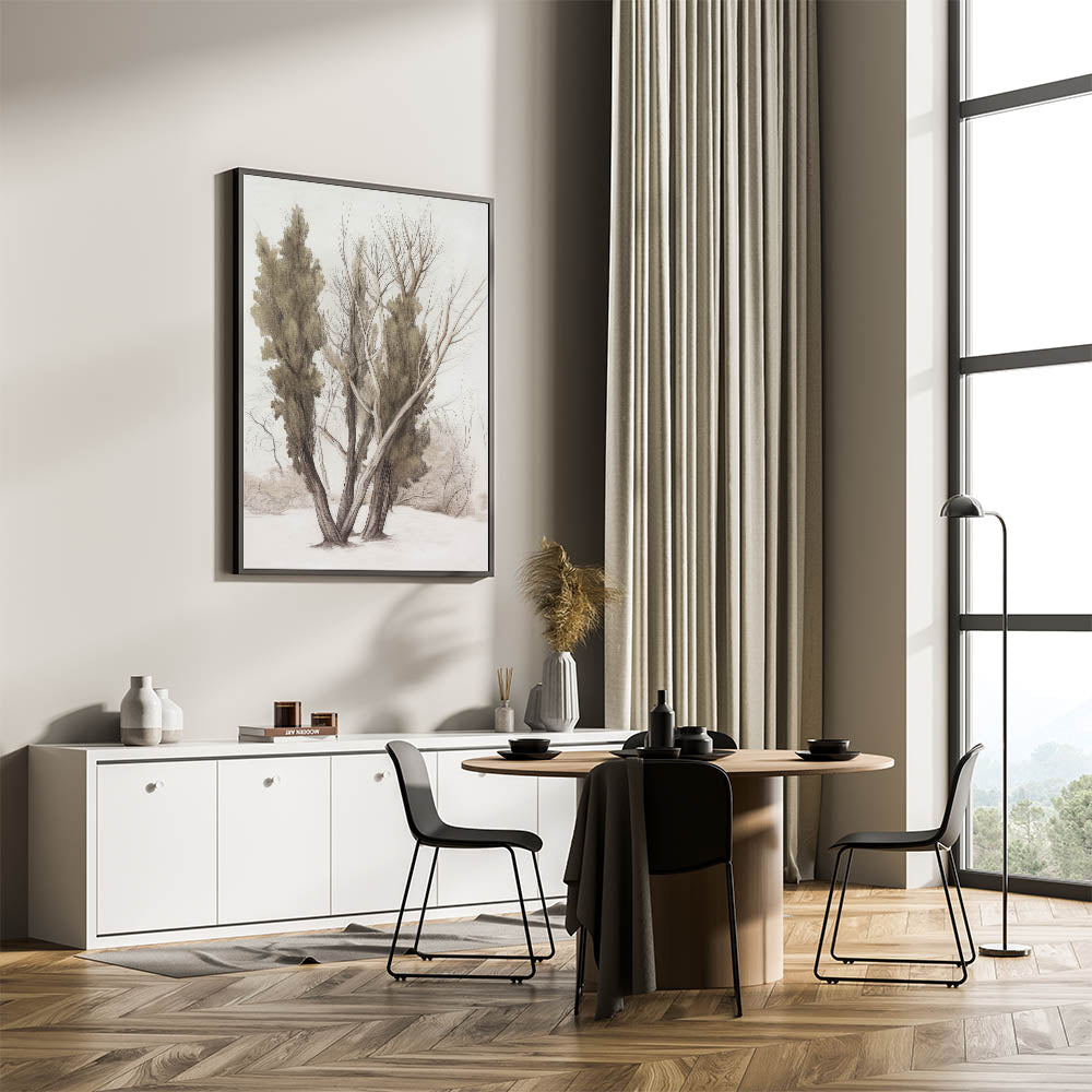 Bring the tranquility of nature indoors with this stunning depiction of elegant winter trees, captured in soft, muted tones. Perfectly suited for modern, rustic, or minimalist spaces, this artwork offers a calming essence that transforms any room into a serene retreat.