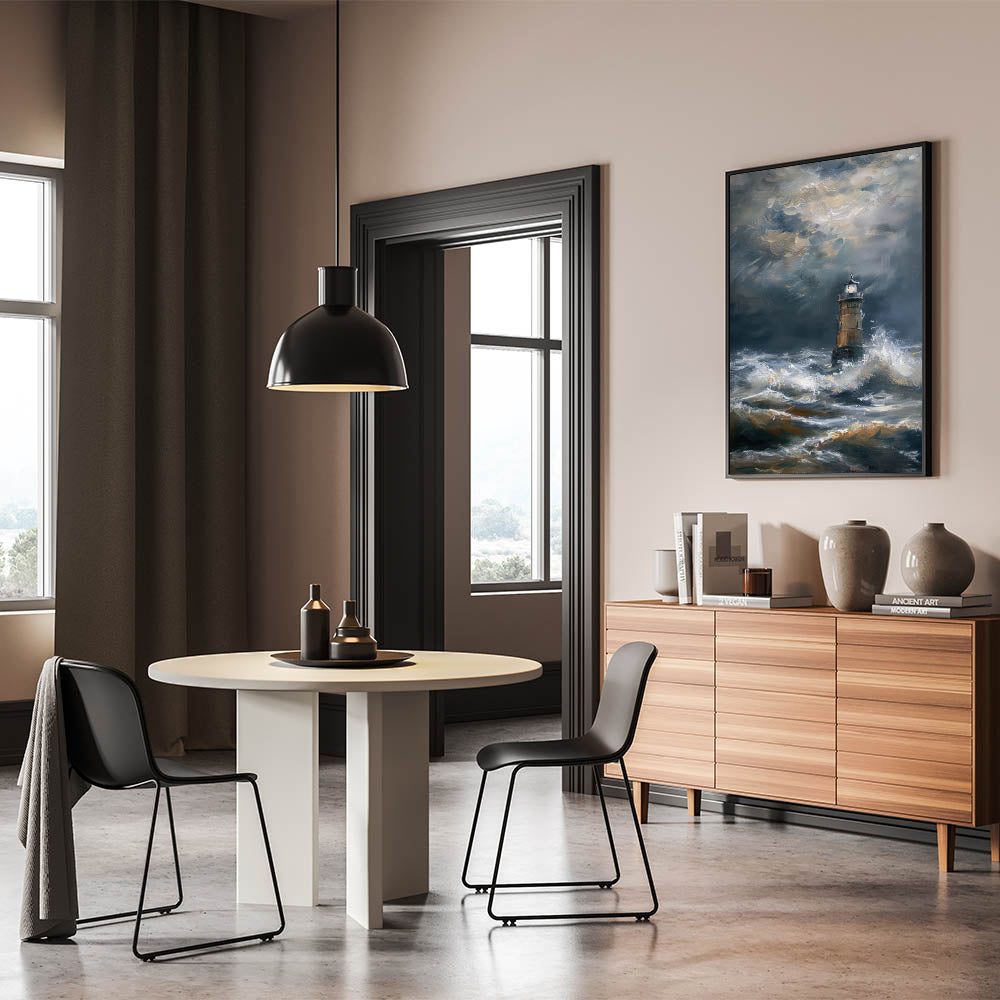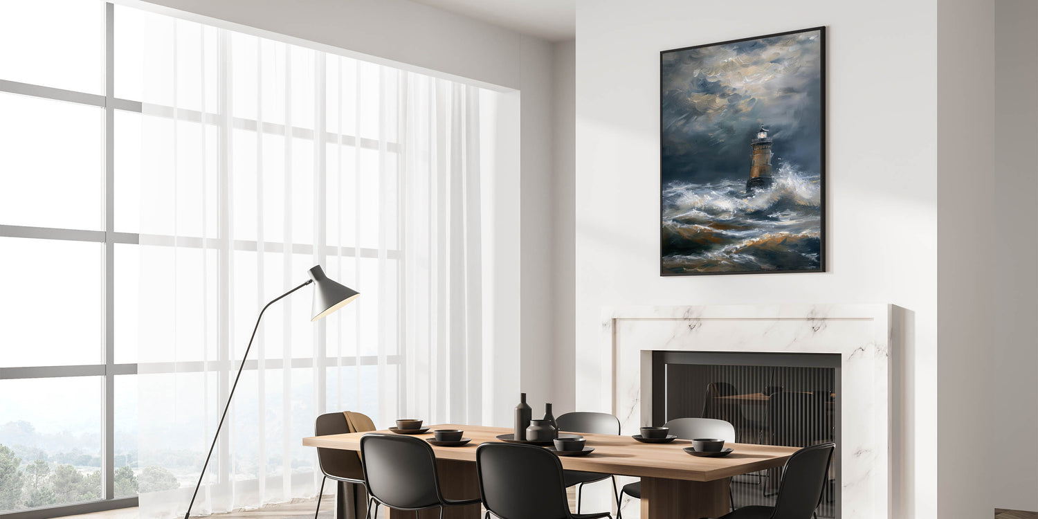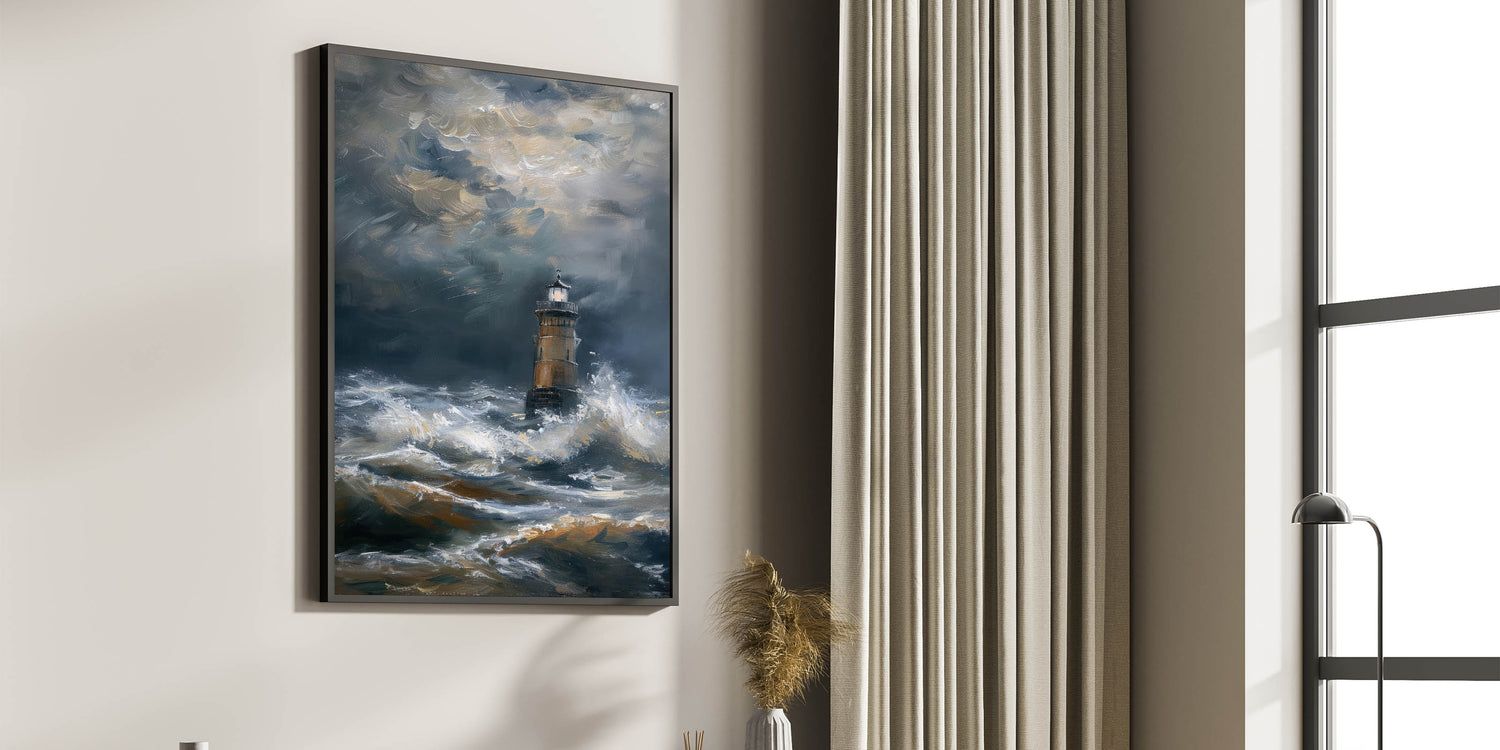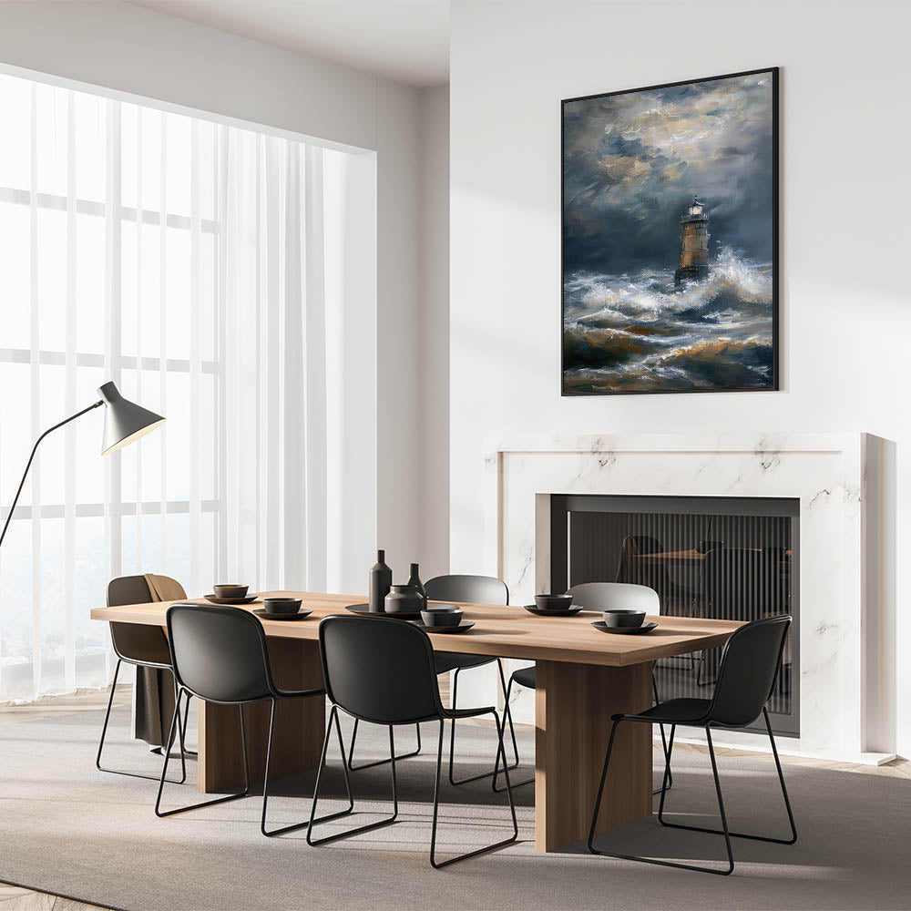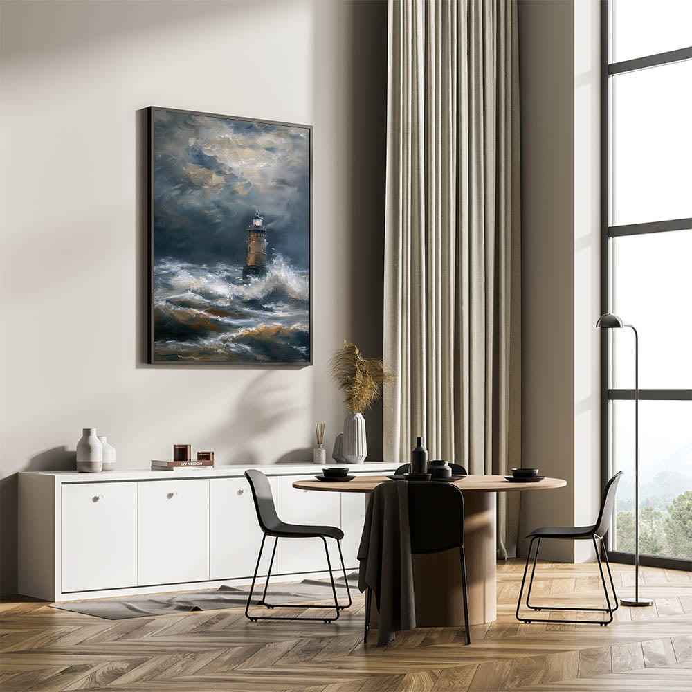 Whether hung in a living room, office, or bedroom, this stormy lighthouse artwork creates a captivating focal point. Its bold composition and striking colors evoke feelings of strength and serenity, making it a timeless addition to any decor.