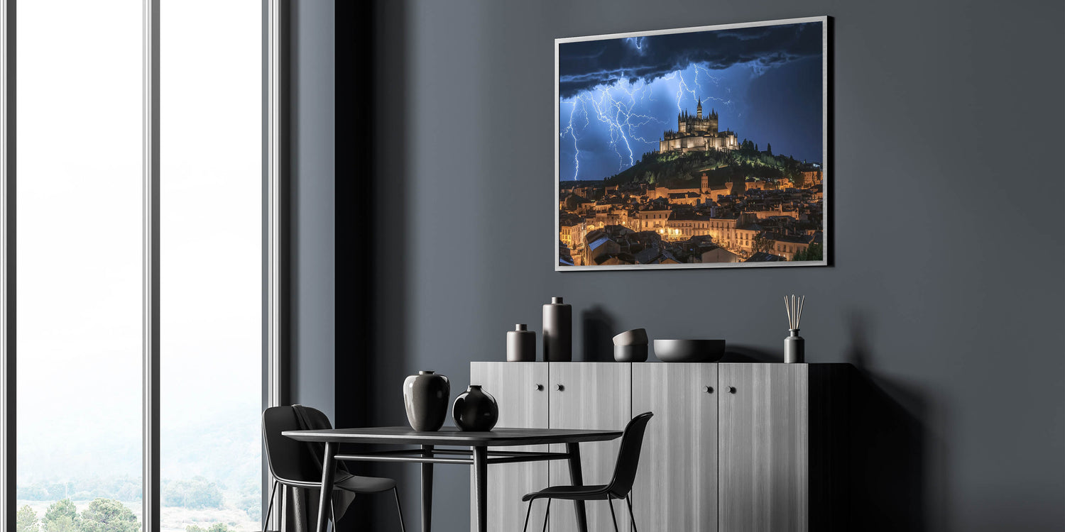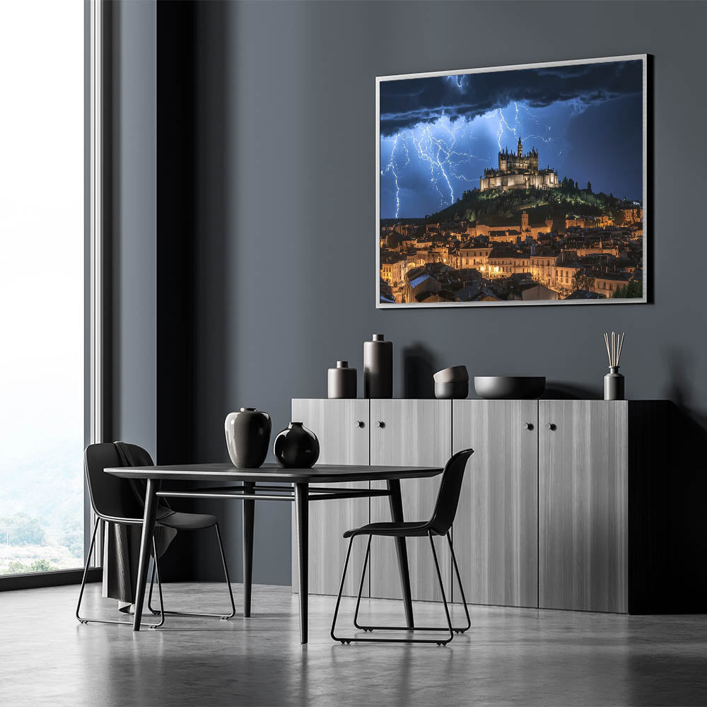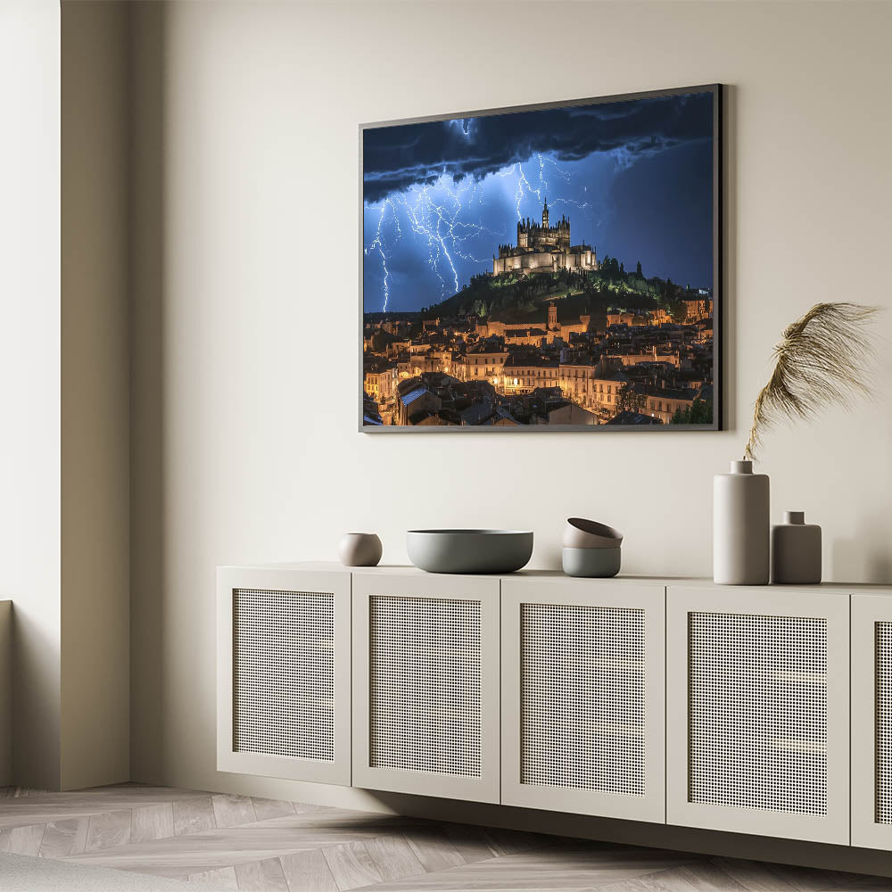 Capture the power of nature with this breathtaking castle wall art, featuring a dramatic medieval fortress illuminated by striking lightning against a stormy night sky. This visually stunning artwork combines the majesty of historic architecture with the intensity of a natural storm, creating an unforgettable centerpiece for any space. The glowing castle on the hill exudes timeless elegance, making it a perfect choice for those who admire iconic European castles.