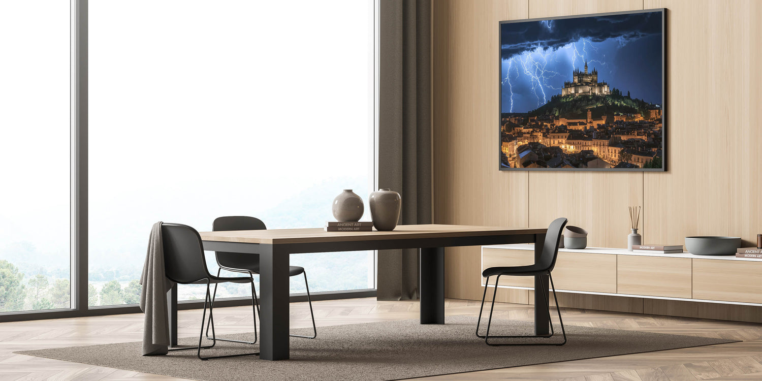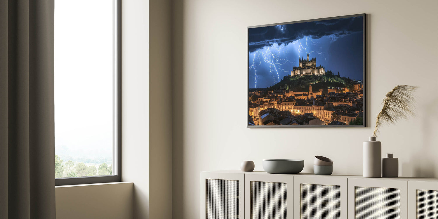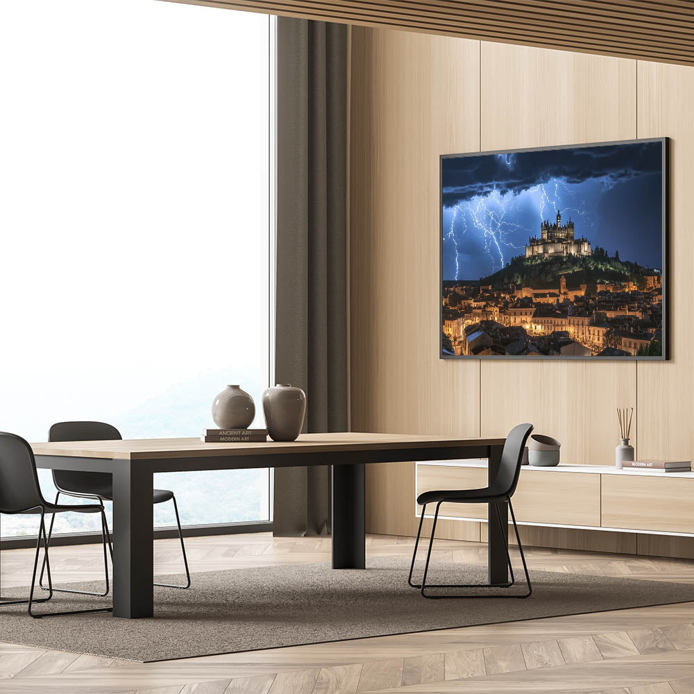 Capture the power of nature with this breathtaking castle wall art, featuring a dramatic medieval fortress illuminated by striking lightning against a stormy night sky. This visually stunning artwork combines the majesty of historic architecture with the intensity of a natural storm, creating an unforgettable centerpiece for any space. The glowing castle on the hill exudes timeless elegance, making it a perfect choice for those who admire iconic European castles.