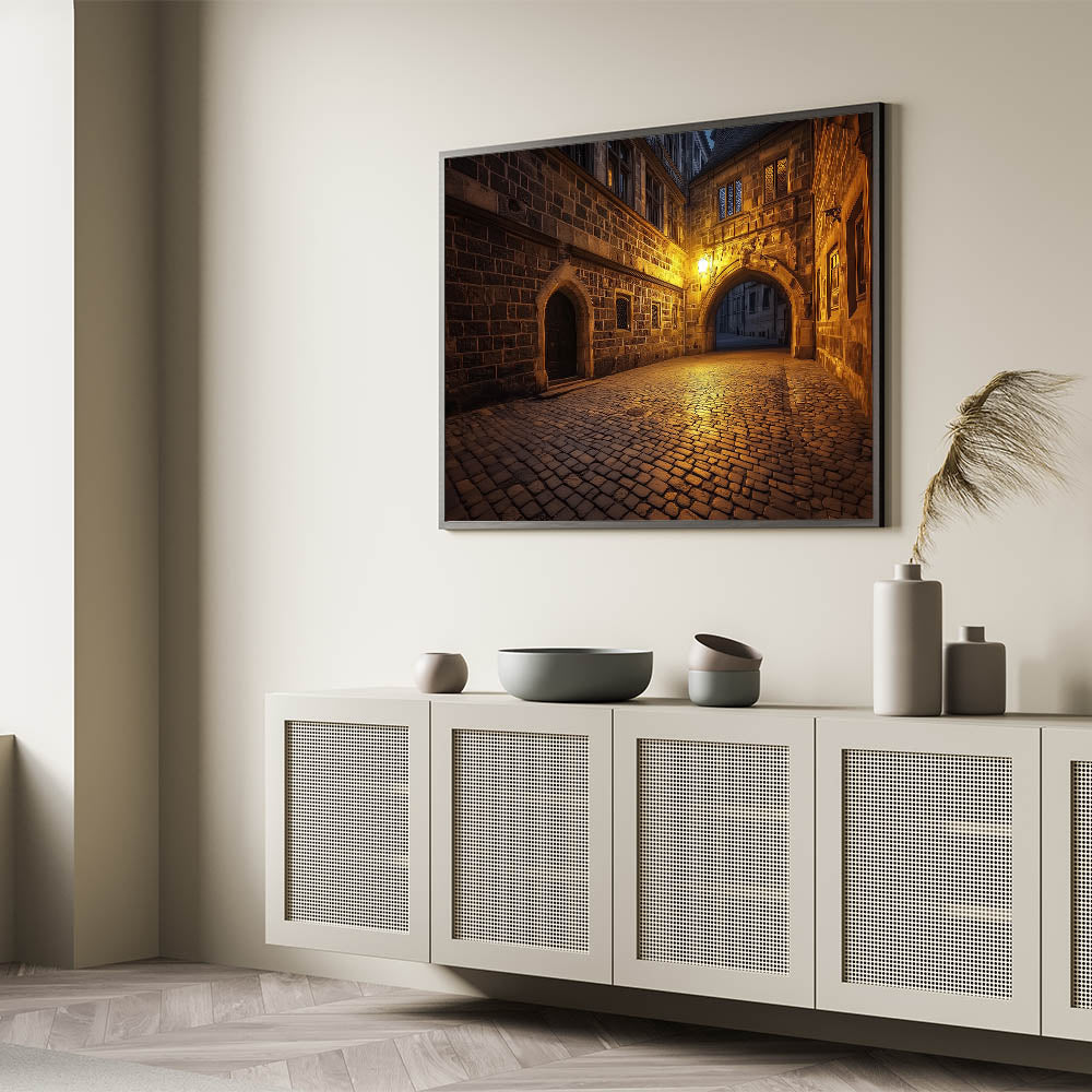 Step into the timeless beauty of medieval architecture with this stunning artwork, showcasing an illuminated archway and cobblestone path in a historic castle setting. The soft golden glow of the lantern casts a serene and inviting atmosphere, making this piece a perfect choice for adding warmth and elegance to your space.