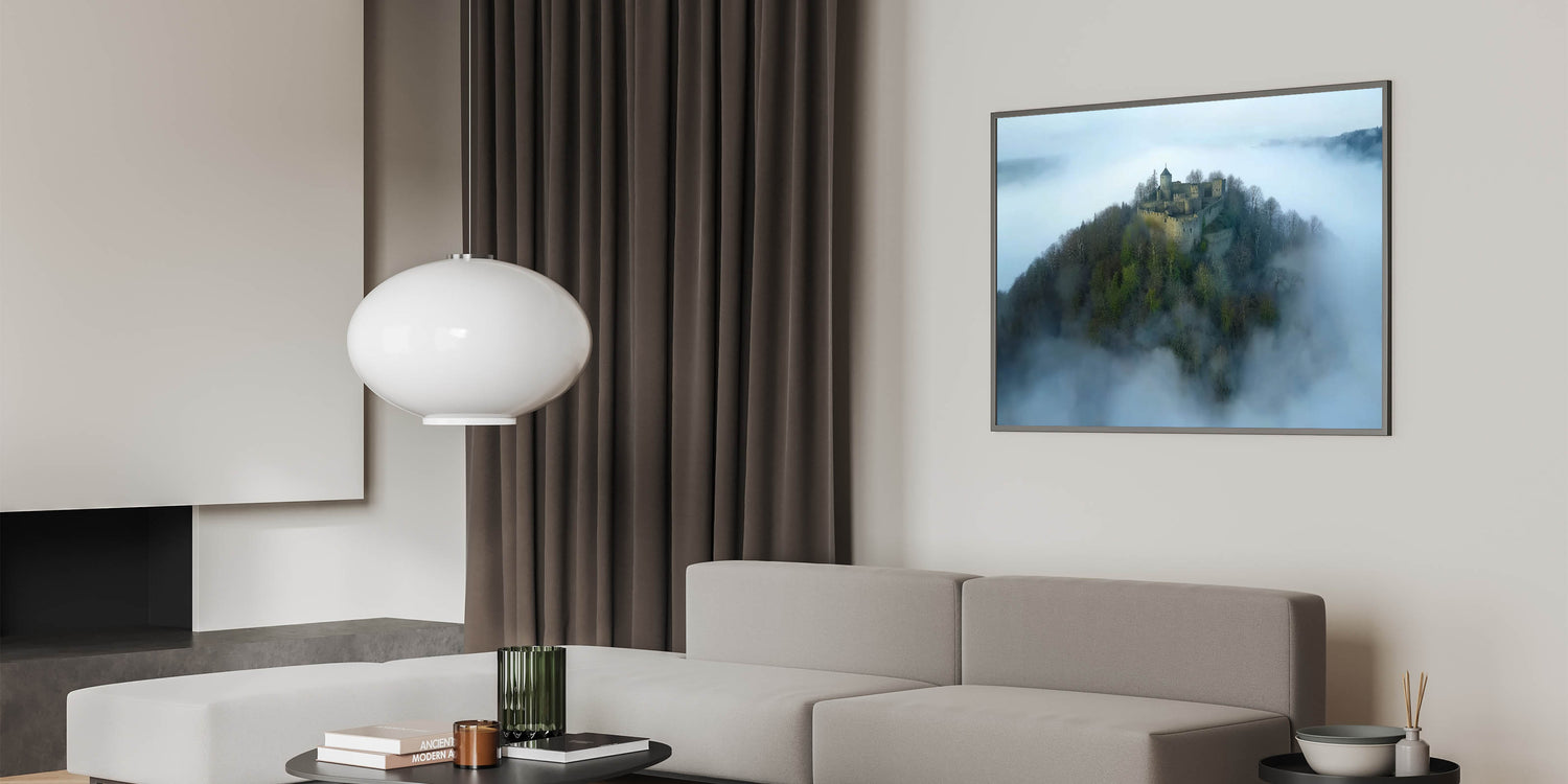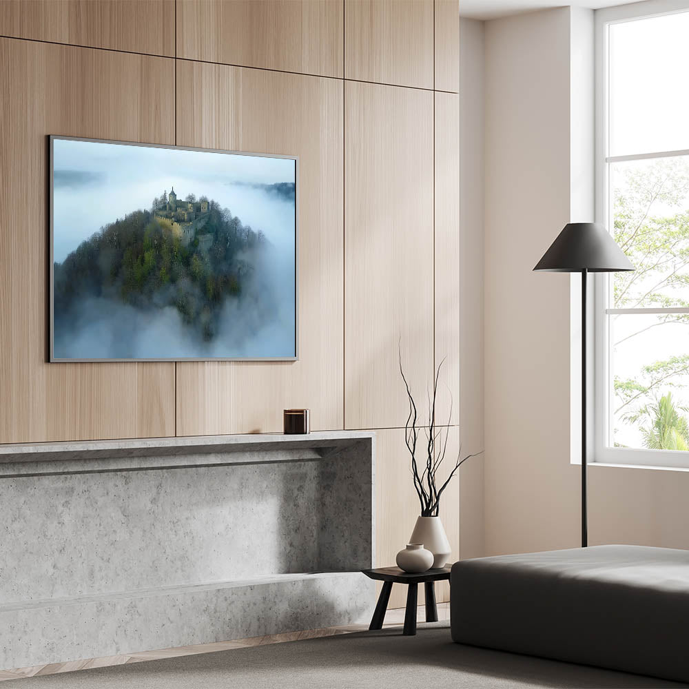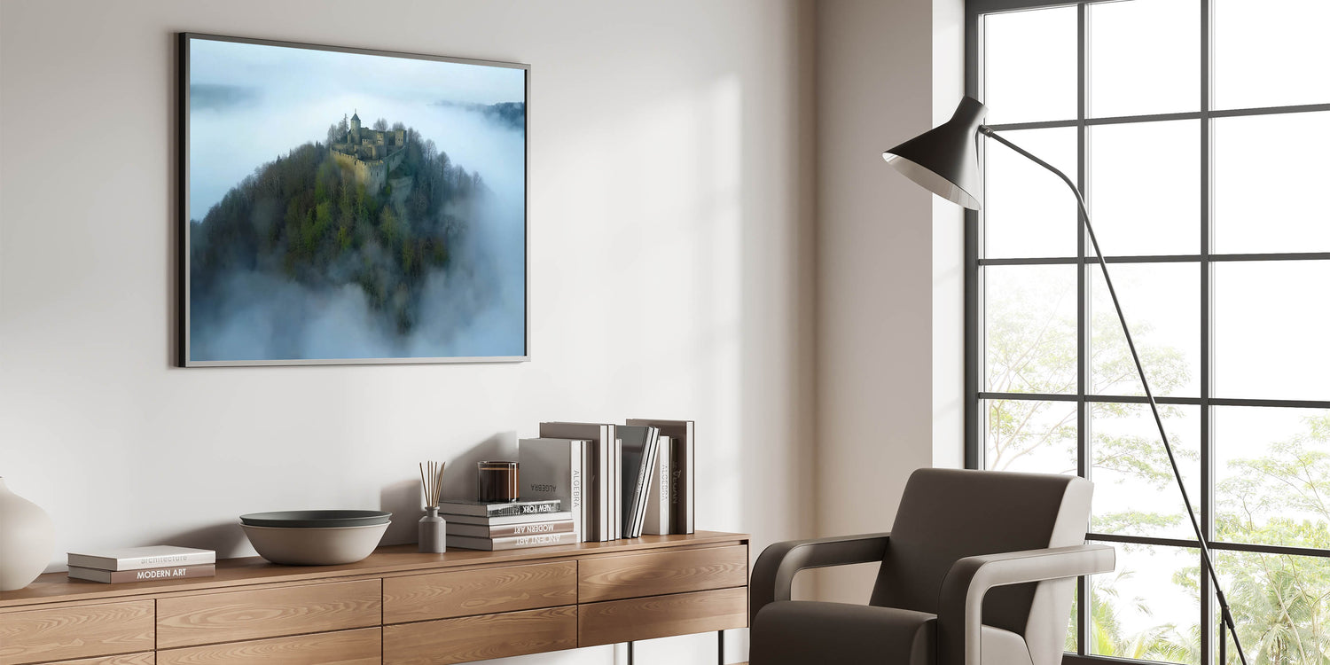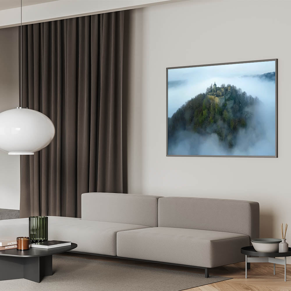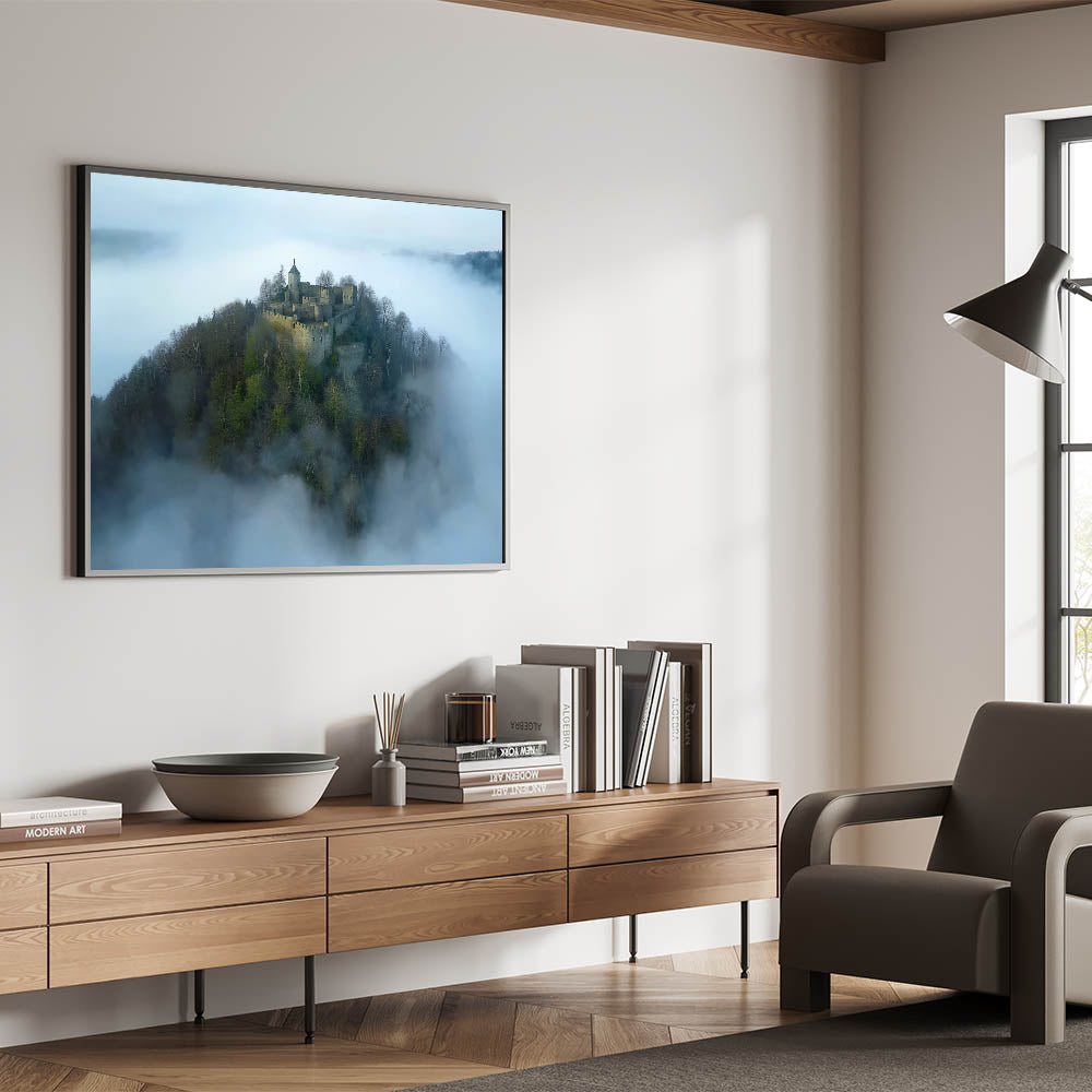 Step into a world of enchantment with this breathtaking misty fortress landscape art. This aerial view captures a medieval castle nestled atop a hill, surrounded by a sea of clouds. The serene and mysterious atmosphere makes this artwork a perfect addition to your decor, evoking the romance and intrigue of ancient times.