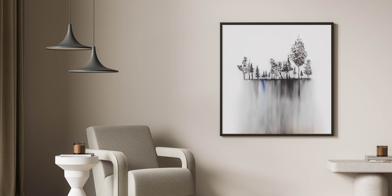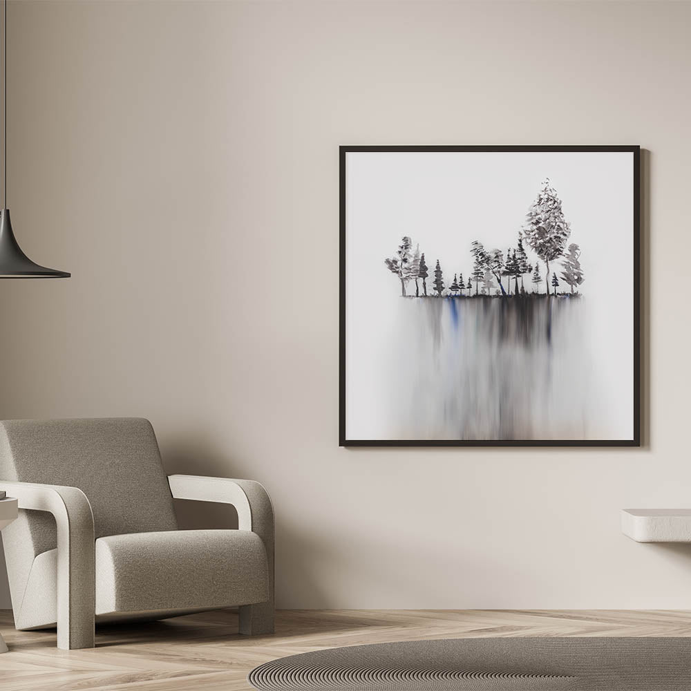 Create a sense of peace and sophistication with this serene landscape artwork, featuring an abstract black-and-white forest with a mesmerizing reflection. The tranquil nature scene is perfect for modern interiors, offering a minimalist yet elegant aesthetic for your space.