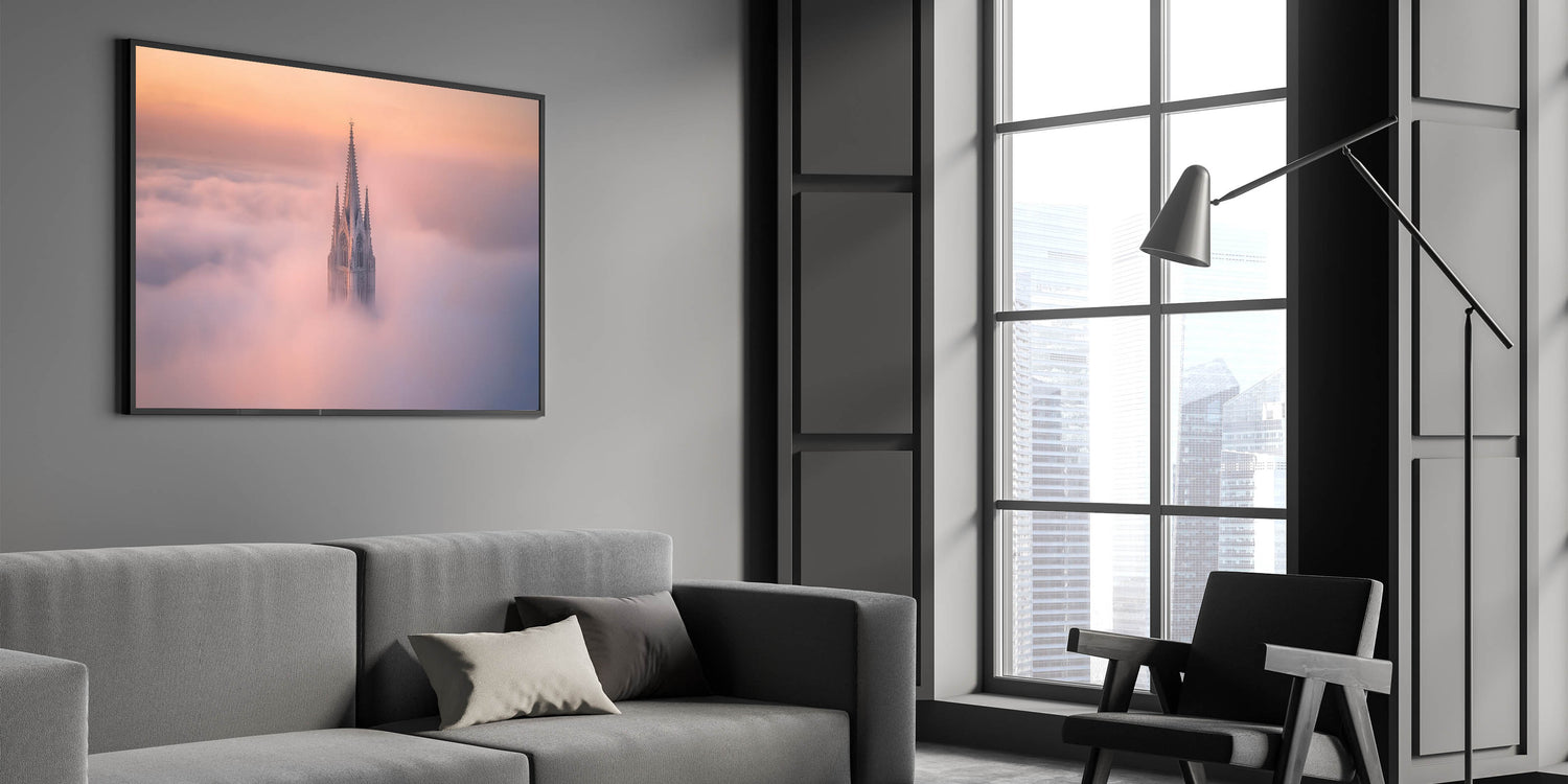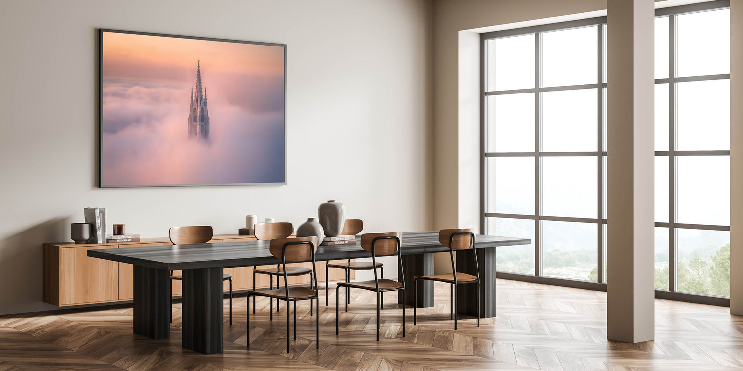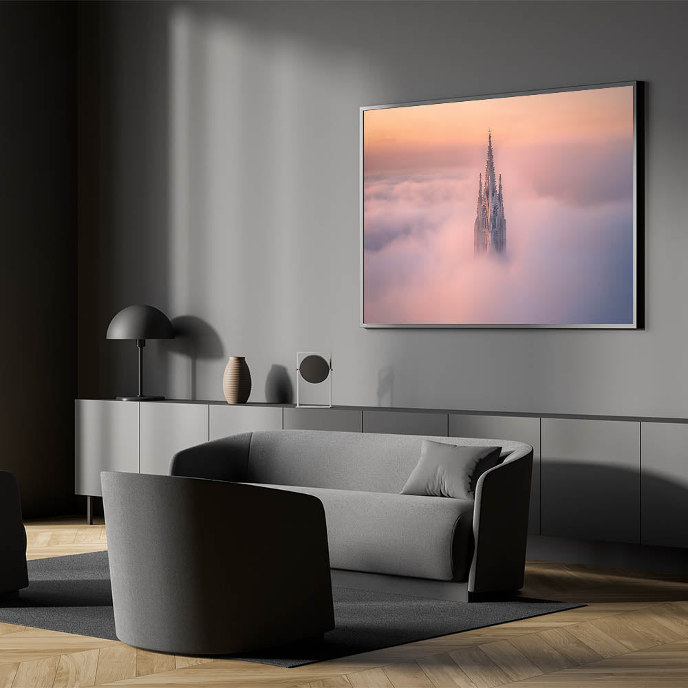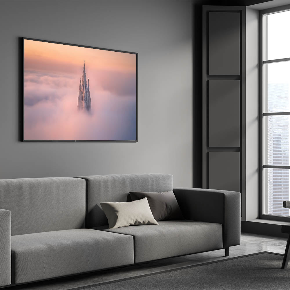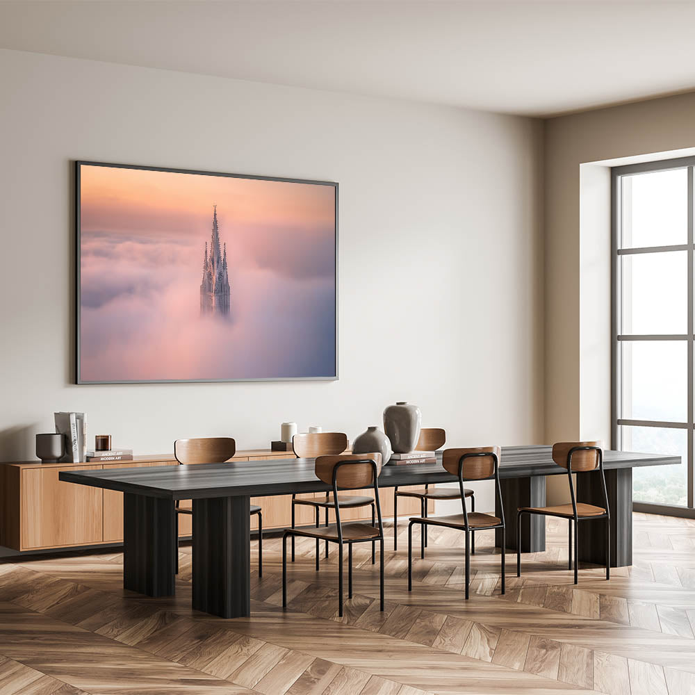 Elevate your decor with this mystical castle spire artwork, capturing a stunning Gothic tower rising majestically through a sea of soft morning mist. This unique castle artwork perfectly combines architectural elegance and nature’s ethereal beauty, making it an exceptional addition to any space. The delicate hues of pink and orange in the sky add warmth and serenity, creating a captivating composition.