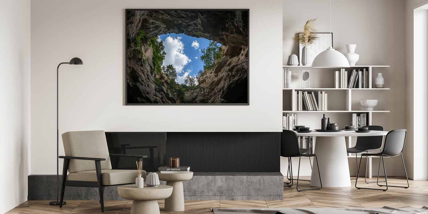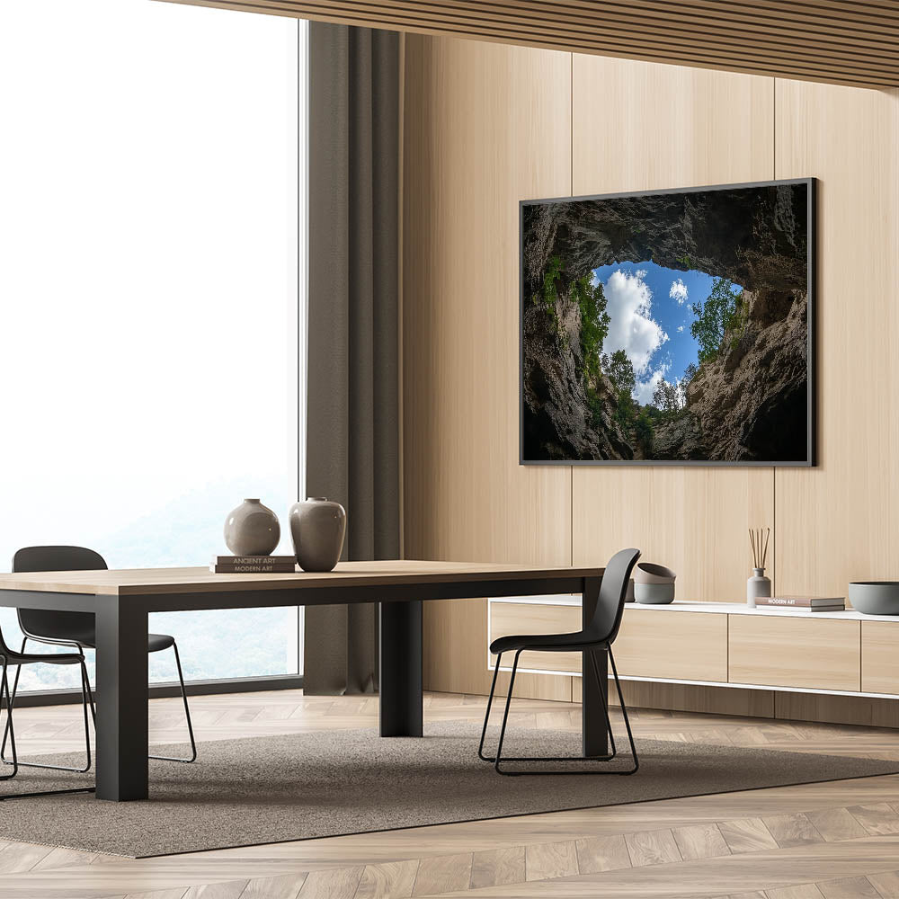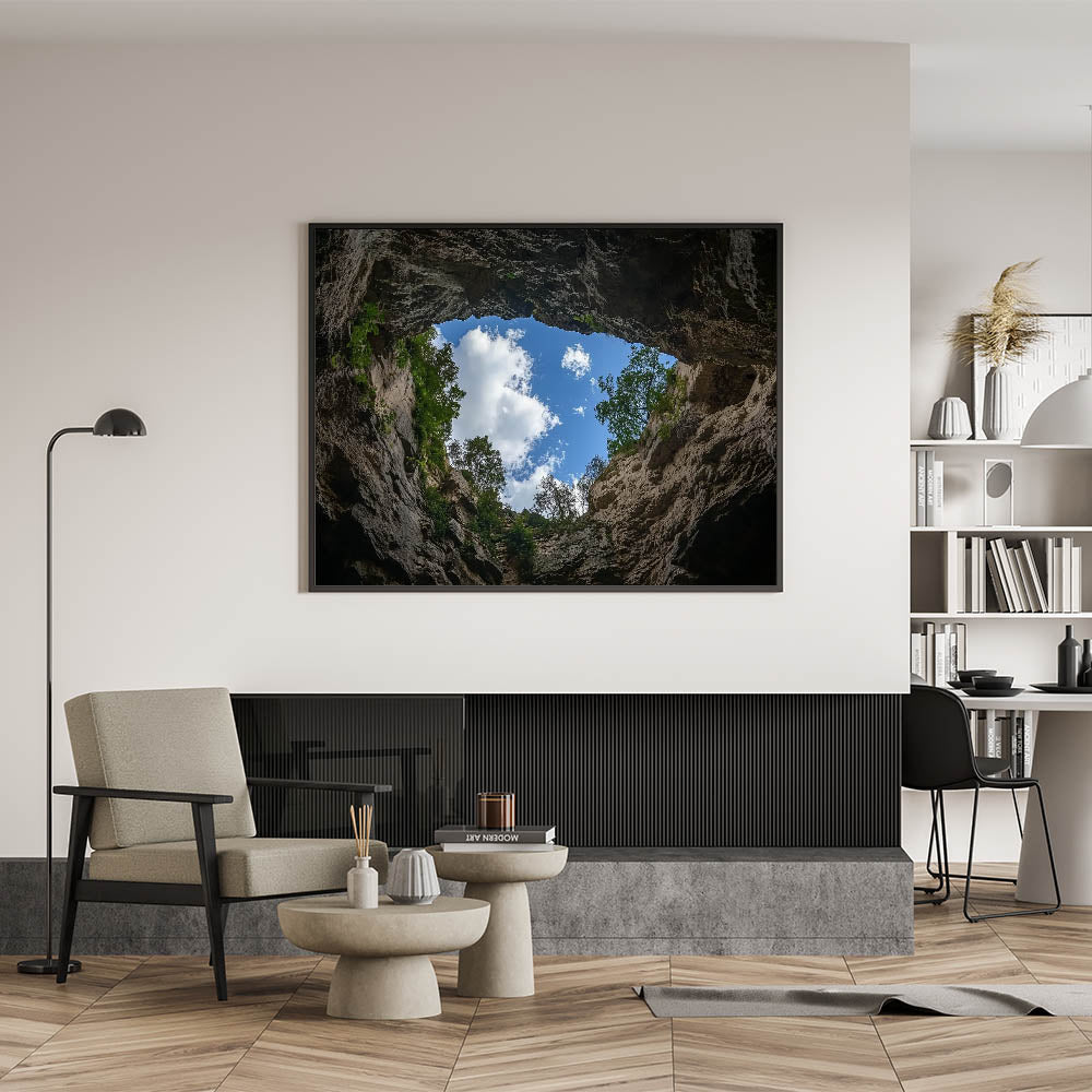 Experience the serenity of nature with this Open Sky Canyon Art Decor. Featuring a breathtaking view of the sky framed by rugged canyon walls and lush greenery, this artwork beautifully captures the harmony of Earth and sky. The vivid blue sky dotted with soft clouds brings a sense of openness and tranquility, making it a perfect addition to any living space, office, or bedroom.