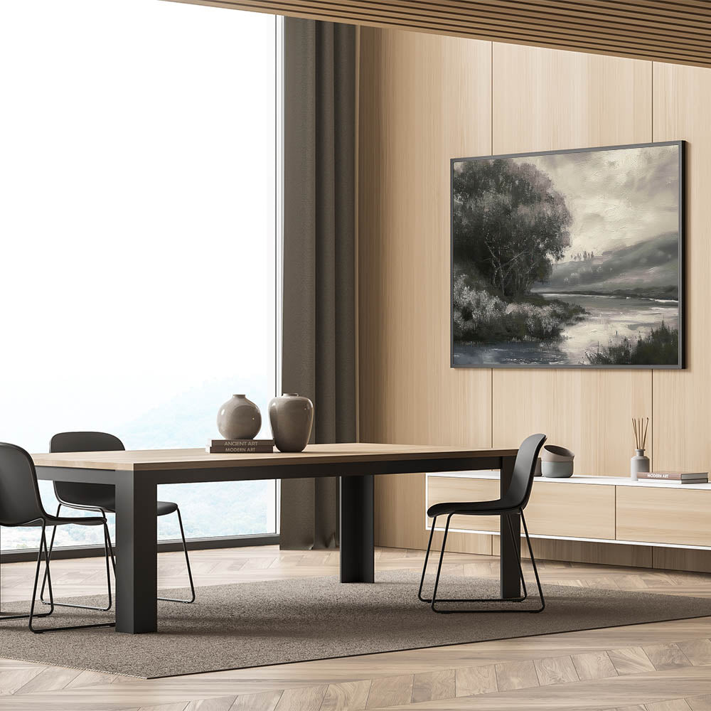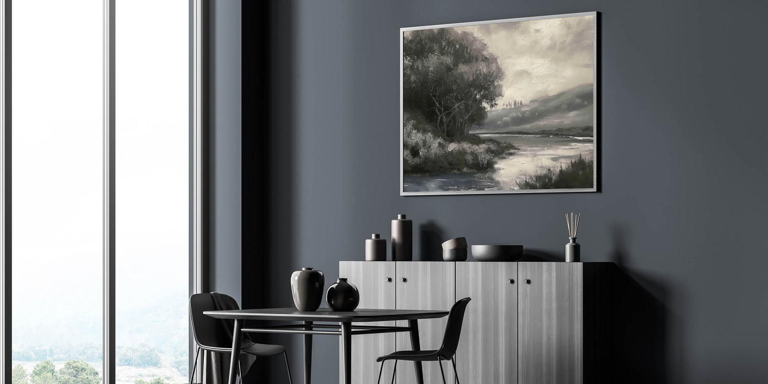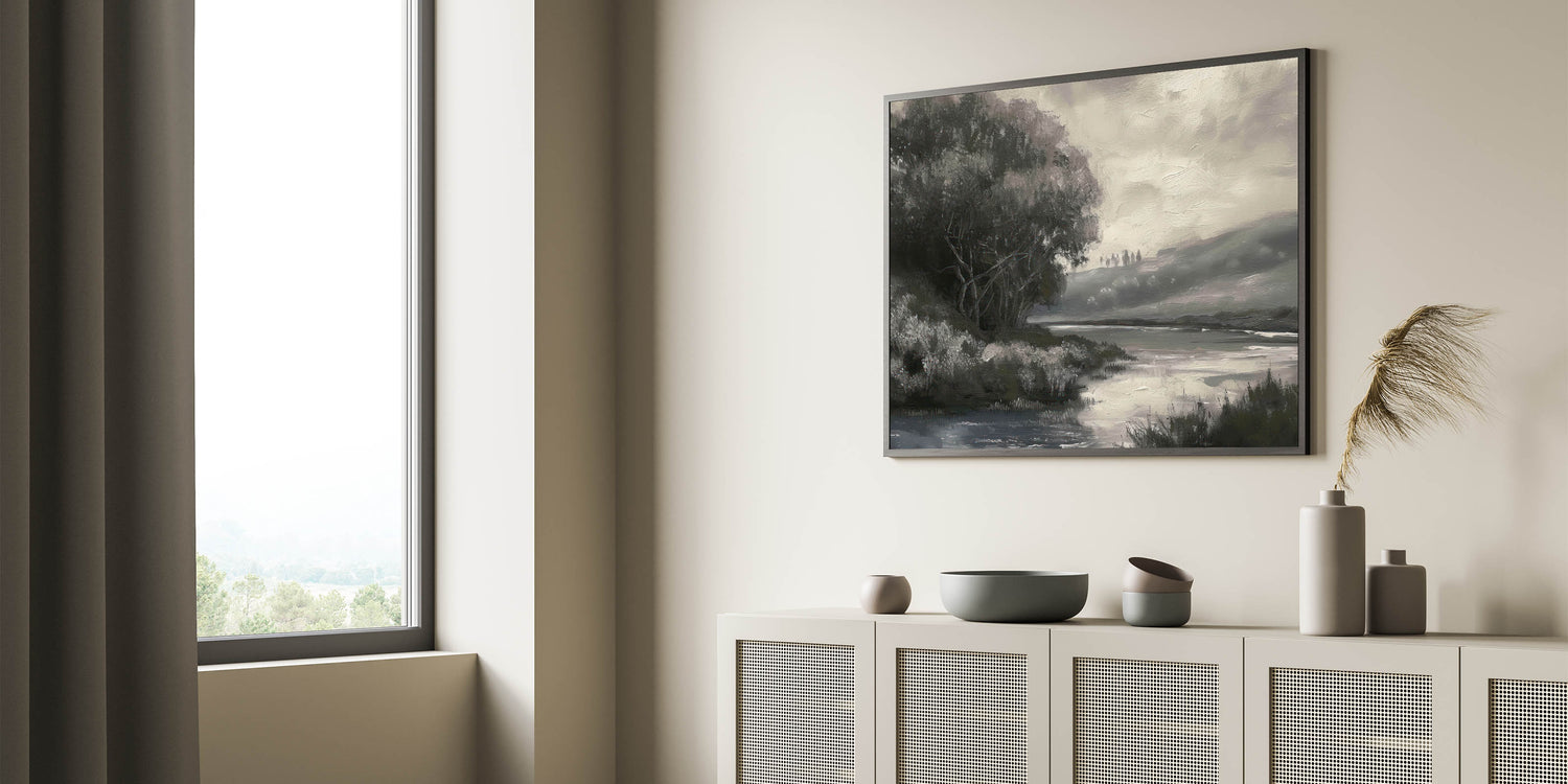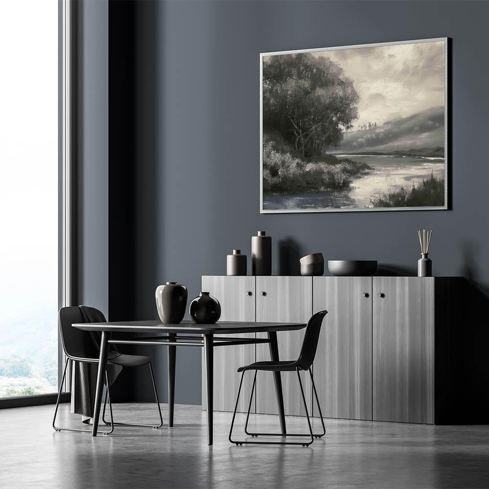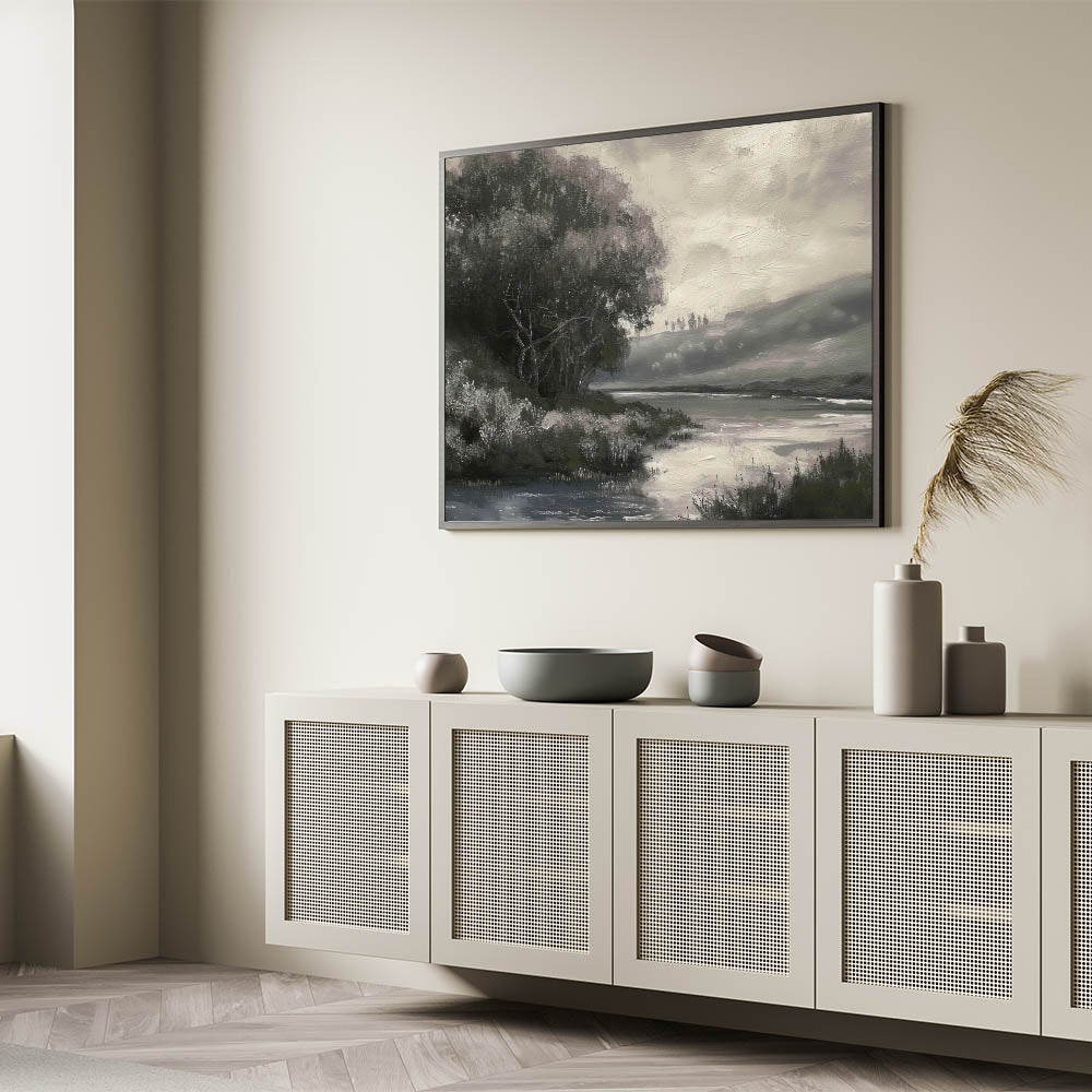 Immerse yourself in the beauty of nature with this Peaceful Riverside Landscape, a captivating piece of nature's harmony abstract art. This serene scene features a tranquil riverbank, rich foliage, and rolling hills enveloped in soft clouds. The muted tones of dark gray, olive green, and cream create a calming ambiance that complements a variety of interior styles.