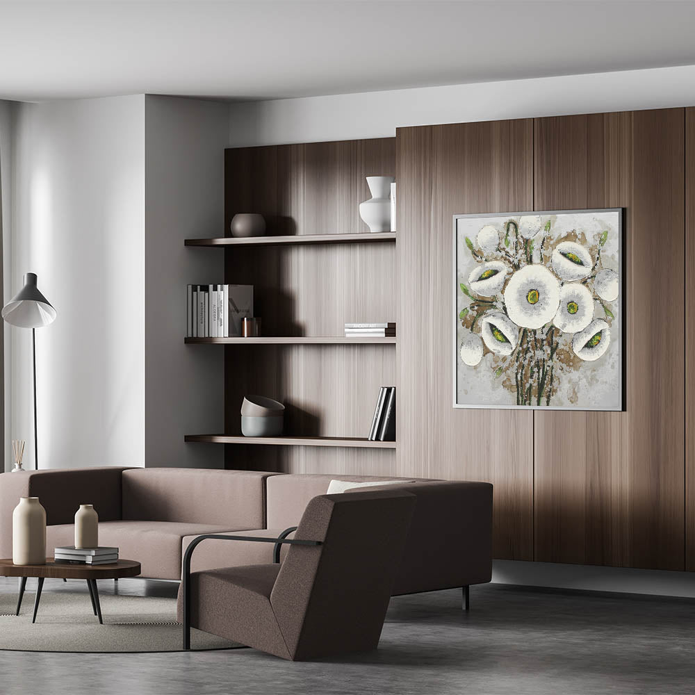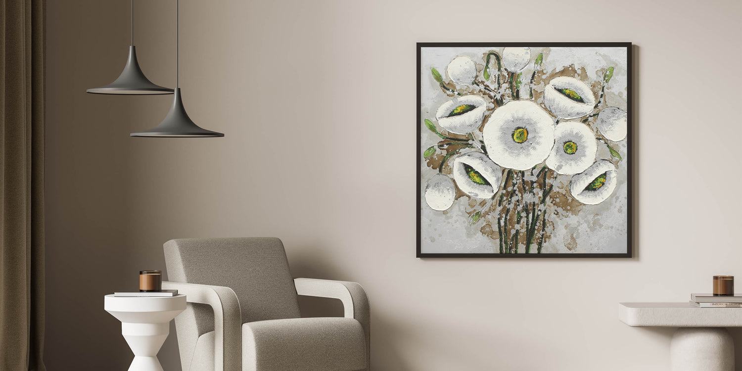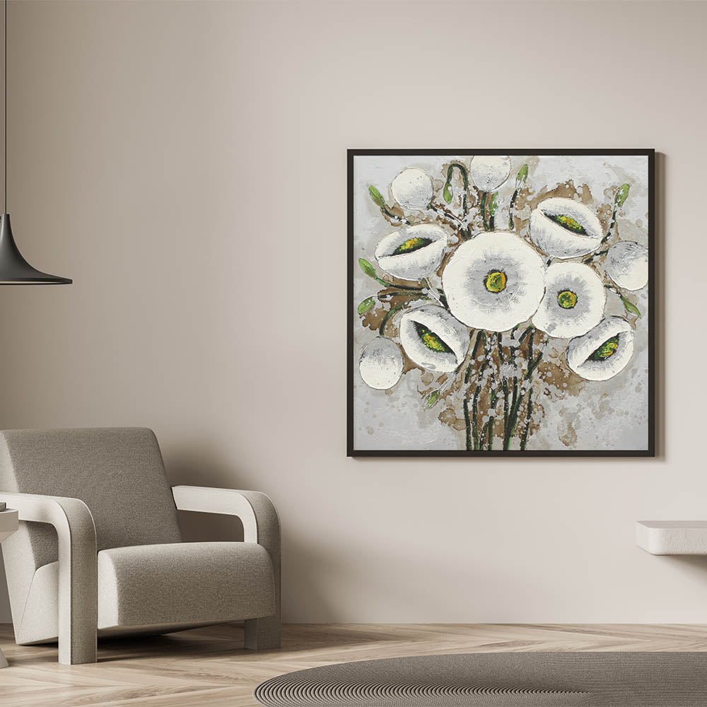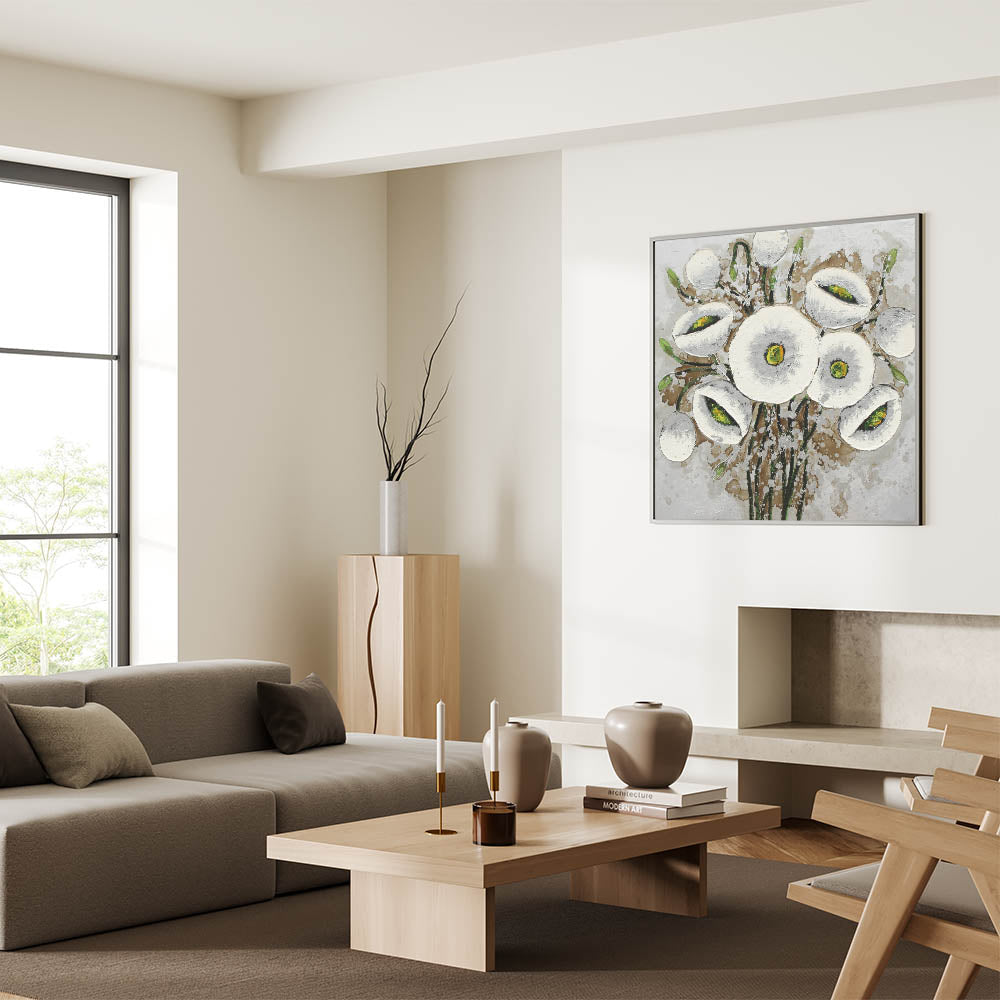 Enhance your space with the elegance of relaxing nature wall decor, featuring a beautiful floral composition in white, beige, and green tones. This textured painting brings a soft, organic touch to any interior, evoking a sense of serene landscape artwork that brightens up living rooms, bedrooms, and offices.