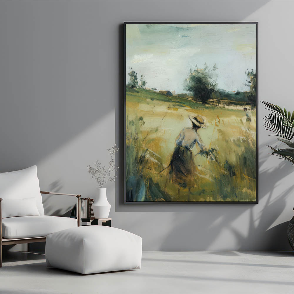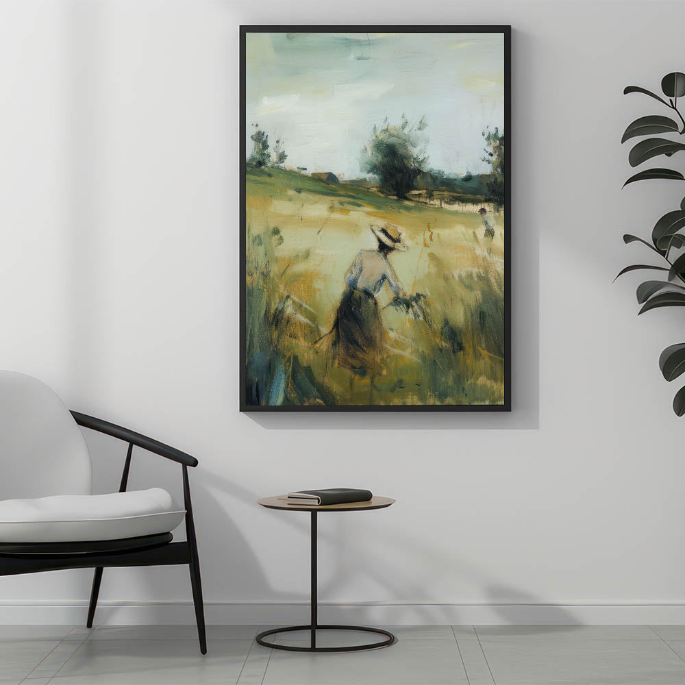 Celebrate the charm of rural life with this countryside harvest landscape canvas print. Depicting a serene farming scene with muted green and golden tones, this artwork captures the essence of rustic living. The soft brushstrokes and natural palette create a calming and nostalgic atmosphere, making it an ideal addition to farmhouse or vintage-inspired interiors.