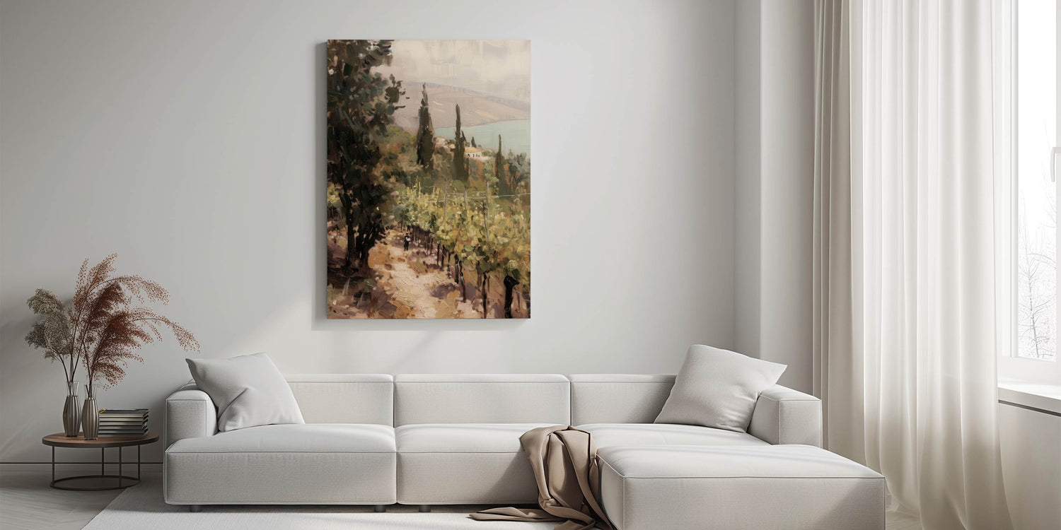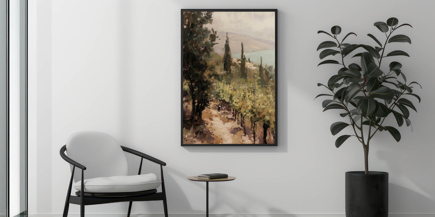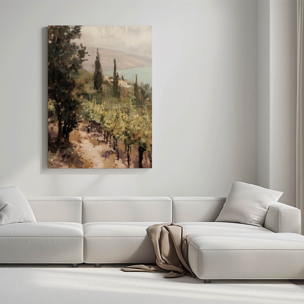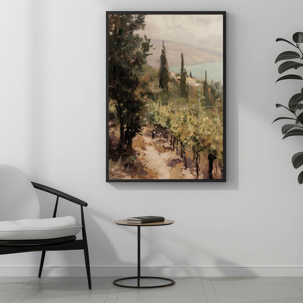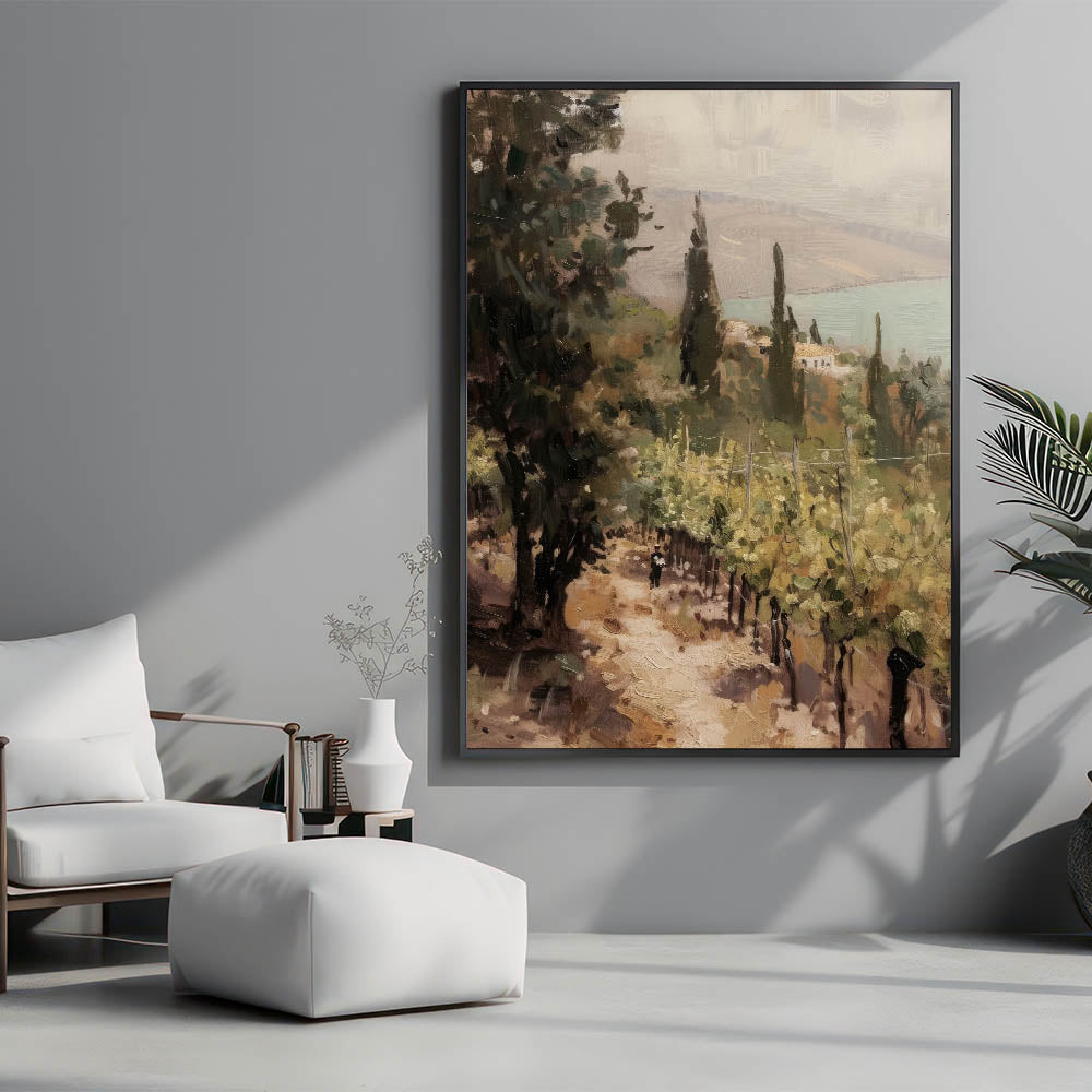 This vineyard landscape art adds warmth and character to any room, creating a connection to nature's beauty and simplicity. Its detailed composition and harmonious colors make it a timeless addition to your decor, whether as a centerpiece or part of a gallery wall.