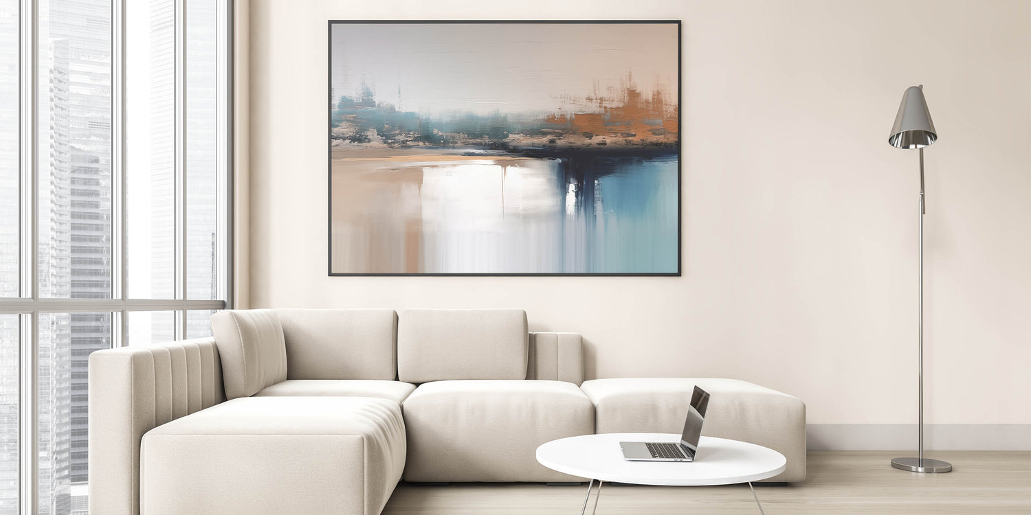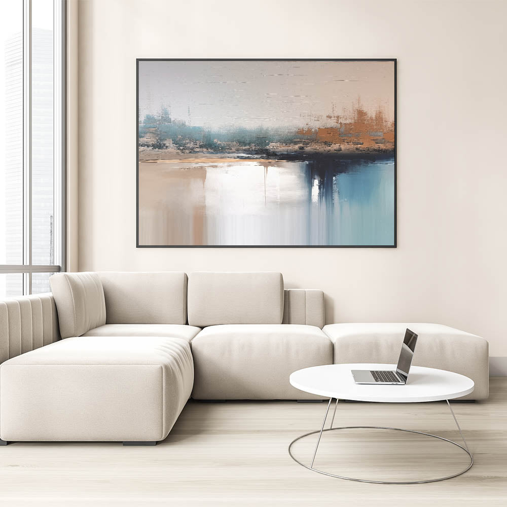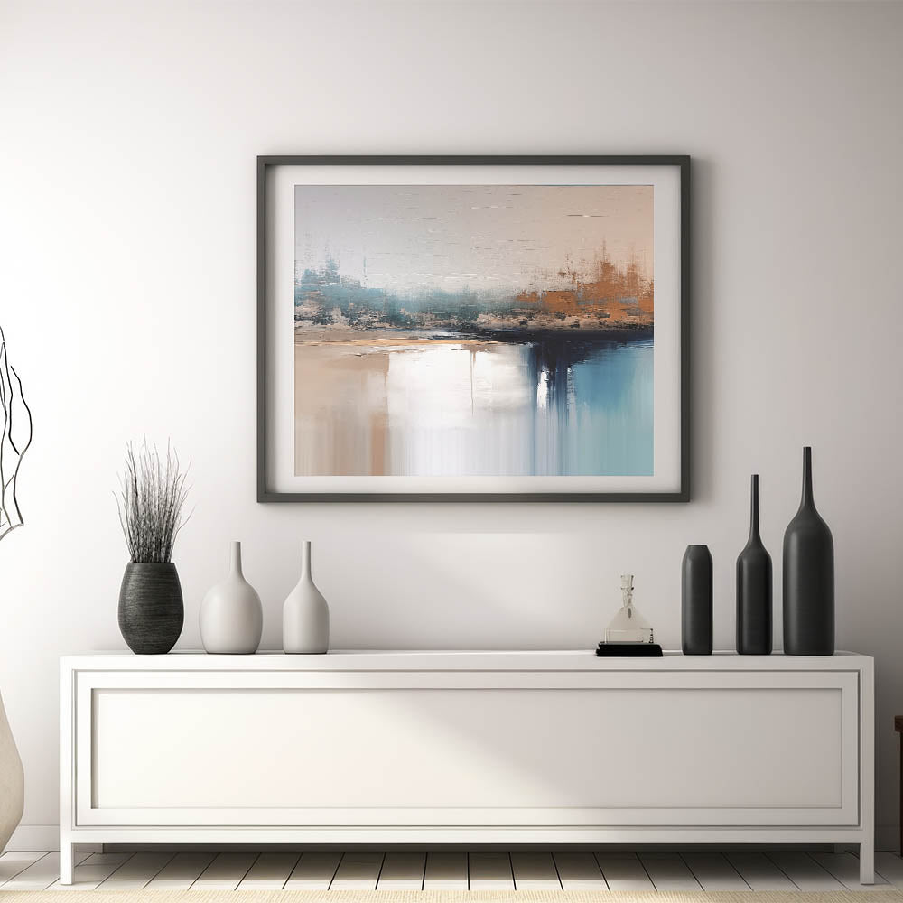 Create a tranquil ambiance in your home with this serene landscape artwork, featuring a harmonious blend of beige, teal, brown, and white. The soft brushstrokes and diffused edges evoke tranquil nature scenes, resembling a peaceful lakeside or misty horizon. This peaceful countryside print is perfect for adding warmth and sophistication to any space.