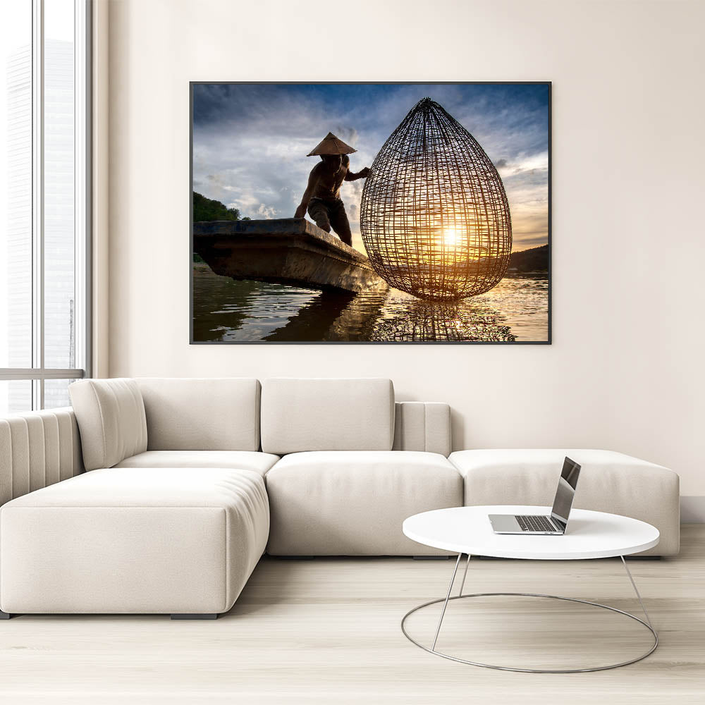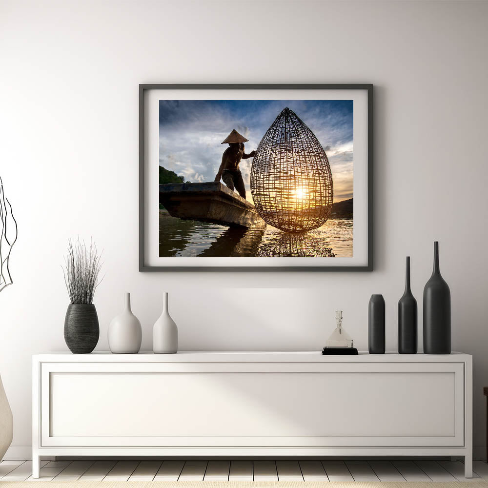 Capture the essence of traditional Laotian life with this Laos Art Photography, featuring a fisherman casting his silhouette against the backdrop of a dramatic sunset. The intricate structure of the woven fish trap, glowing in the fading light, adds a powerful visual element, highlighting both the beauty of the craft and the strength of the fisherman. This Laos Wall Art combines cultural heritage with nature's majesty, making it an ideal piece for those who appreciate art that tells a story.