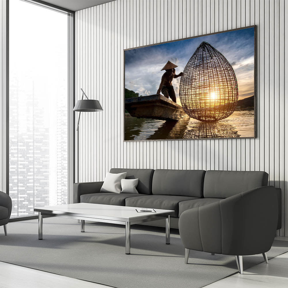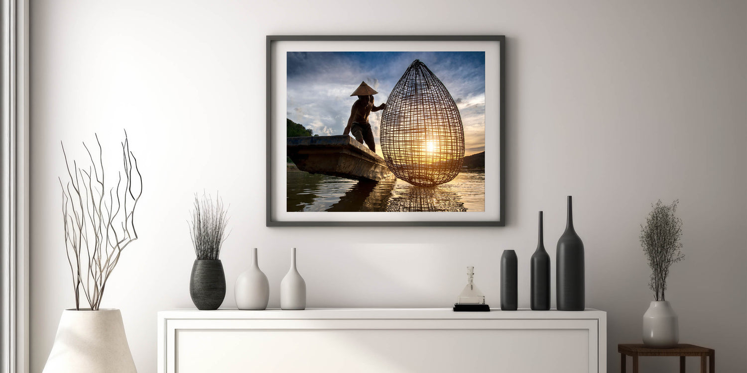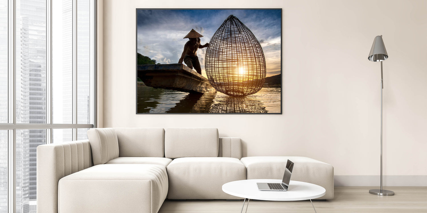 - High-definition photography prints capturing the intricate details of Laotian fishing traditions against a stunning sunset.