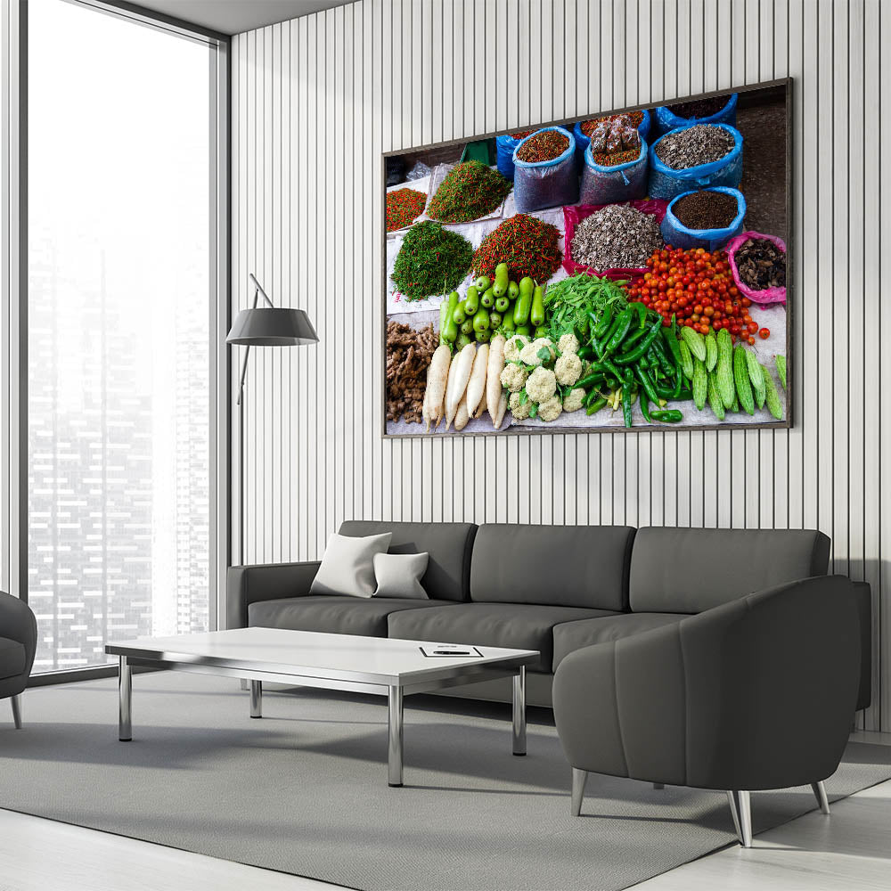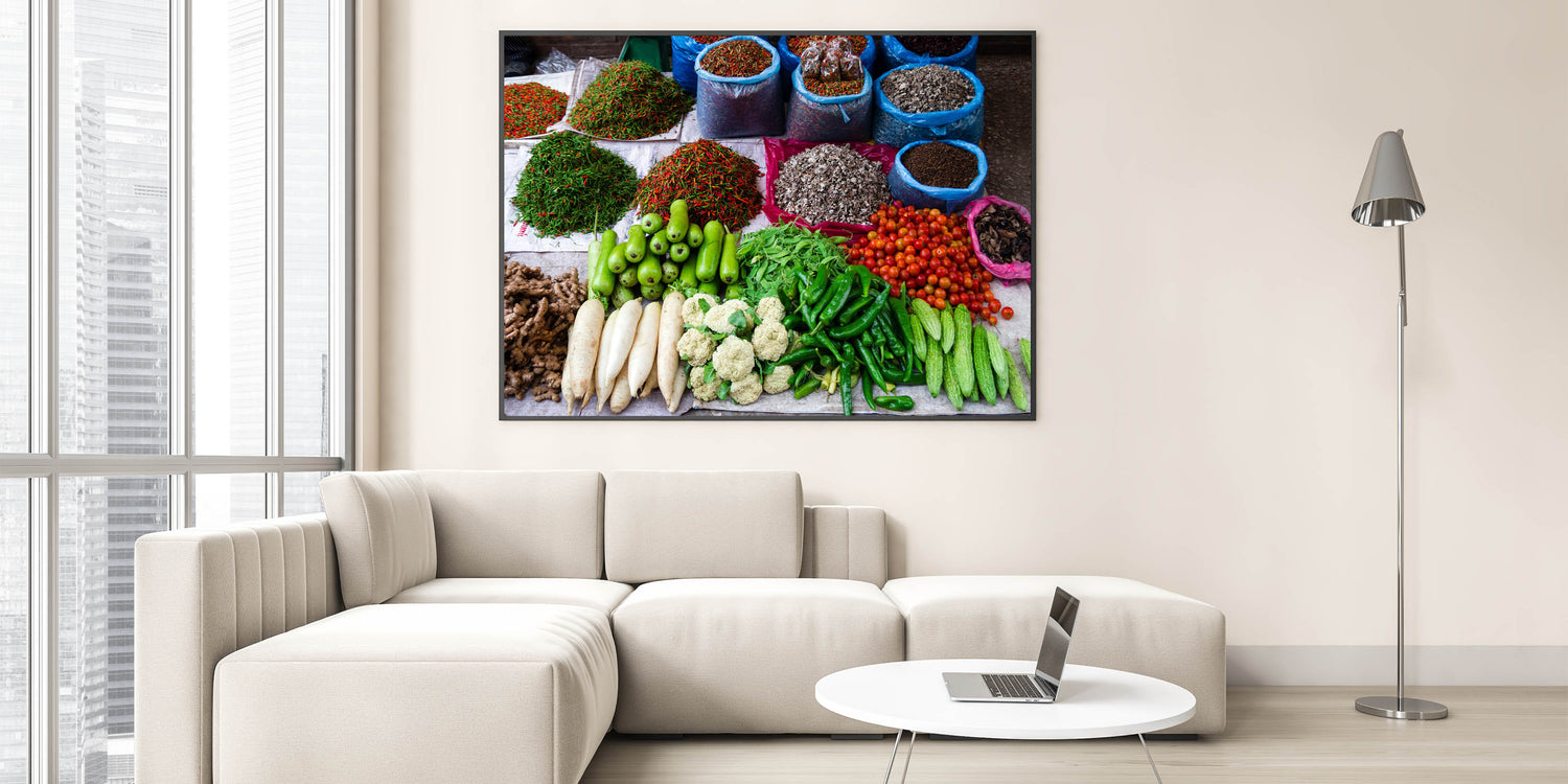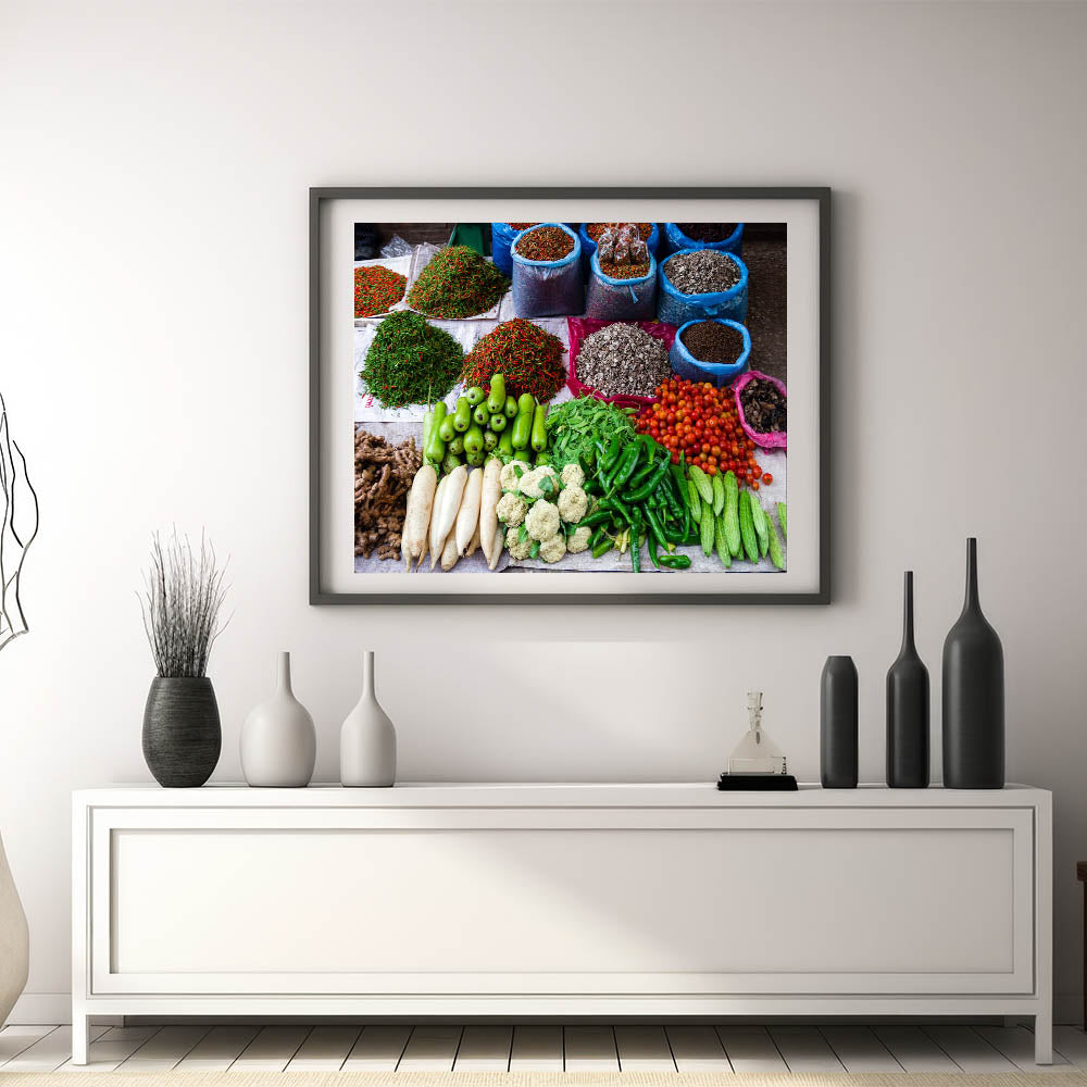 Experience the vibrant colors and rich textures of a traditional Laos market with this stunning photography print. Featuring an array of fresh vegetables, spices, and produce, this design beautifully captures the bustling and diverse nature of a local market scene. The vivid reds, greens, and earthy tones make this artwork a lively addition to any kitchen or dining space.
