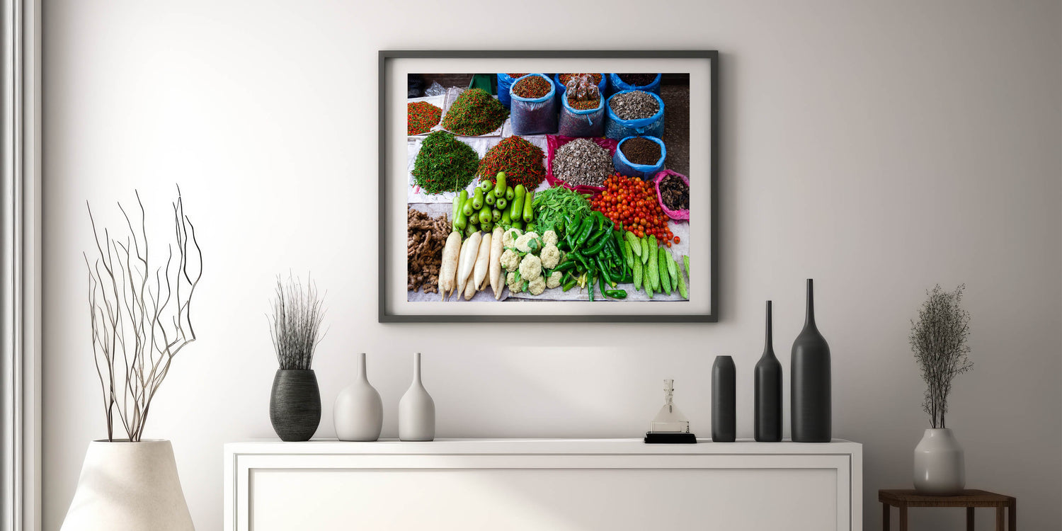 This lively photography print transports you to the heart of a Laos market, offering a colorful and authentic glimpse into daily life. Whether for a home kitchen, restaurant, or office, this artwork adds warmth and cultural depth to any setting.