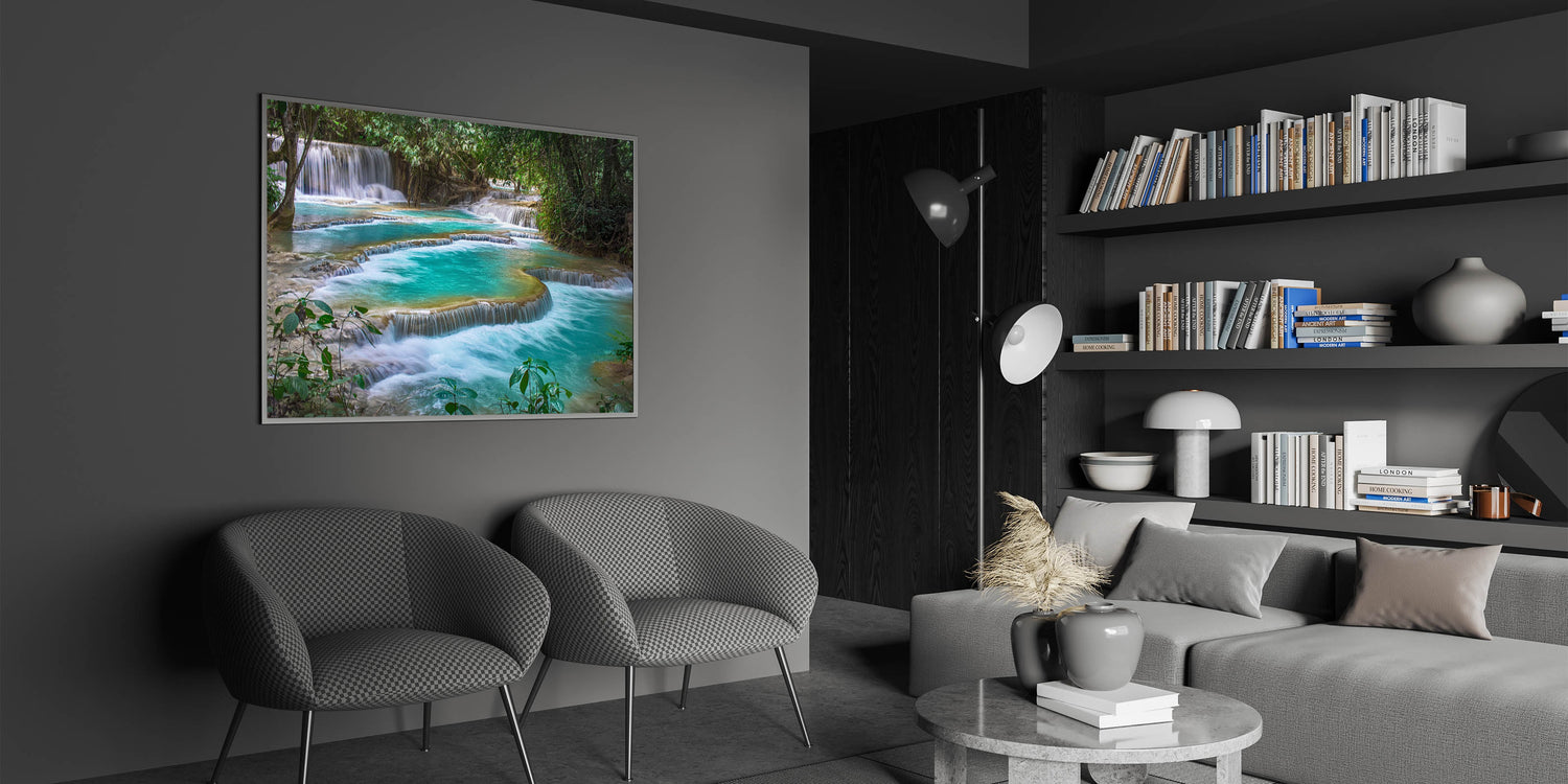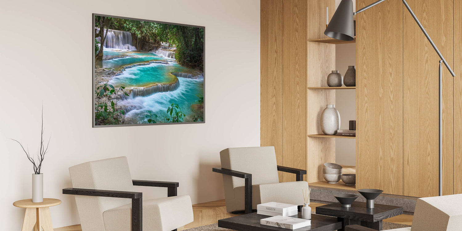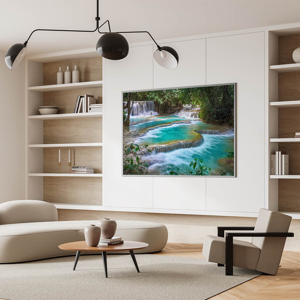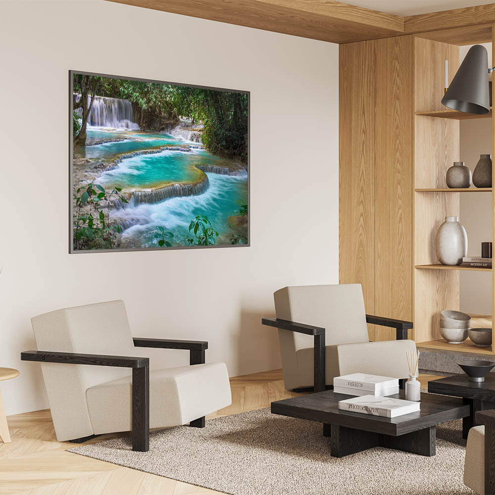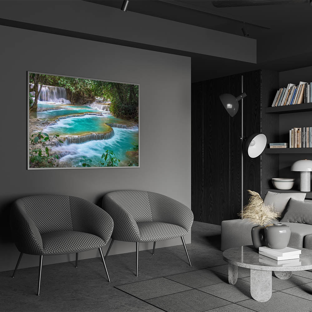 Immerse yourself in the tranquil beauty of nature with this Laos Wall Art, featuring the cascading turquoise waters of a serene waterfall surrounded by lush greenery. This breathtaking scene captures the peaceful essence of Laos' natural landscapes, making it the perfect addition to any space that could benefit from a touch of calm and relaxation. The intricate layers of water flowing over natural stone terraces create a visually captivating effect that transports you to the heart of Laos' wilderness.