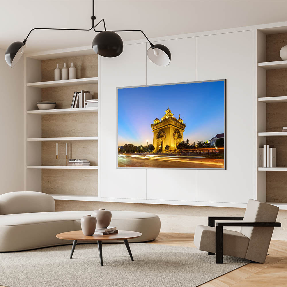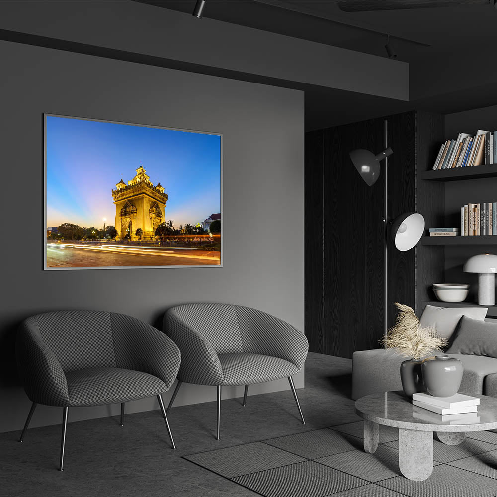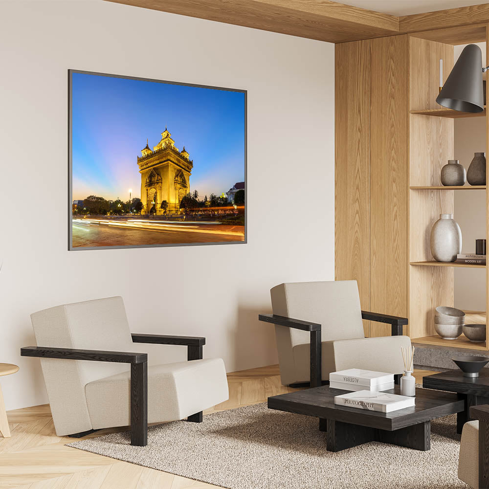 Celebrate the rich history and architectural beauty of Laos with this Laos Wall Art featuring the iconic Patuxai Monument at dusk. Bathed in a golden glow, this stunning structure stands tall against the soft gradient of the evening sky, showcasing its intricate details and cultural significance. Known as the "Victory Gate," the Patuxai Monument is a symbol of Laotian pride and resilience, making it a meaningful addition to any space that values cultural heritage and timeless architecture.
