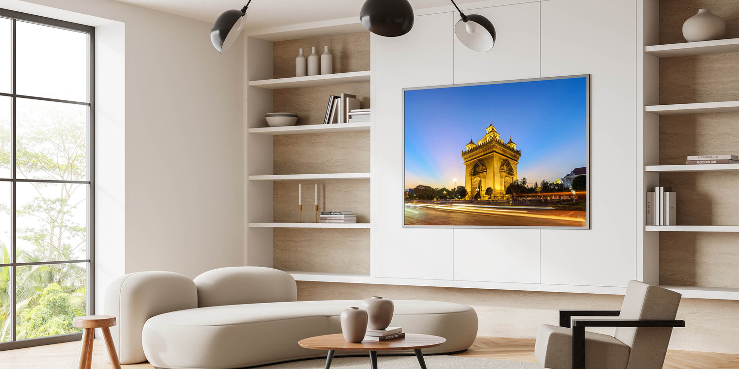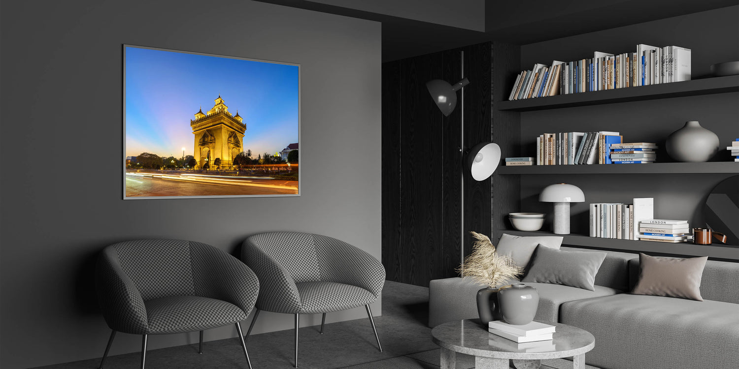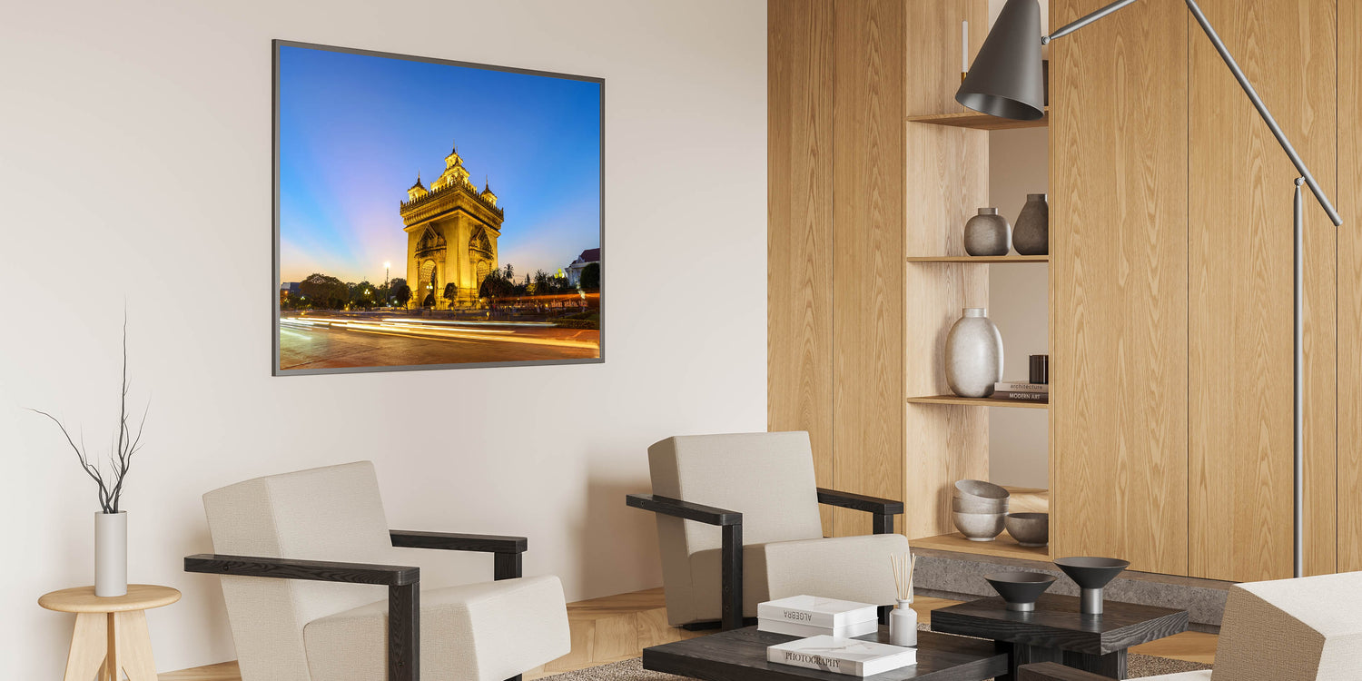 Celebrate the rich history and architectural beauty of Laos with this Laos Wall Art featuring the iconic Patuxai Monument at dusk. Bathed in a golden glow, this stunning structure stands tall against the soft gradient of the evening sky, showcasing its intricate details and cultural significance. Known as the "Victory Gate," the Patuxai Monument is a symbol of Laotian pride and resilience, making it a meaningful addition to any space that values cultural heritage and timeless architecture.