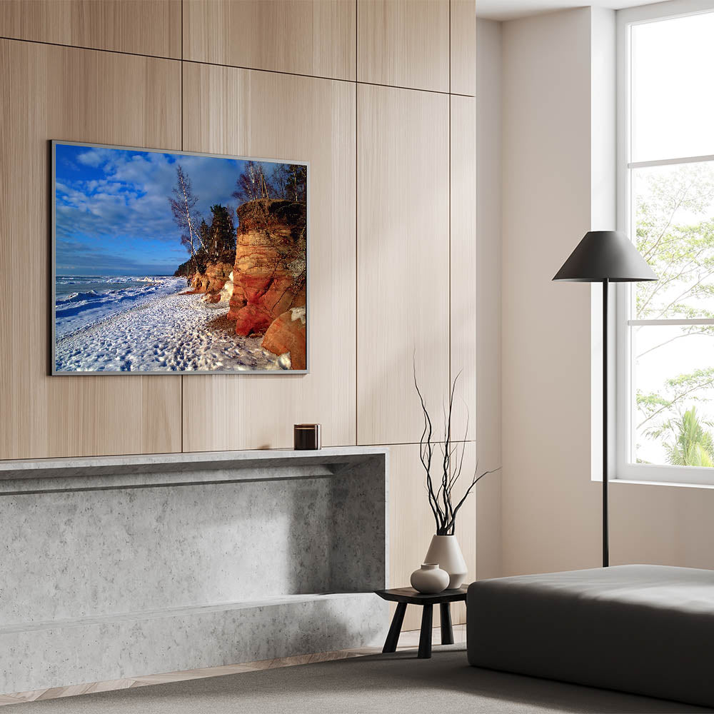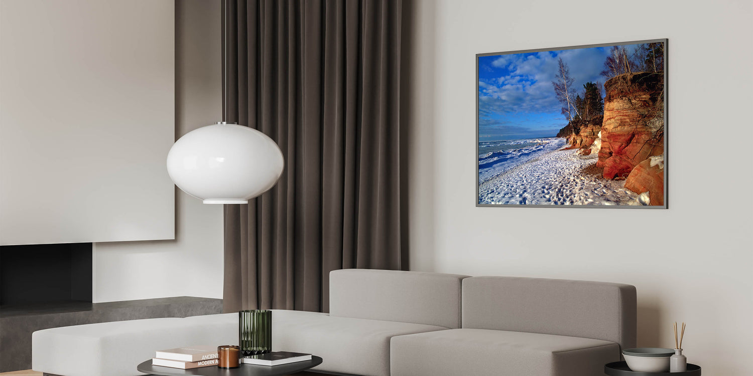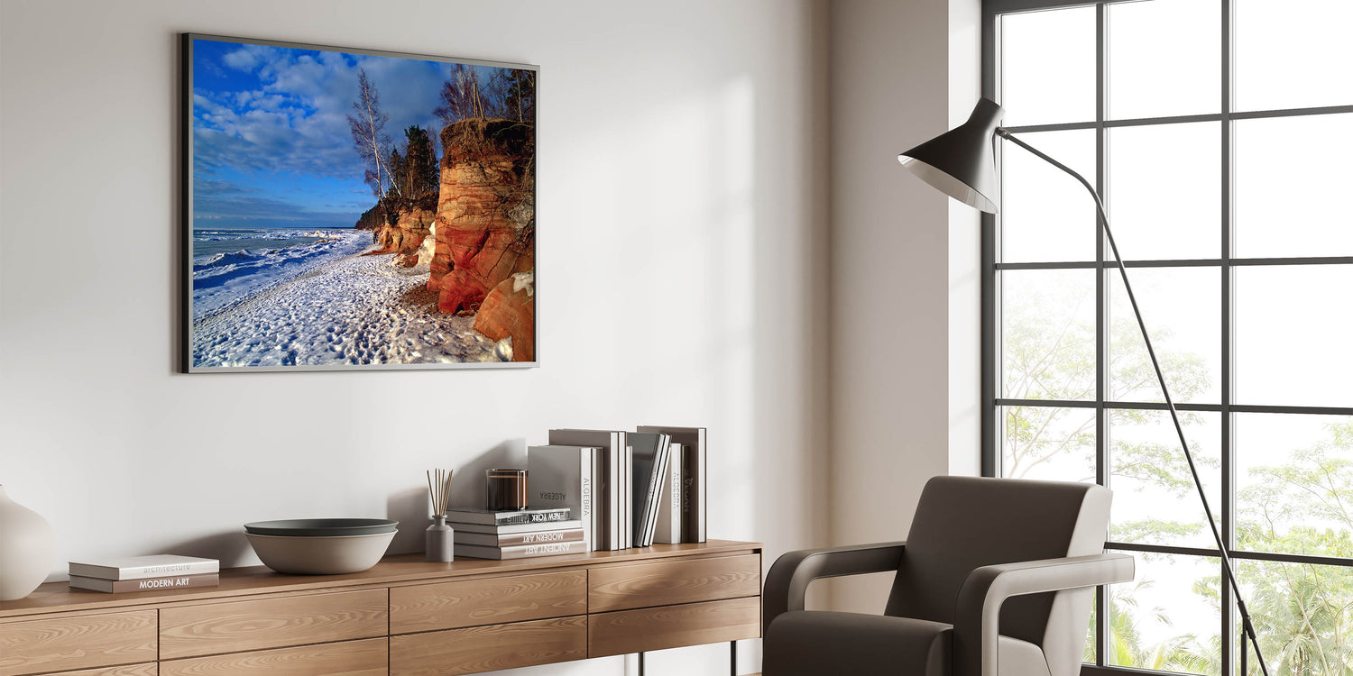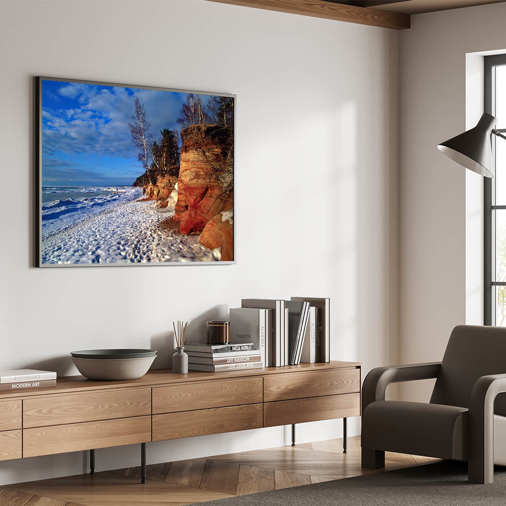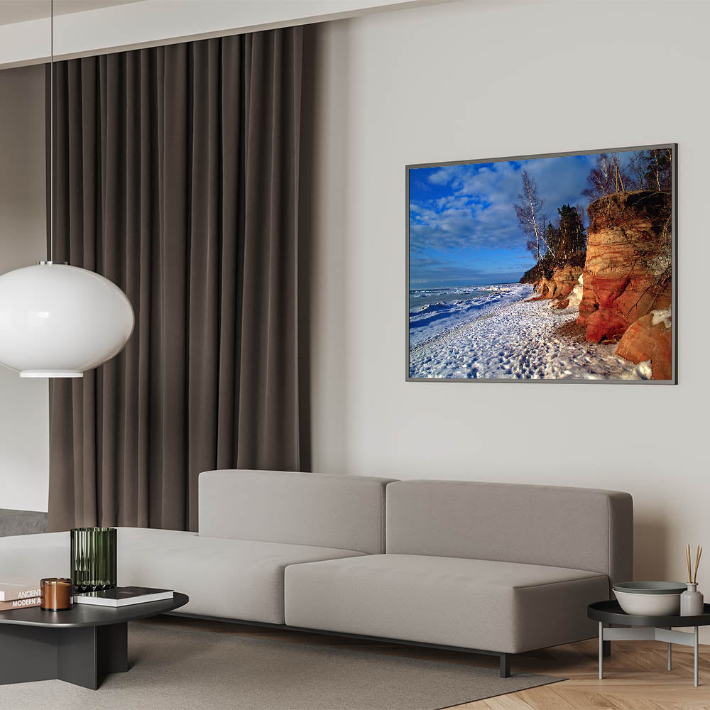 Immerse yourself in the rugged beauty of the Baltic region with this stunning piece of Baltic region wall decor. This artwork captures a wintery scene of rocky cliffs and snow-dusted beach, highlighting the natural contrast between the earthy cliffs and the icy coastline. Perfect for those who appreciate Latvian scenery prints, this piece brings the raw beauty of the Baltic coastline into your home.