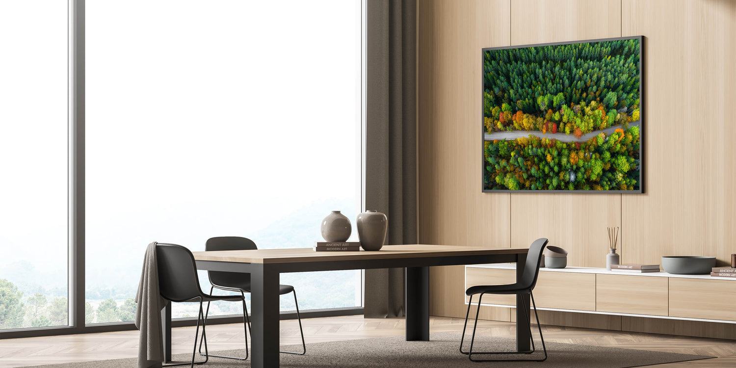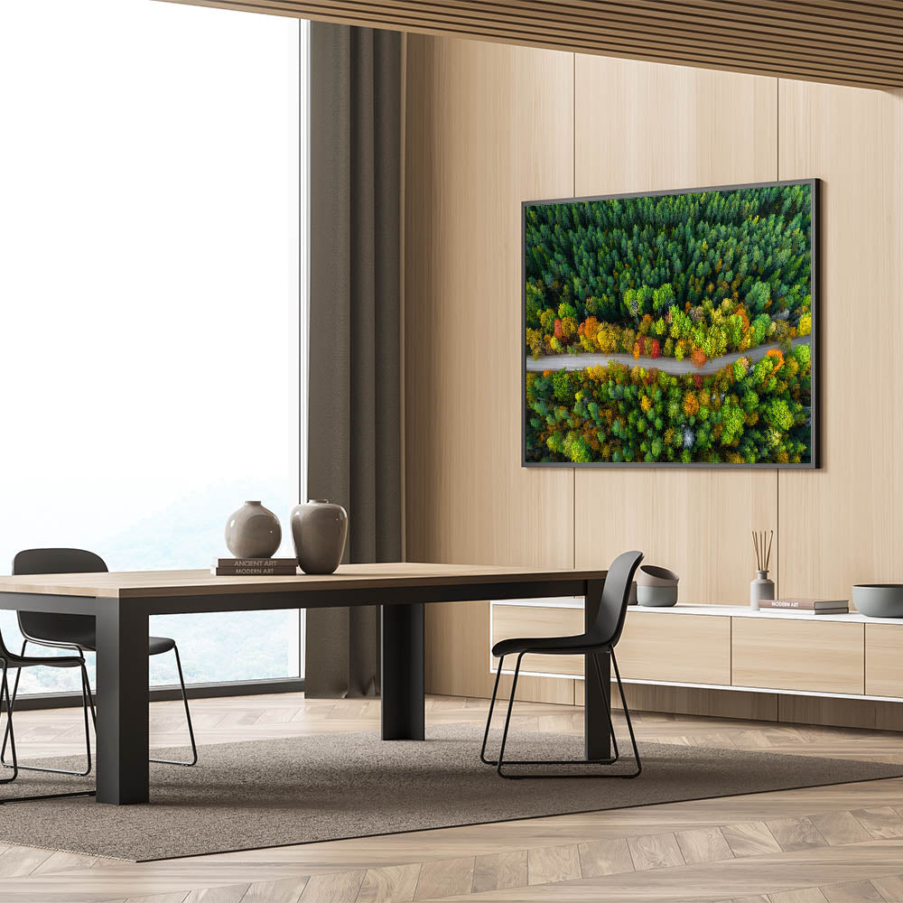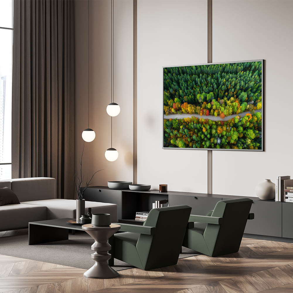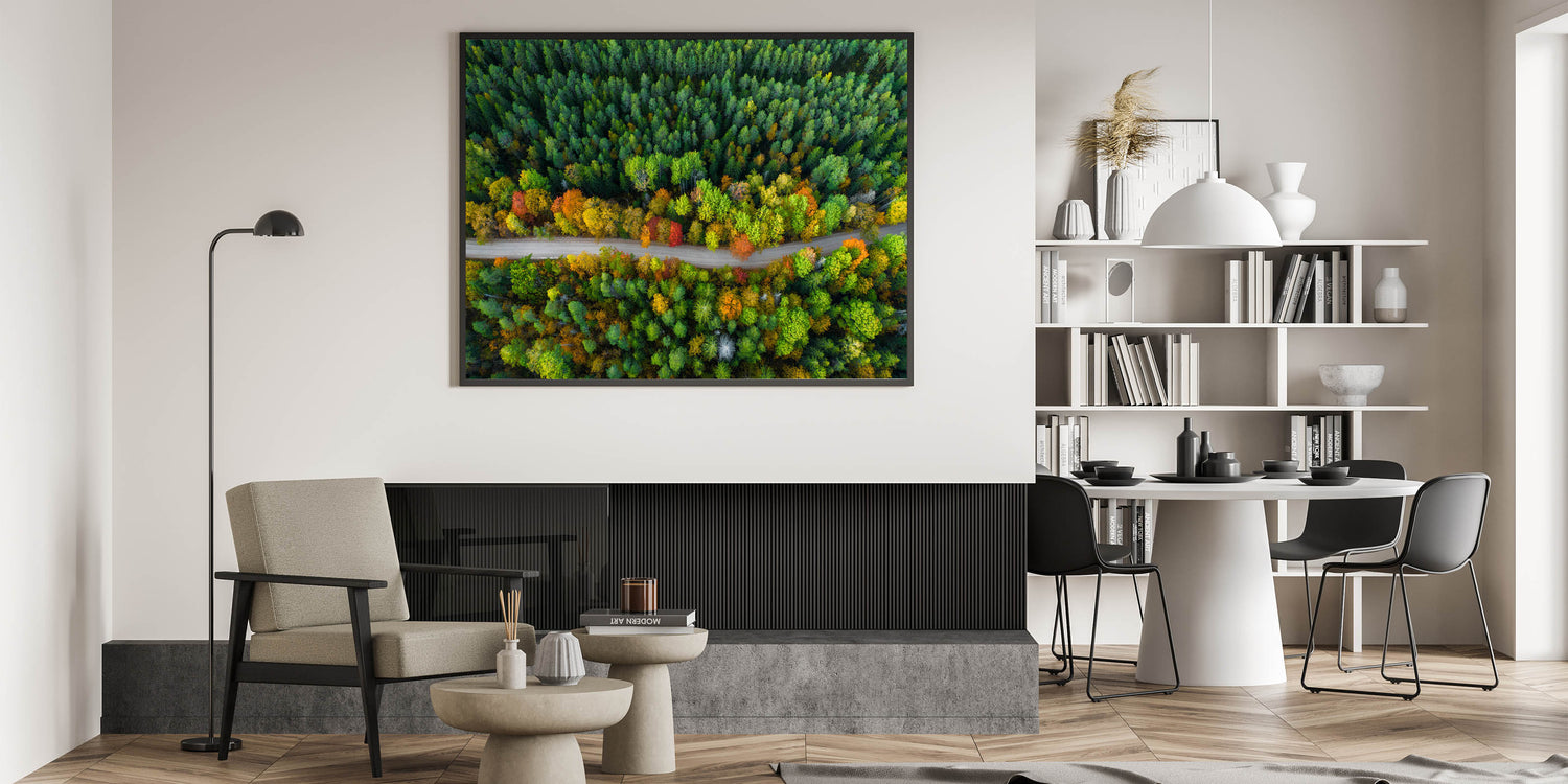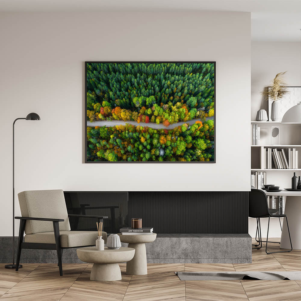 This beautiful aerial shot captures the essence of Latvia’s autumn landscape, with a colorful forest contrasting a quiet rural road. The vibrant colors of autumn leaves, mixed with rich evergreen trees, offer a stunning view of the Baltic region’s natural beauty. Perfect for adding a touch of the outdoors to your living or office space, this unique Latvian landscape art brings nature’s harmony into your home.