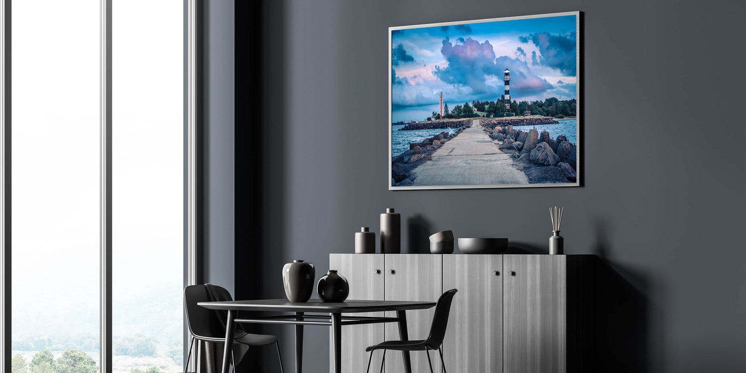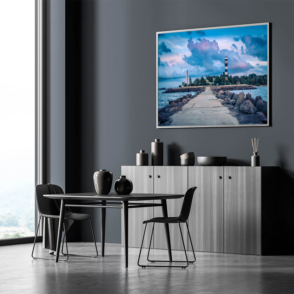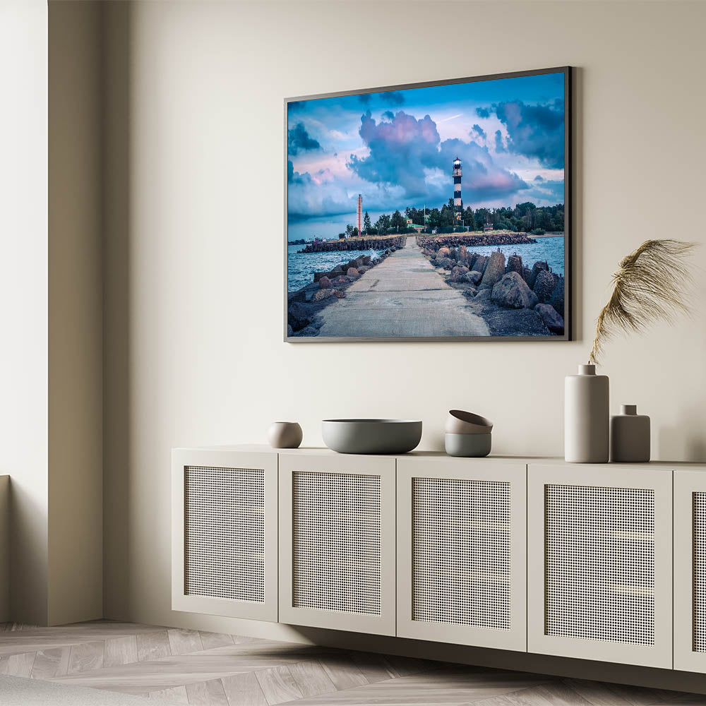 This captivating Latvia scenery print features a dramatic lighthouse standing tall against the backdrop of the Baltic Sea. The deep blues of the sea and sky are contrasted by the strong, architectural lines of the lighthouse and the concrete pier leading out to the water. This stunning piece of European scenery wall art will add a coastal charm and a sense of adventure to any space.