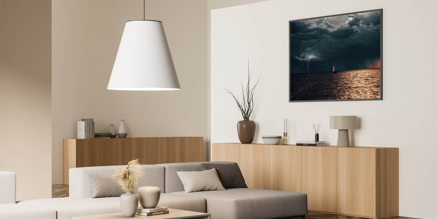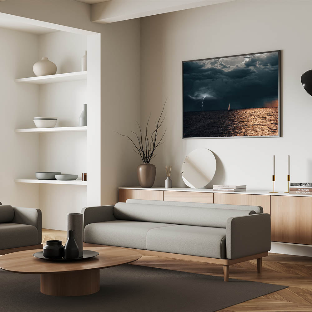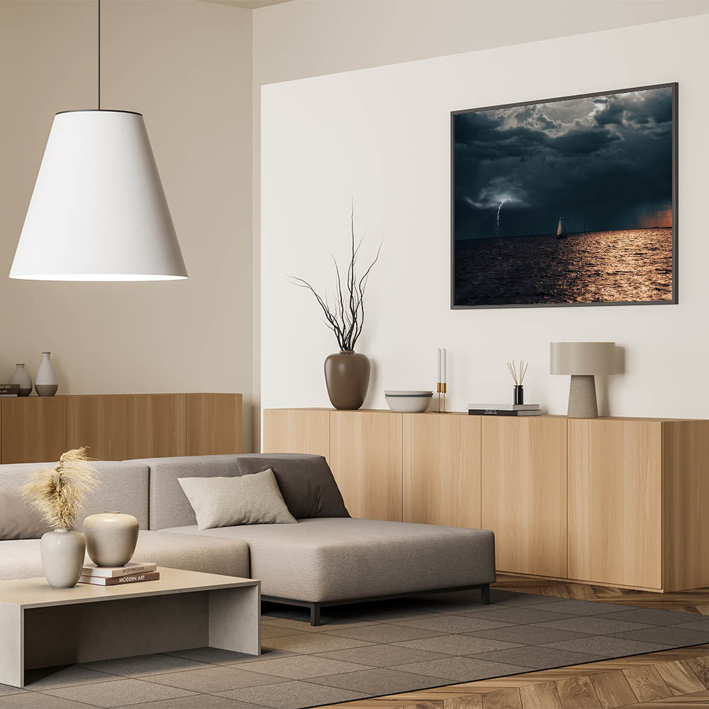 This stunning wall art captures the raw power of nature with a dramatic scene of a sailboat navigating through a stormy sea as lightning strikes in the distance. The dark, brooding clouds contrast with the illuminated water, creating a captivating visual that is both peaceful and intense. Perfect for those who appreciate the beauty of the sea and the untamed forces of nature, this Latvia scenery print brings the energy and mystery of the Baltic coast into your space.