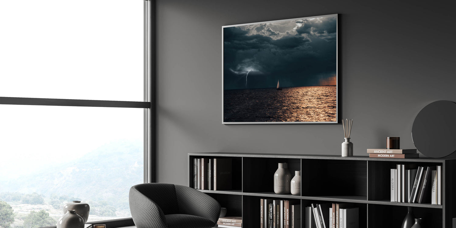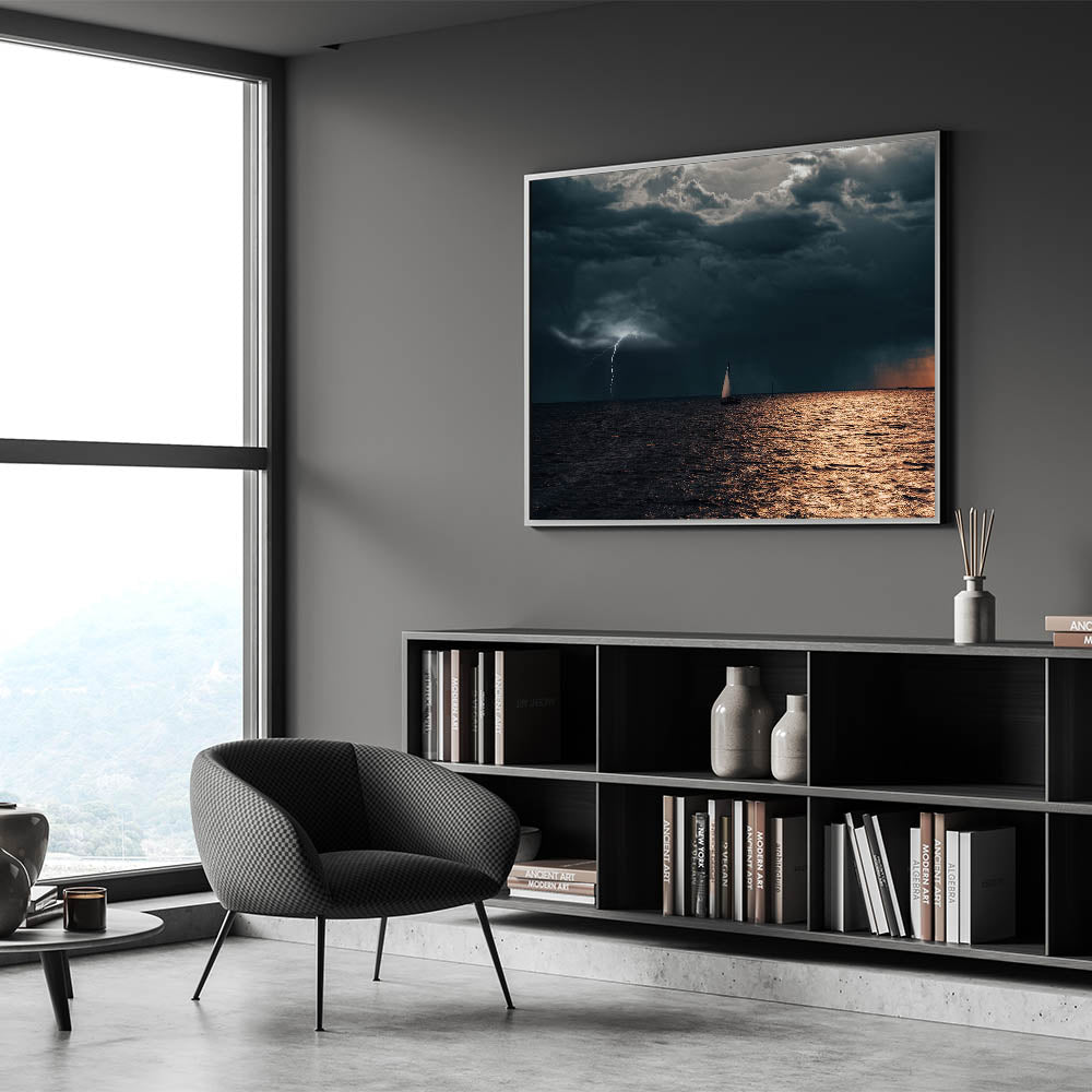 - Unique Design: Captivating Latvia wall art featuring a sailboat in a stormy sea, highlighted by a powerful lightning strike.