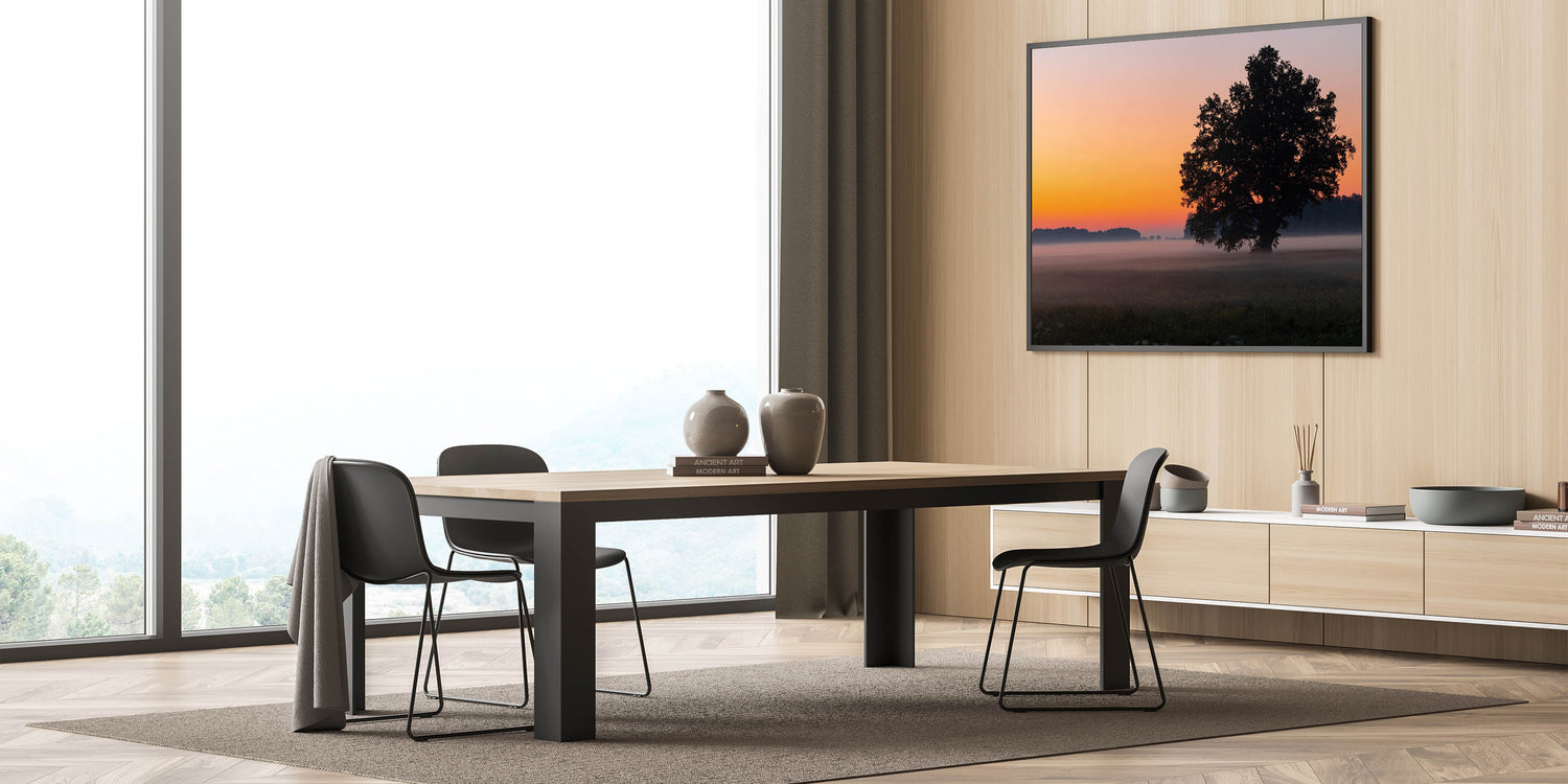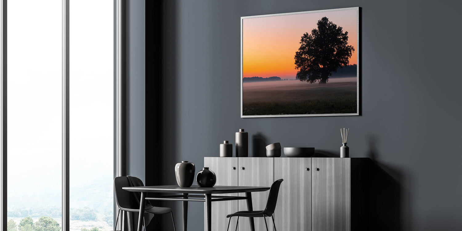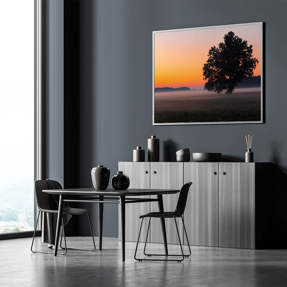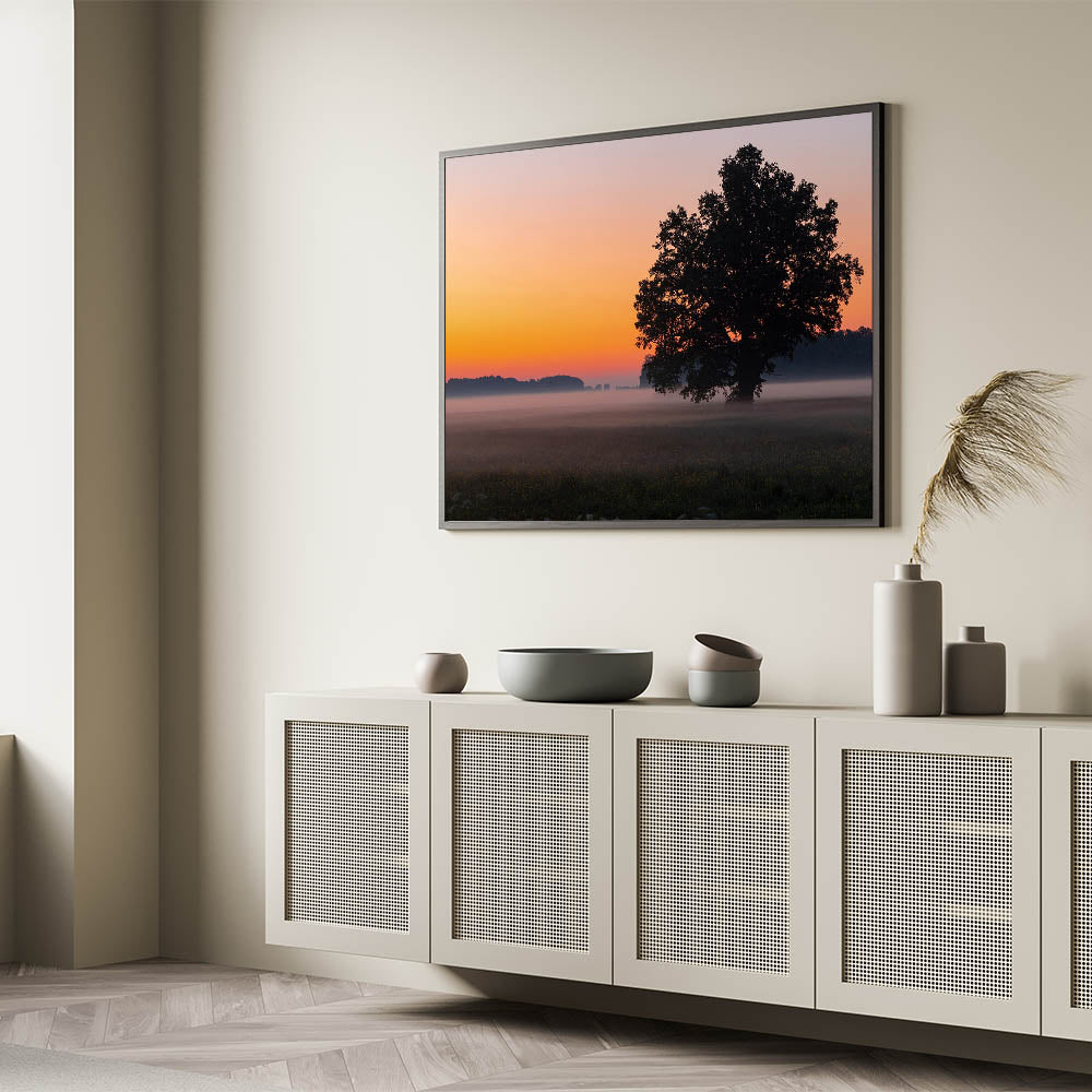 - Unique Design: Stunning Latvia landscape art featuring a tree silhouette set against a glowing sunset.