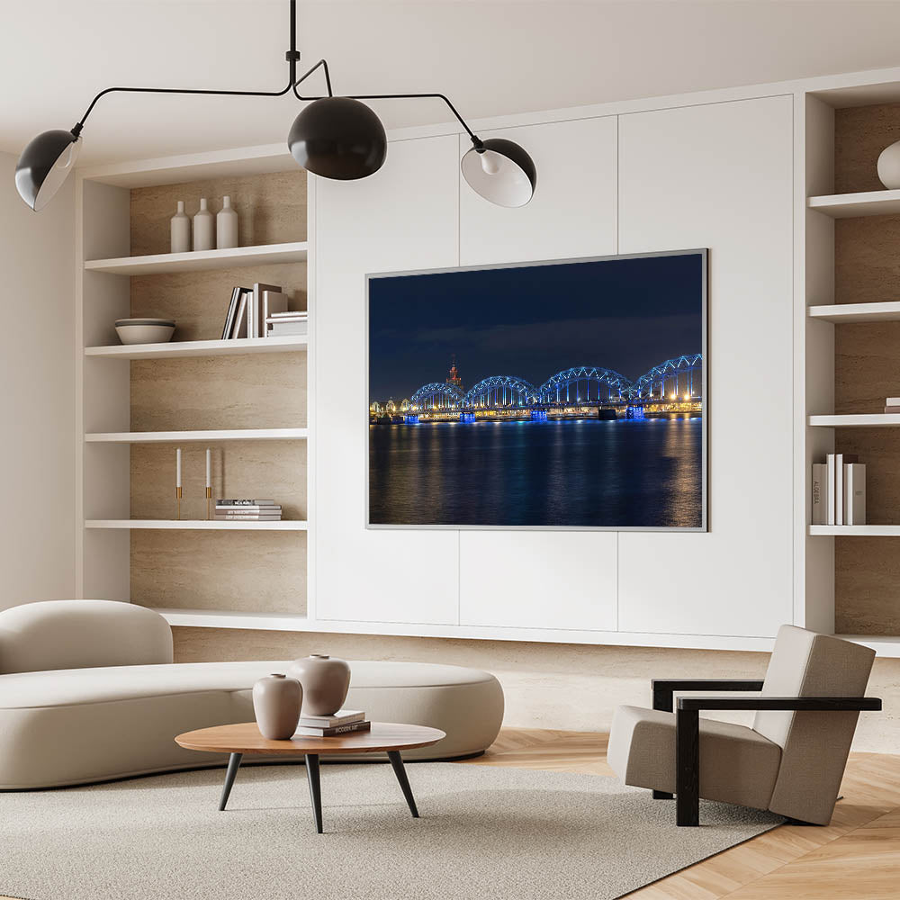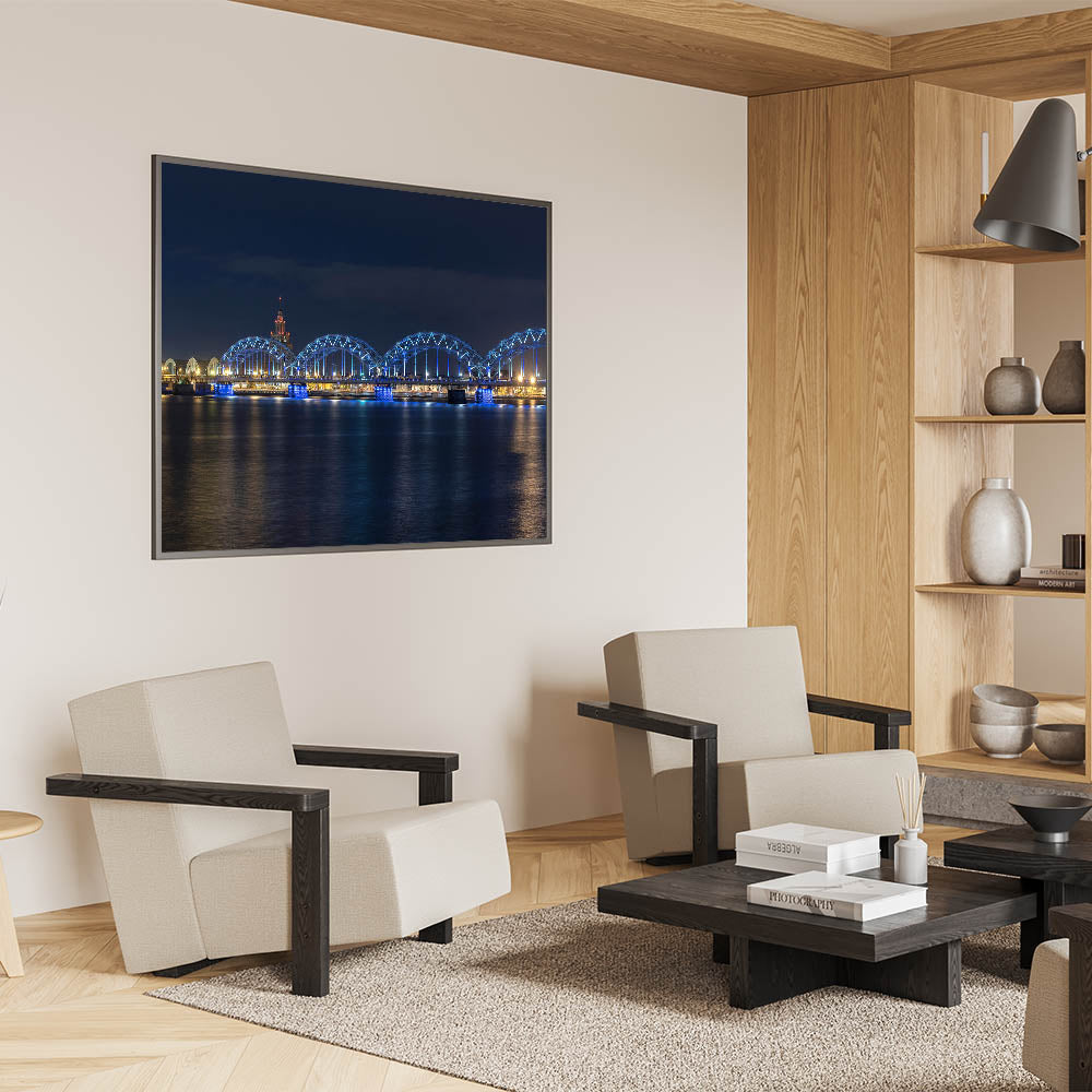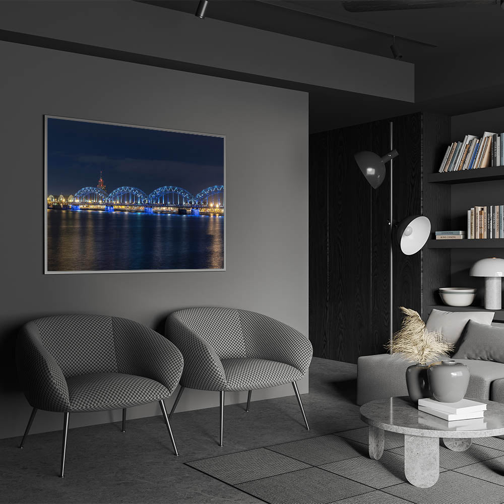 • Showcases high-quality Latvia prints of the illuminated railway bridge in Riga.