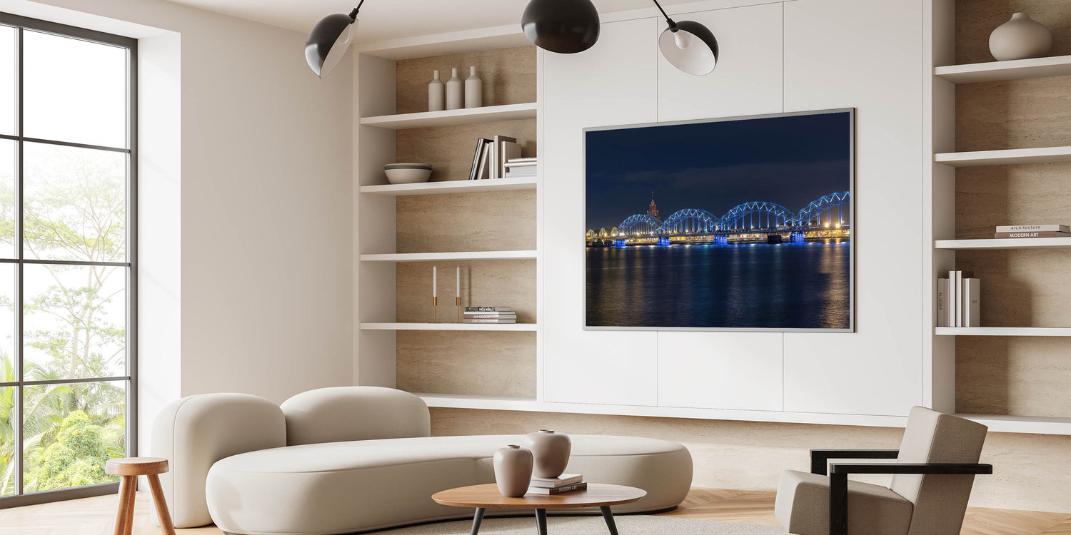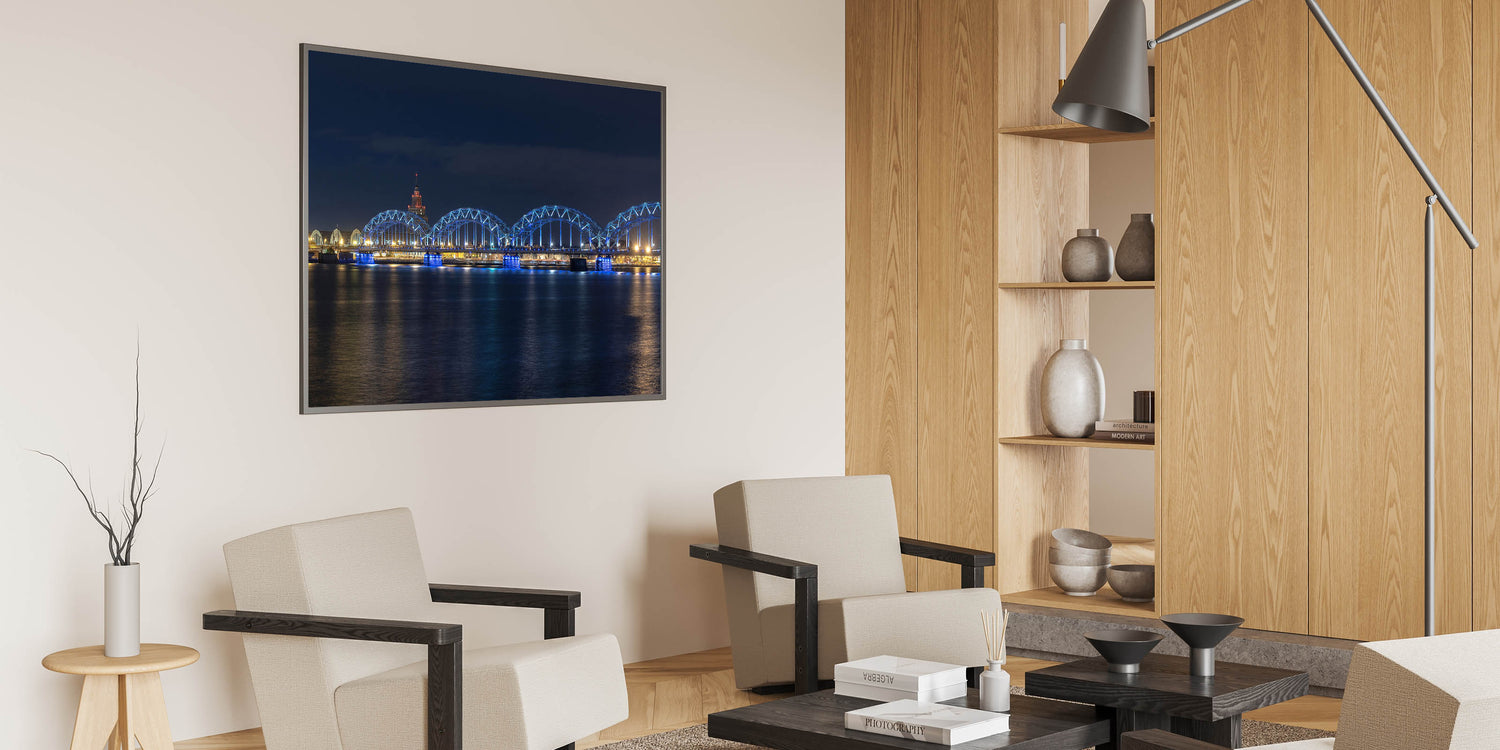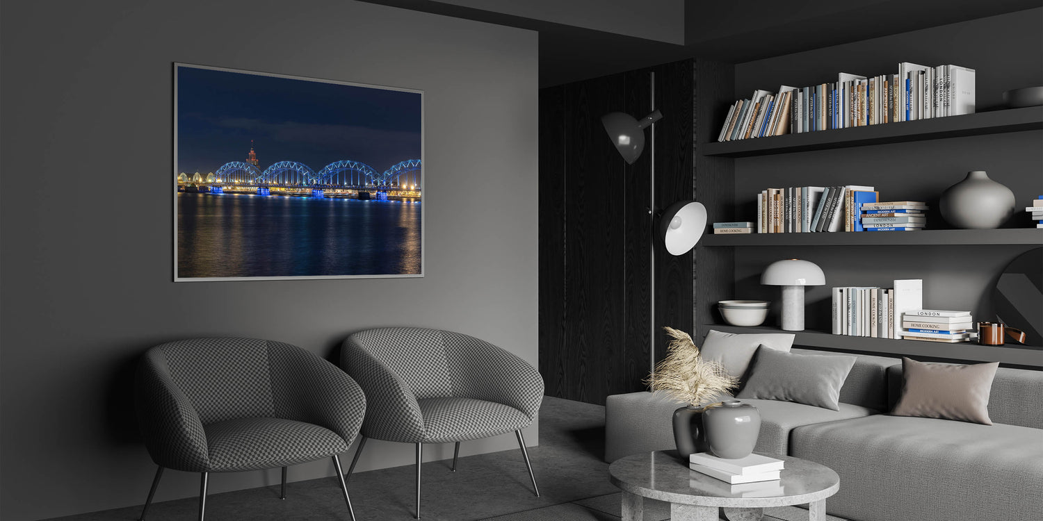 • Showcases high-quality Latvia prints of the illuminated railway bridge in Riga.