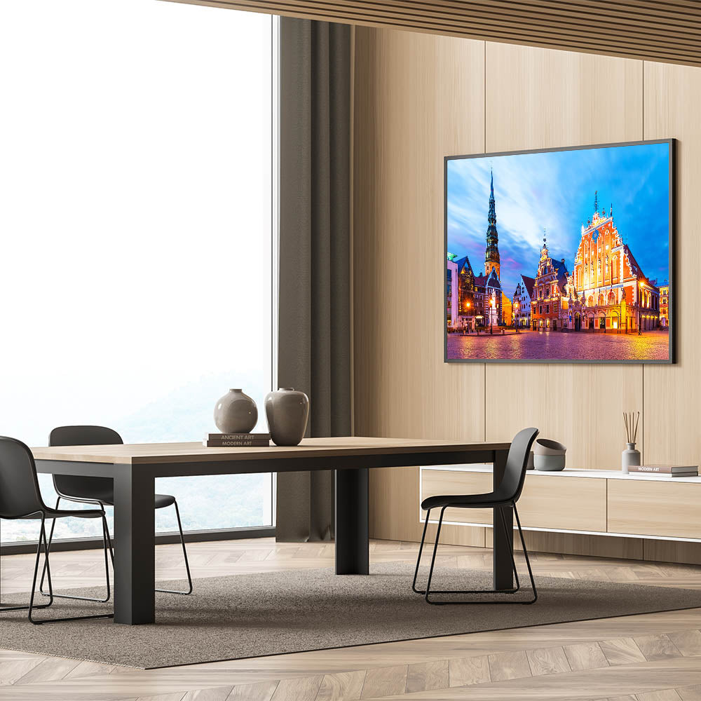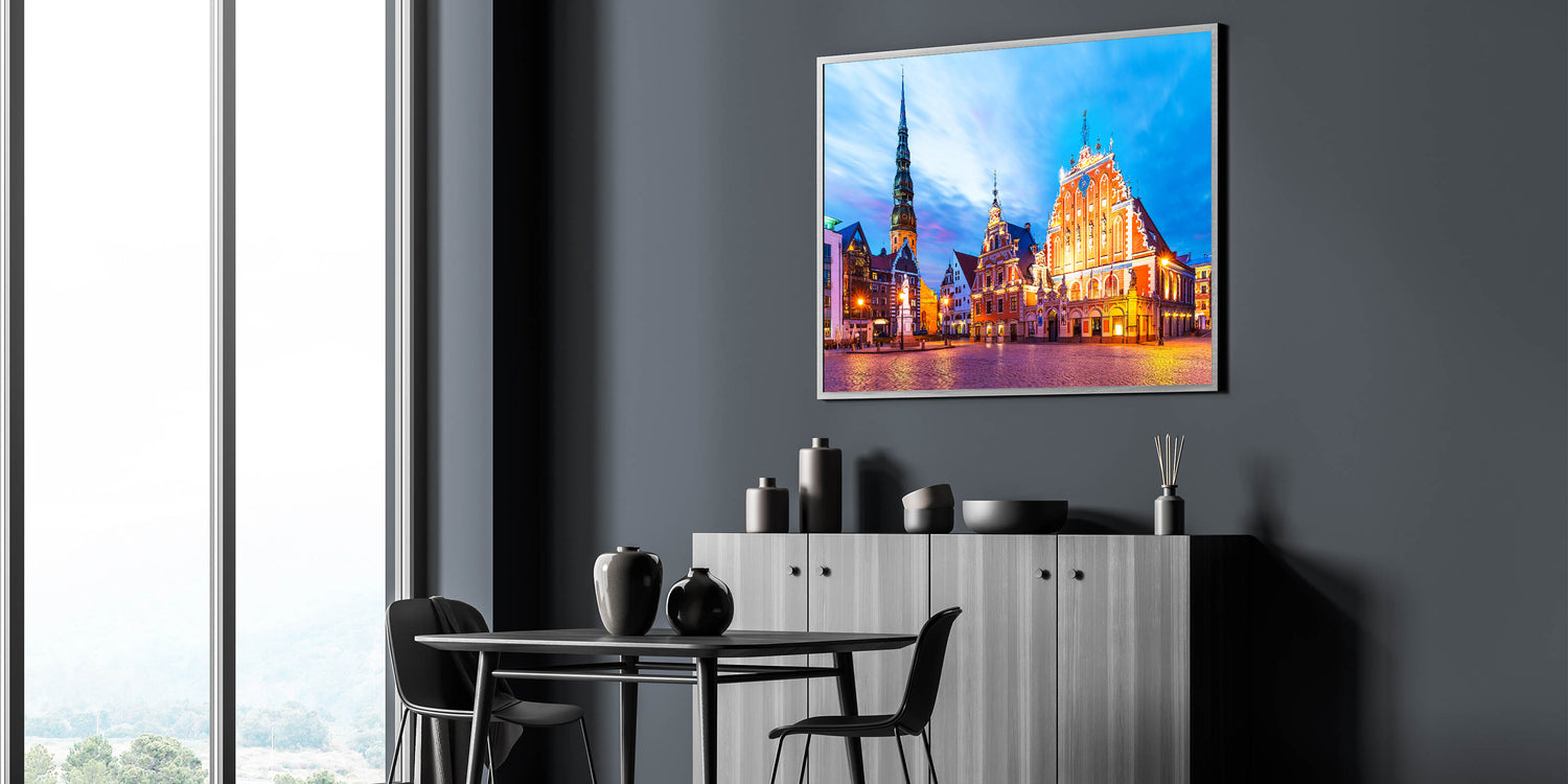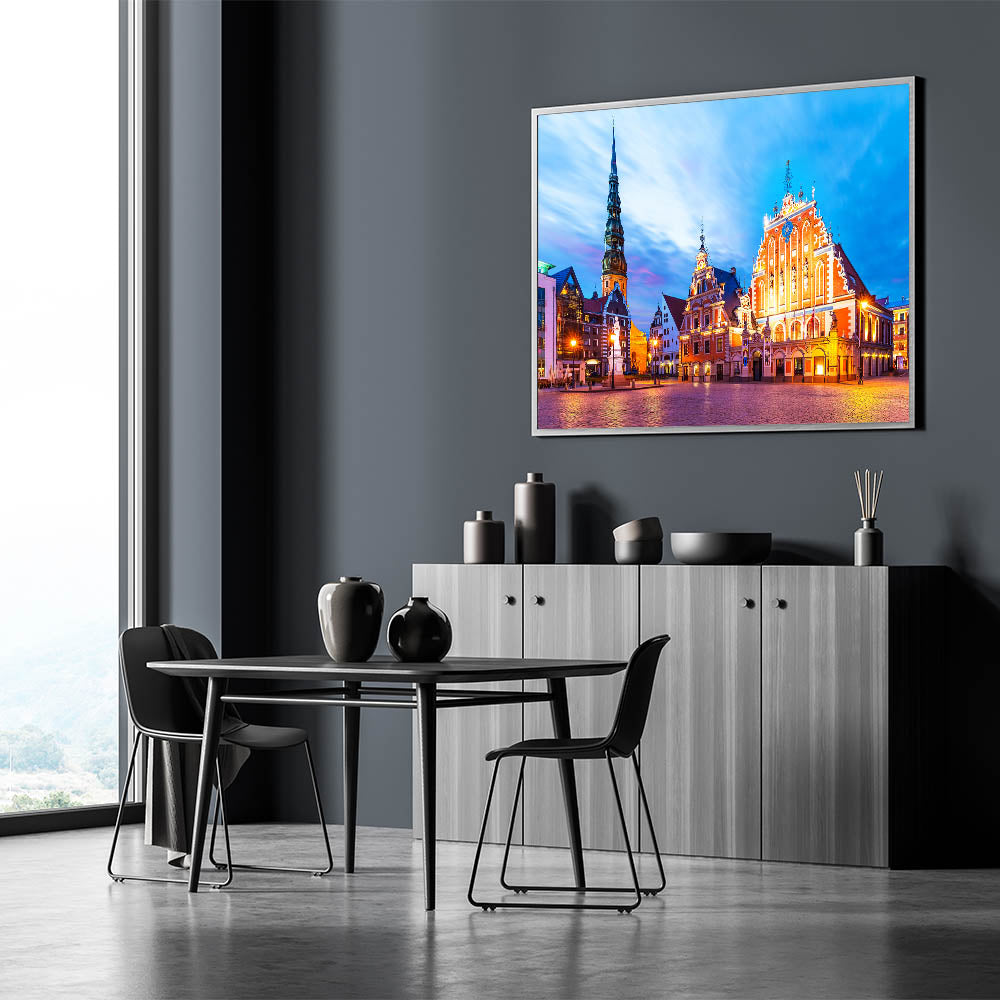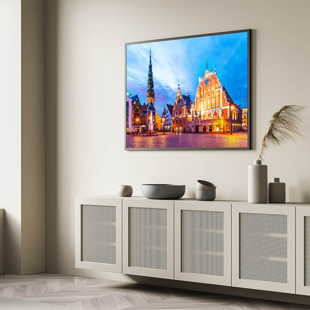 • Displays high-quality Latvia prints featuring Riga’s famous Old Town at twilight.