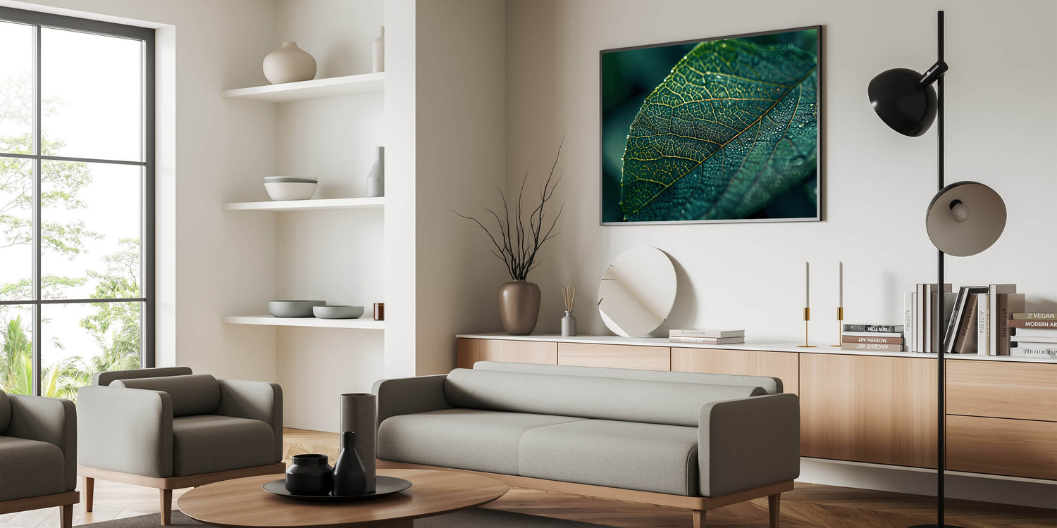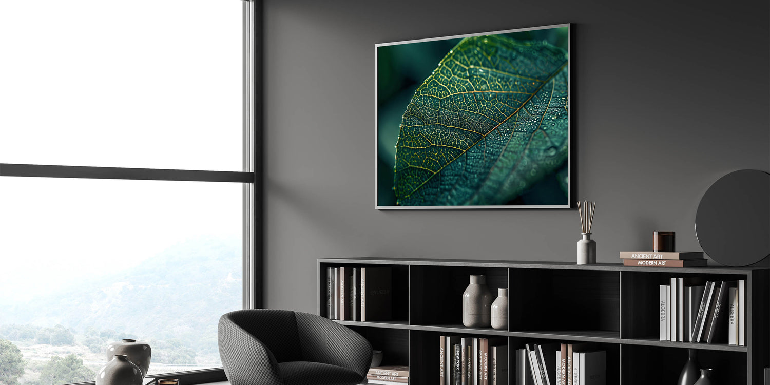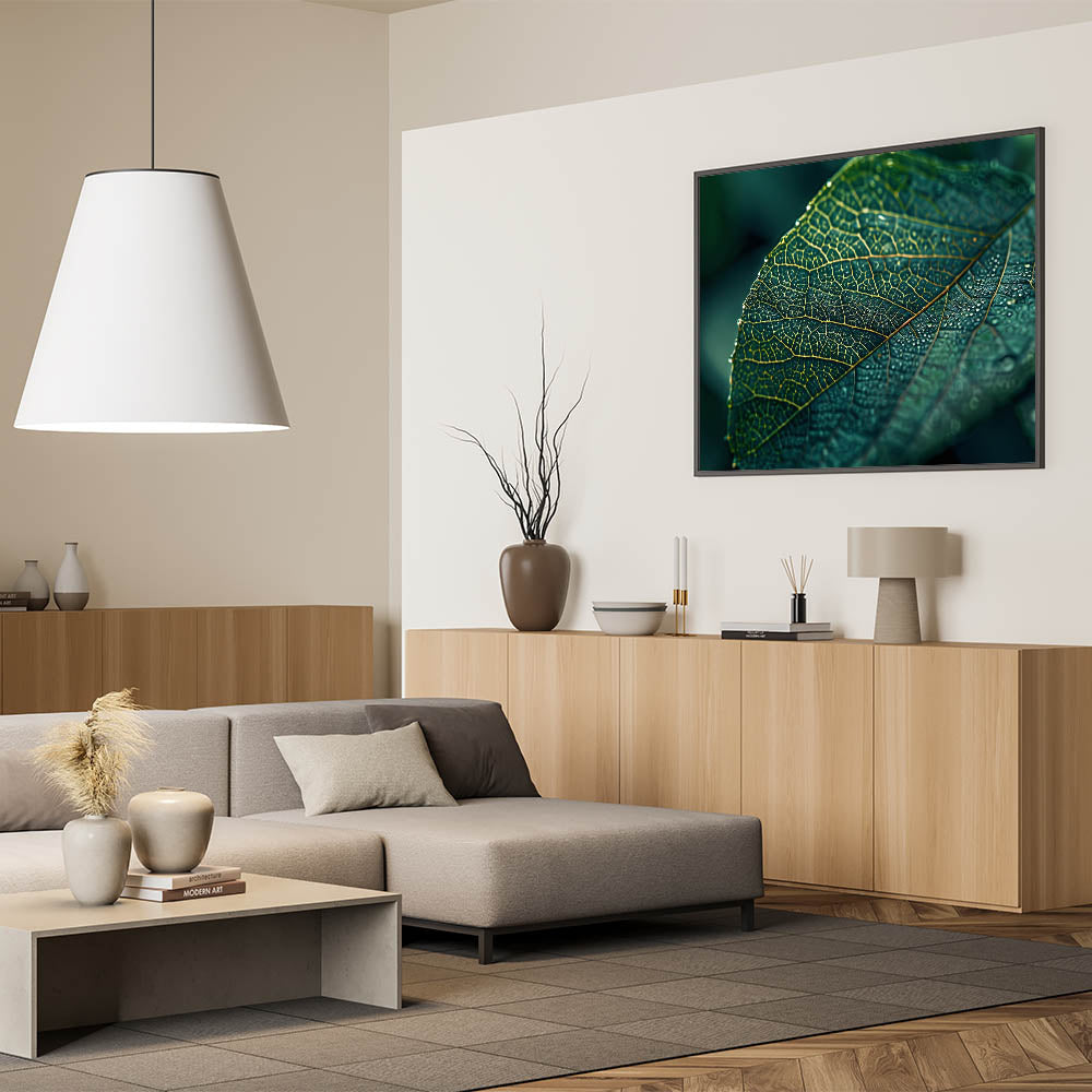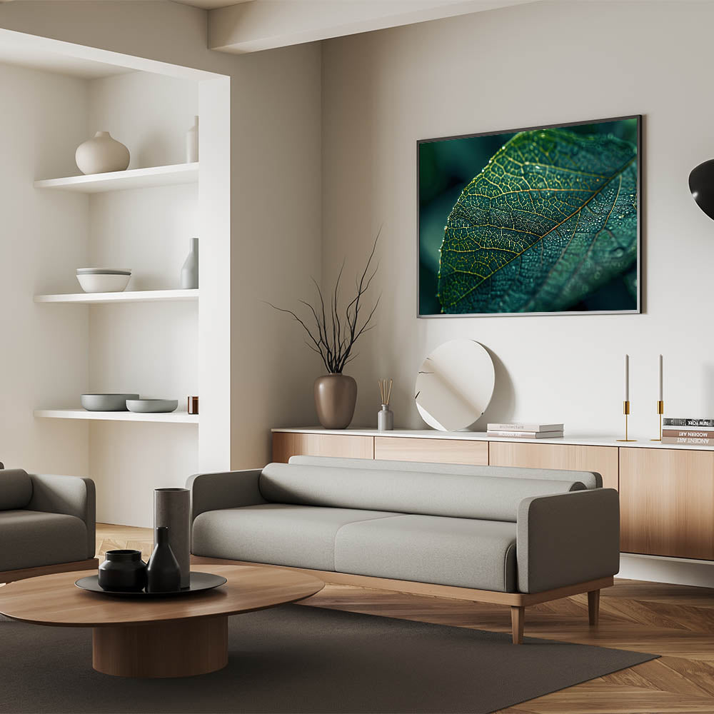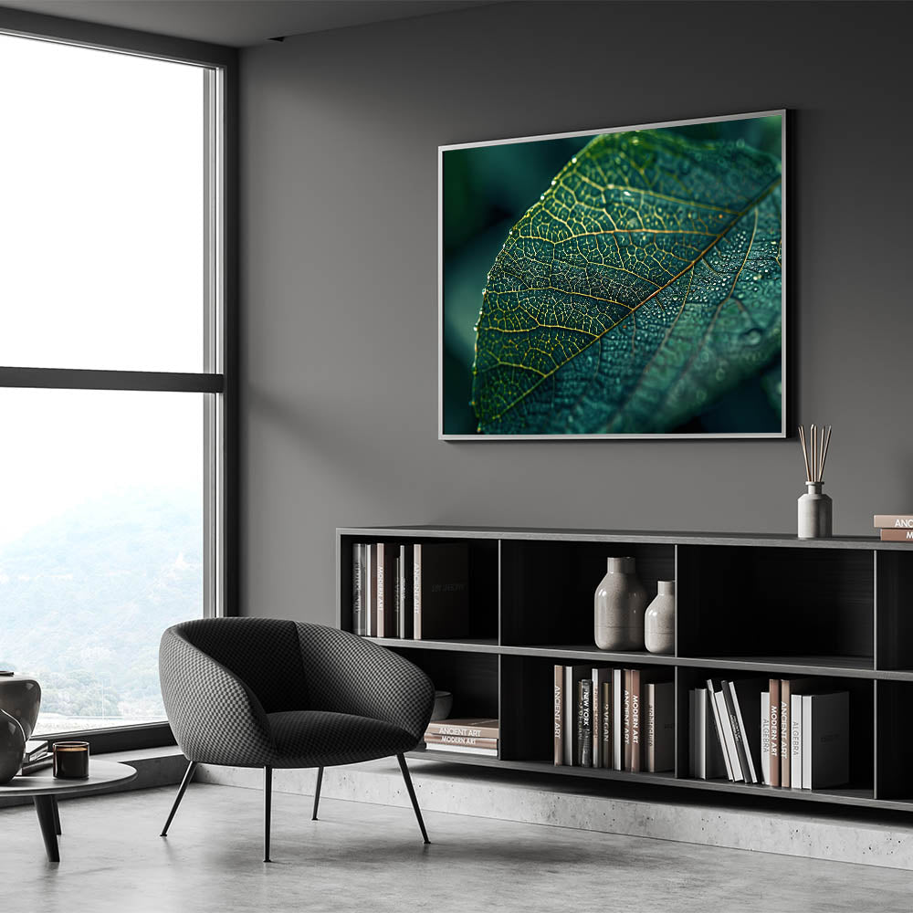 Capture the beauty of nature with this stunning leaf-themed wall art, featuring a close-up of a dew-covered green leaf. The intricate network of veins and the delicate droplets of water create a visually captivating piece that brings freshness and tranquility to any room. This nature-inspired leaf art is perfect for adding a serene, organic touch to modern or minimalist decor. The vibrant green hues and detailed textures make this leaf canvas print an ideal choice for living rooms, bedrooms, or offices.