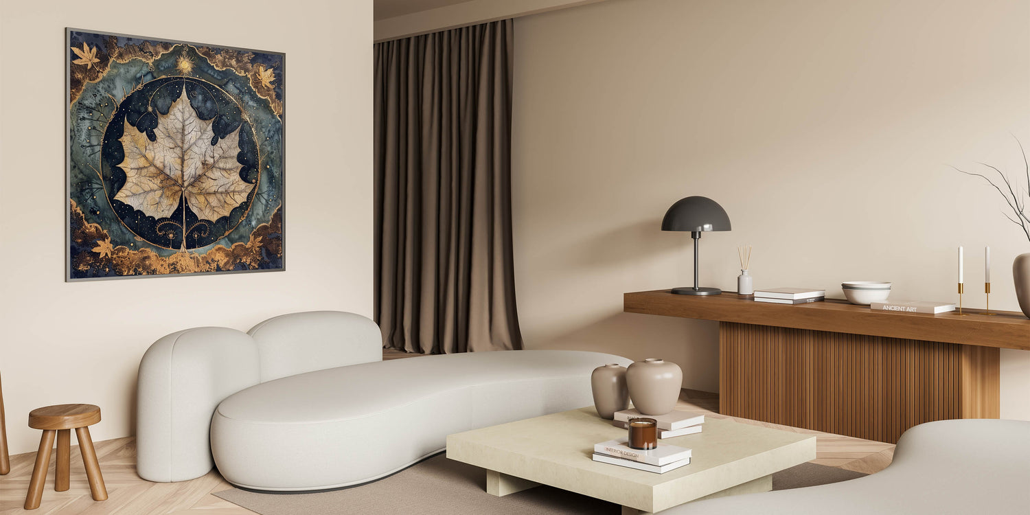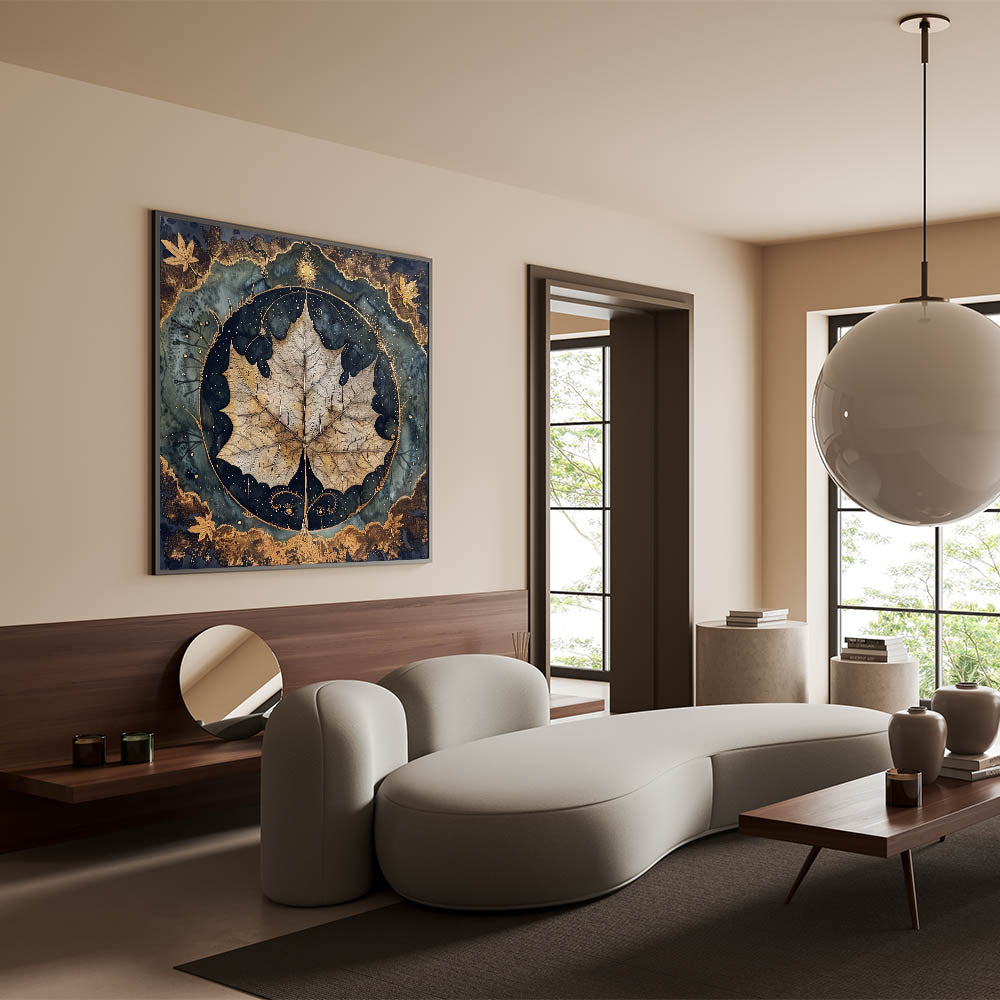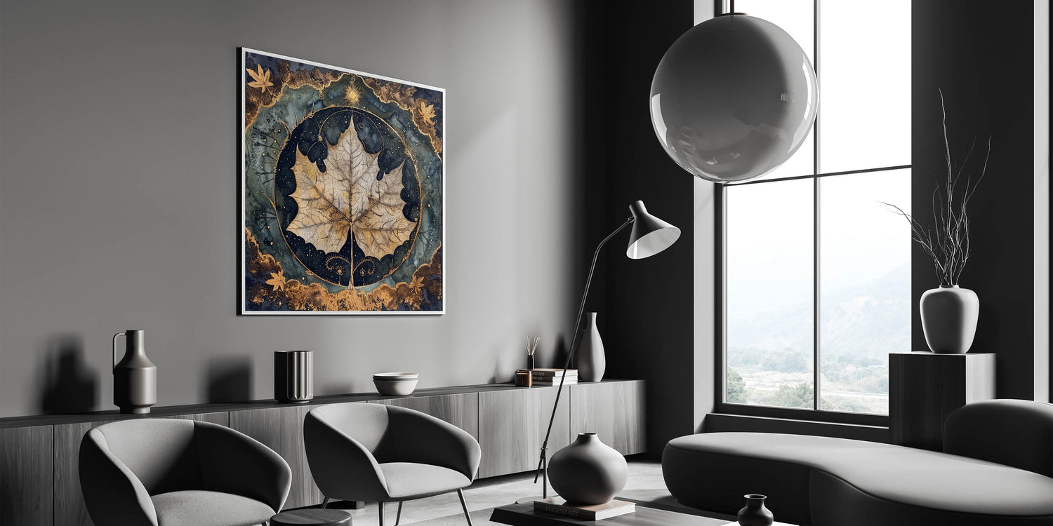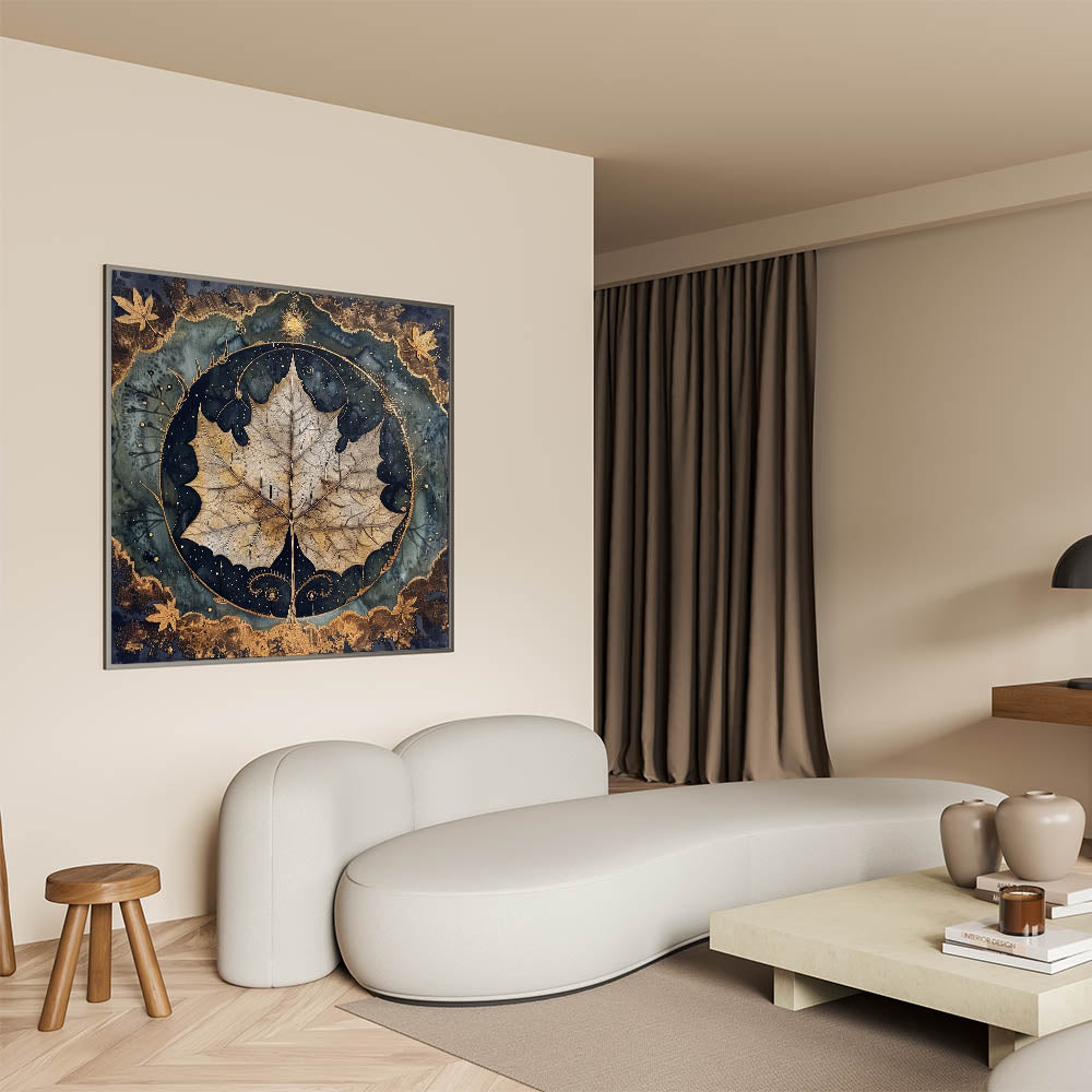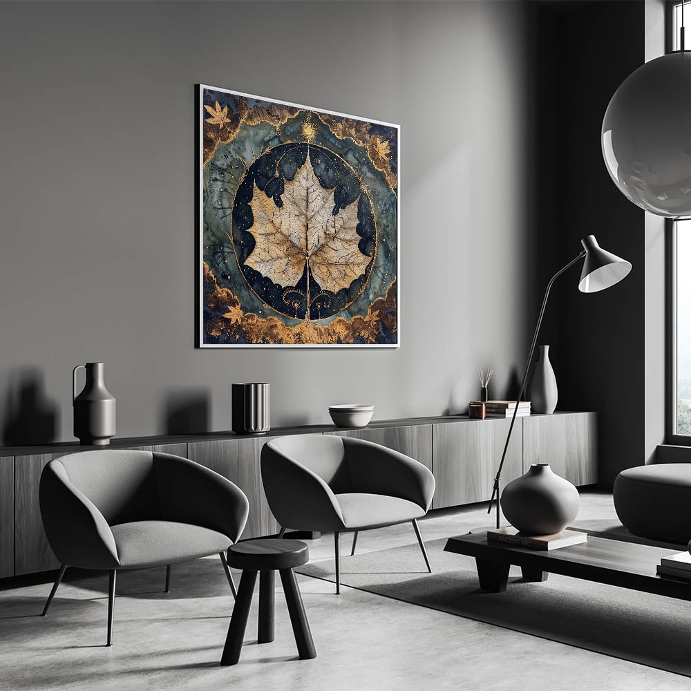Elevate your home decor with this captivating golden leaf wall art. The design highlights a beautifully detailed, close-up leaf in golden-brown hues, set against a dramatic dark green and black background. The intricate border features metallic accents, adding a touch of elegance and depth to the piece. The mystical elements surrounding the leaf create a unique visual appeal, perfect for nature and art enthusiasts.