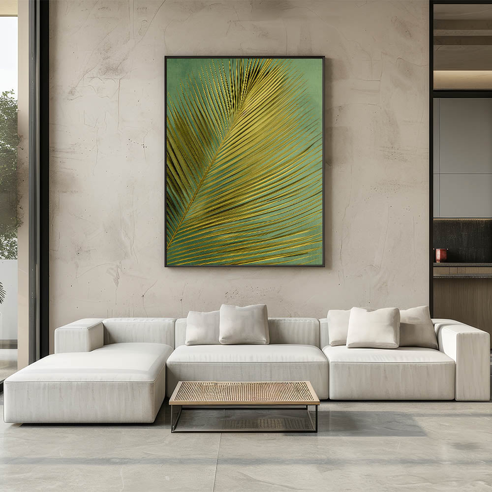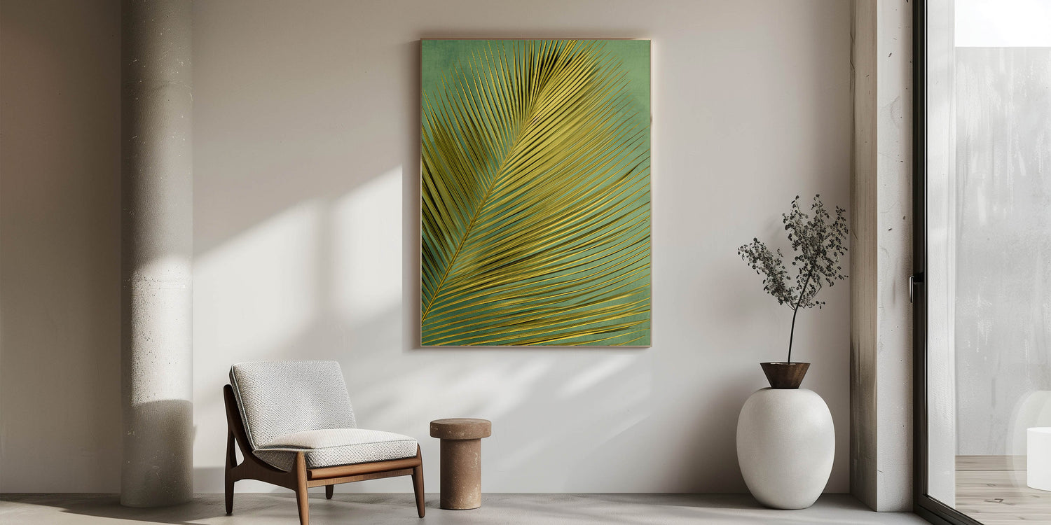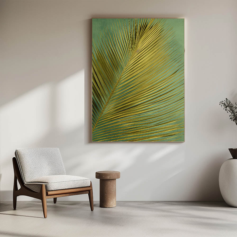 Bring the allure of the tropics into your home with this stunning golden palm leaf art print. The elegant, elongated fronds of the palm leaf create a striking pattern against a soft, textured green background, making it a perfect choice for those seeking a touch of nature and sophistication in their decor. The golden hues of the leaf catch the light beautifully, adding a sense of warmth and luxury to any space.