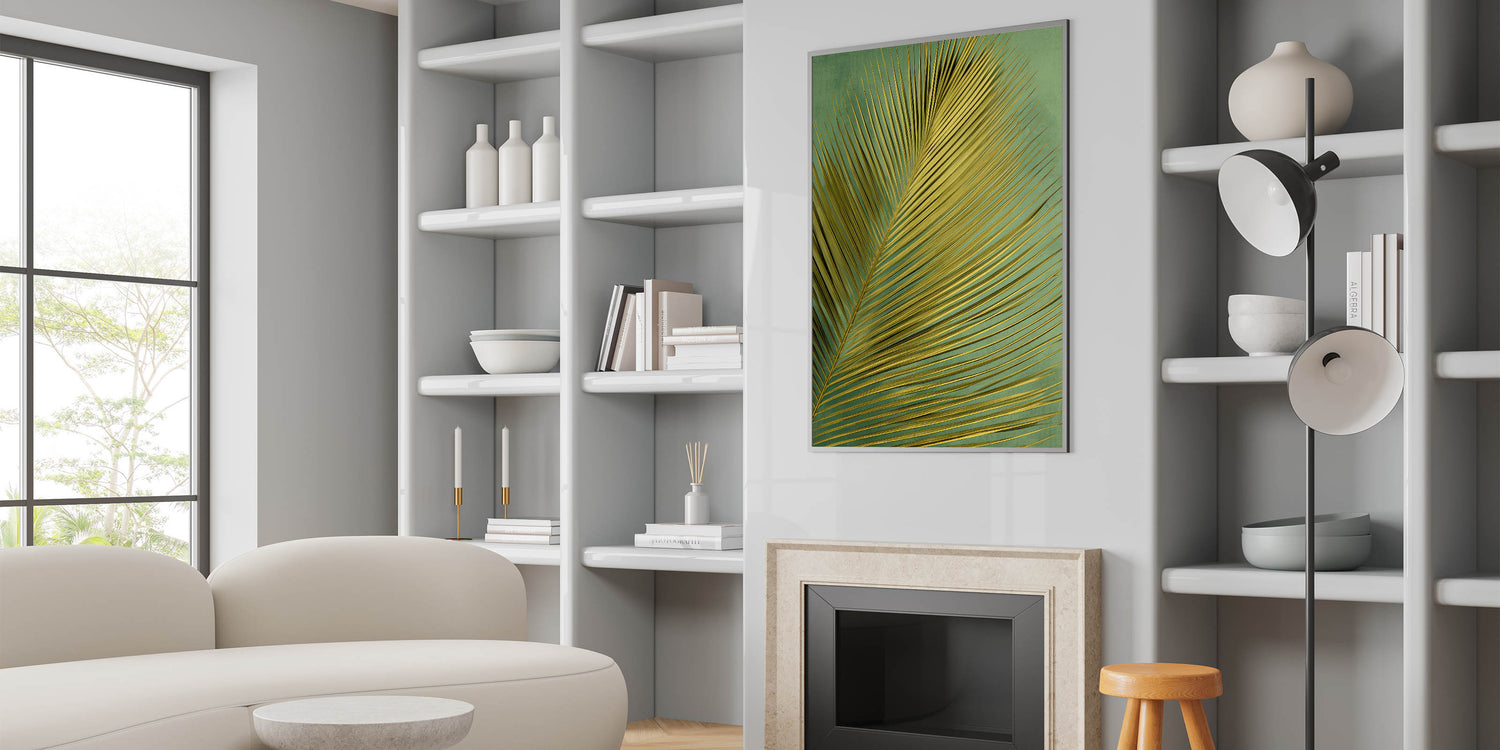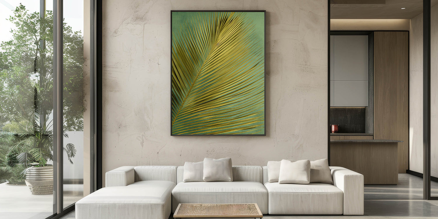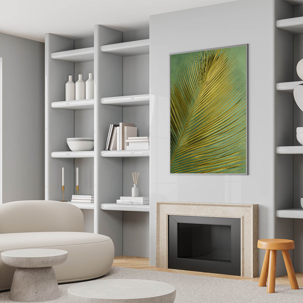 Bring the allure of the tropics into your home with this stunning golden palm leaf art print. The elegant, elongated fronds of the palm leaf create a striking pattern against a soft, textured green background, making it a perfect choice for those seeking a touch of nature and sophistication in their decor. The golden hues of the leaf catch the light beautifully, adding a sense of warmth and luxury to any space.