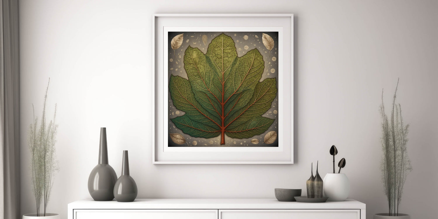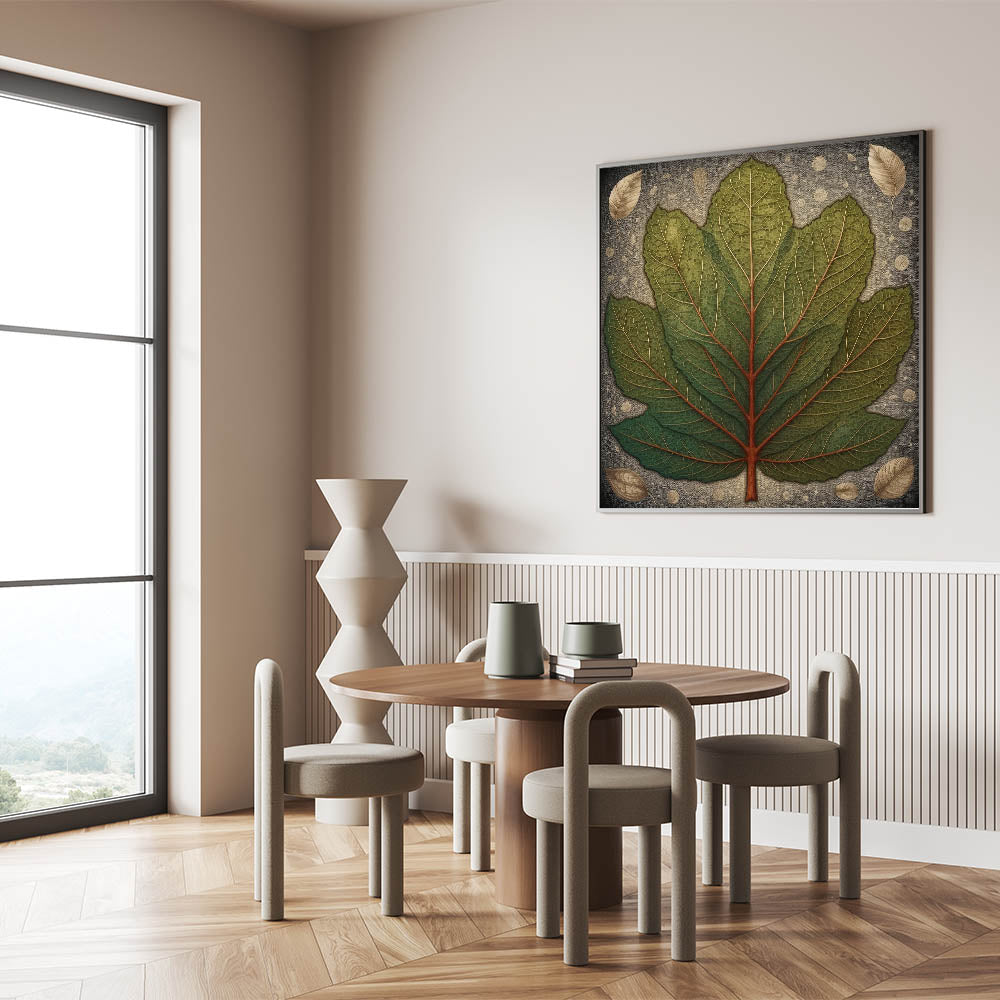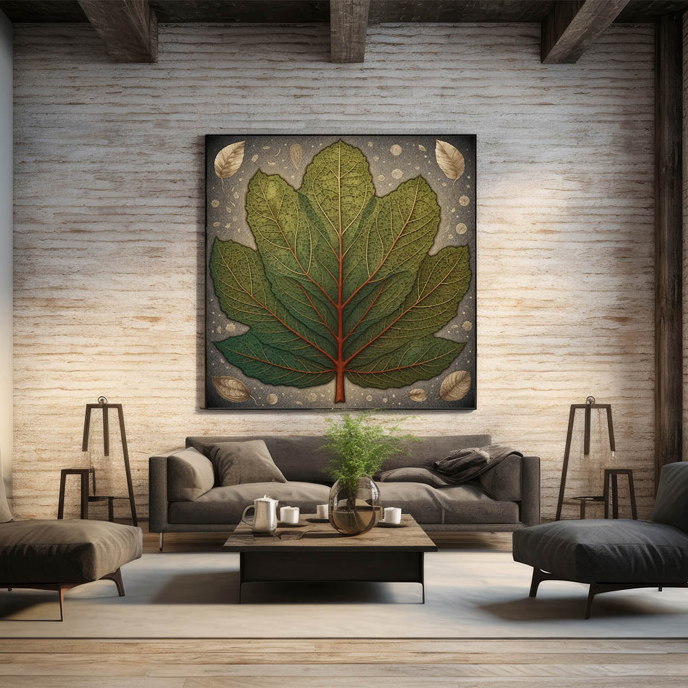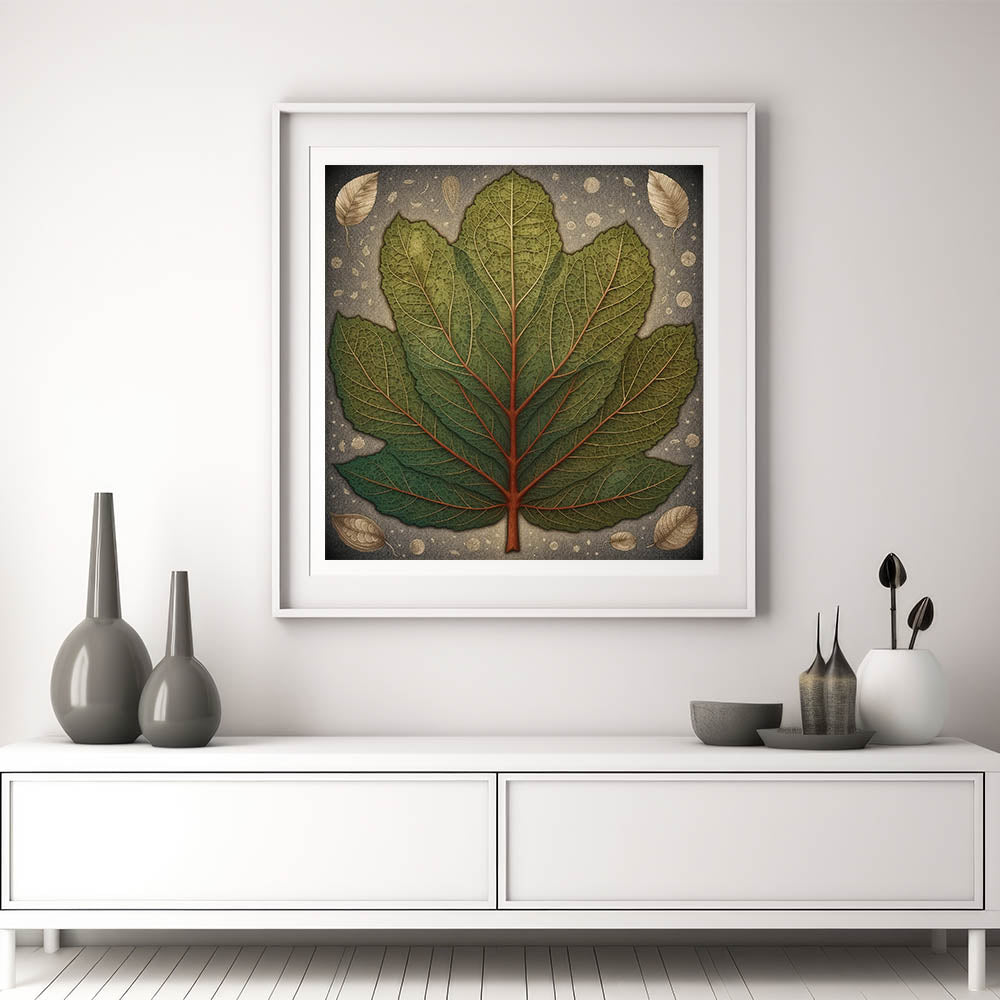 Bring the beauty of nature into your home with this stunning green leaf art print. The artwork showcases a large, intricately detailed leaf with a deep red stem, highlighting the natural vein patterns. Set against a speckled, textured background, the piece features delicate floating leaves, adding a whimsical touch. The vibrant green tones and earthy accents make this artwork perfect for nature lovers and those looking to add a fresh, botanical aesthetic to their space.