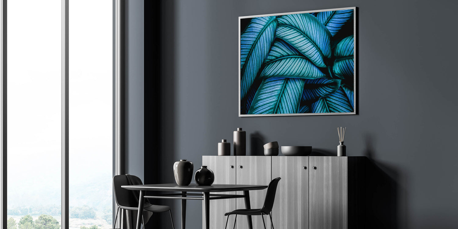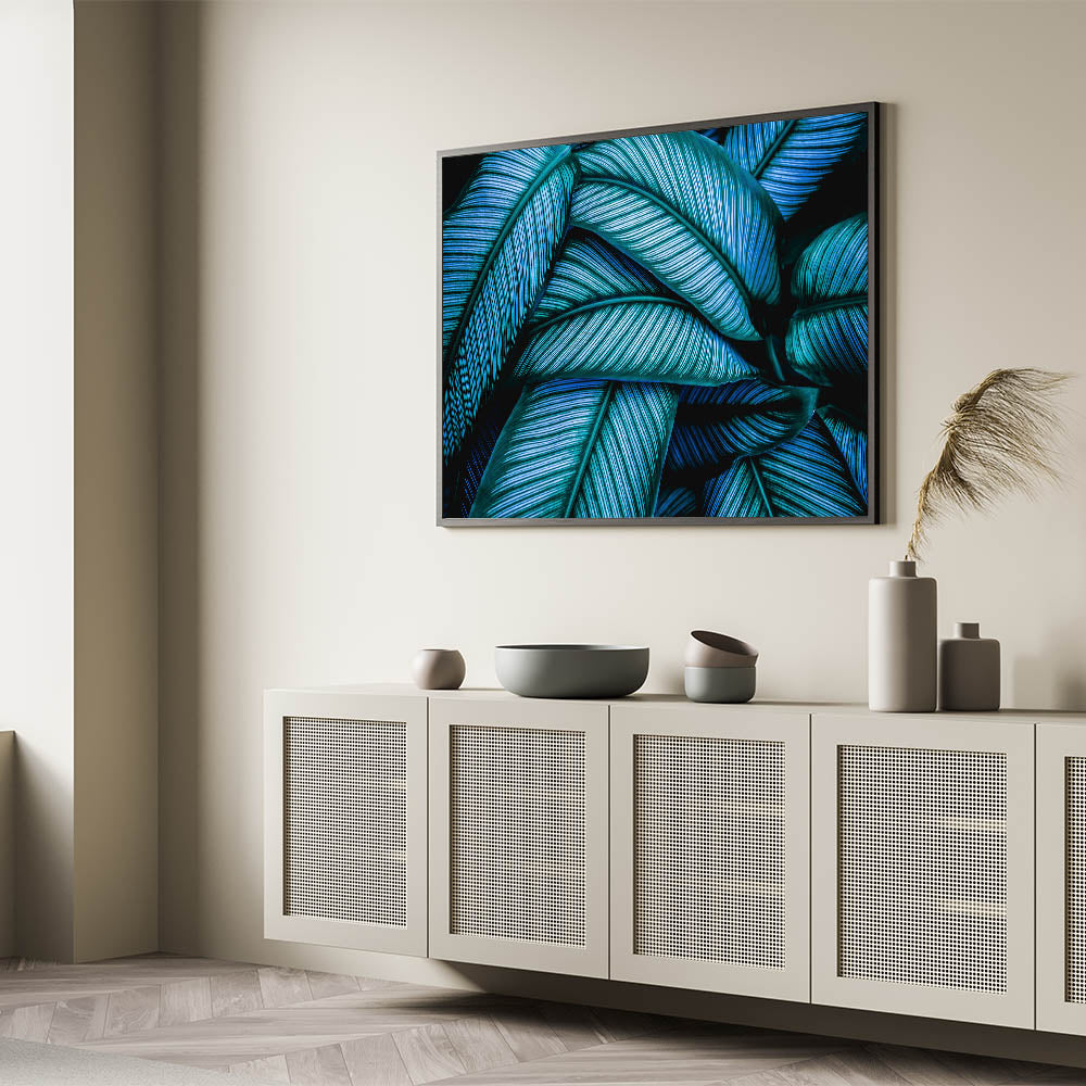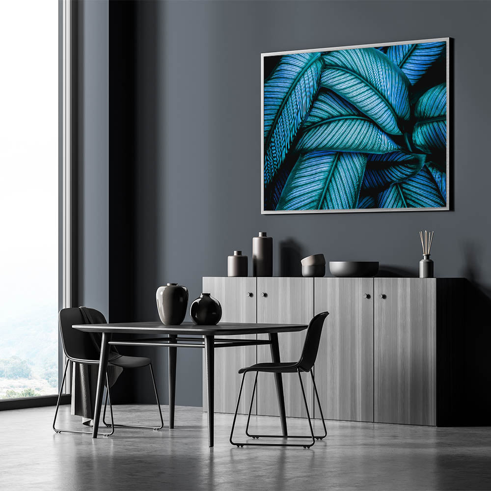 Transform your space with this captivating leaf photography art, featuring an intricate close-up of tropical leaves in vibrant blue and green tones. The striking contrast and detailed texture of the leaves create a mesmerizing visual that instantly enhances any room's atmosphere. This botanical leaf print is perfect for adding a bold and refreshing touch to your home, offering a nature-inspired elegance that pairs beautifully with modern or tropical interior themes.