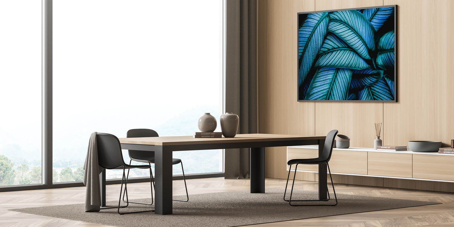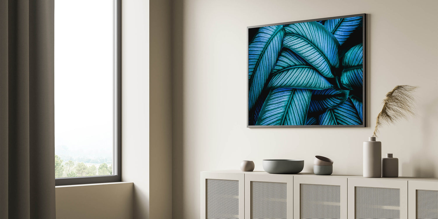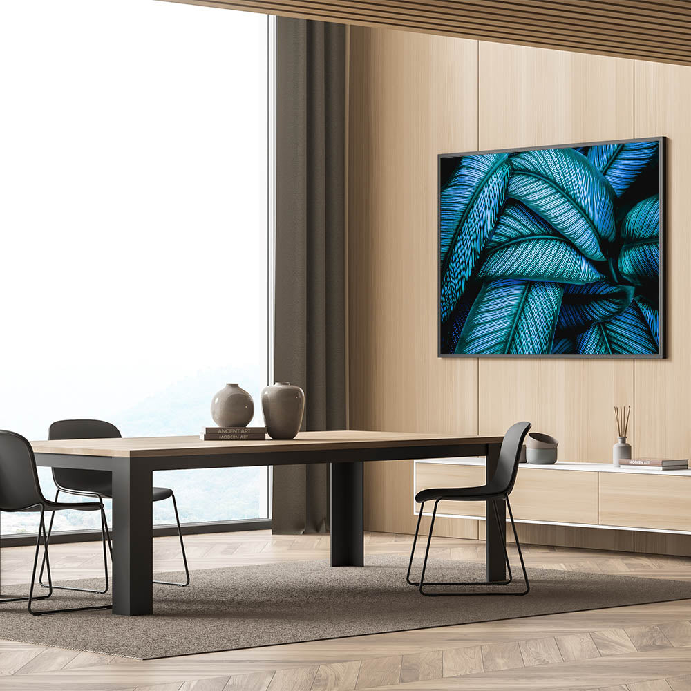Transform your space with this captivating leaf photography art, featuring an intricate close-up of tropical leaves in vibrant blue and green tones. The striking contrast and detailed texture of the leaves create a mesmerizing visual that instantly enhances any room's atmosphere. This botanical leaf print is perfect for adding a bold and refreshing touch to your home, offering a nature-inspired elegance that pairs beautifully with modern or tropical interior themes.