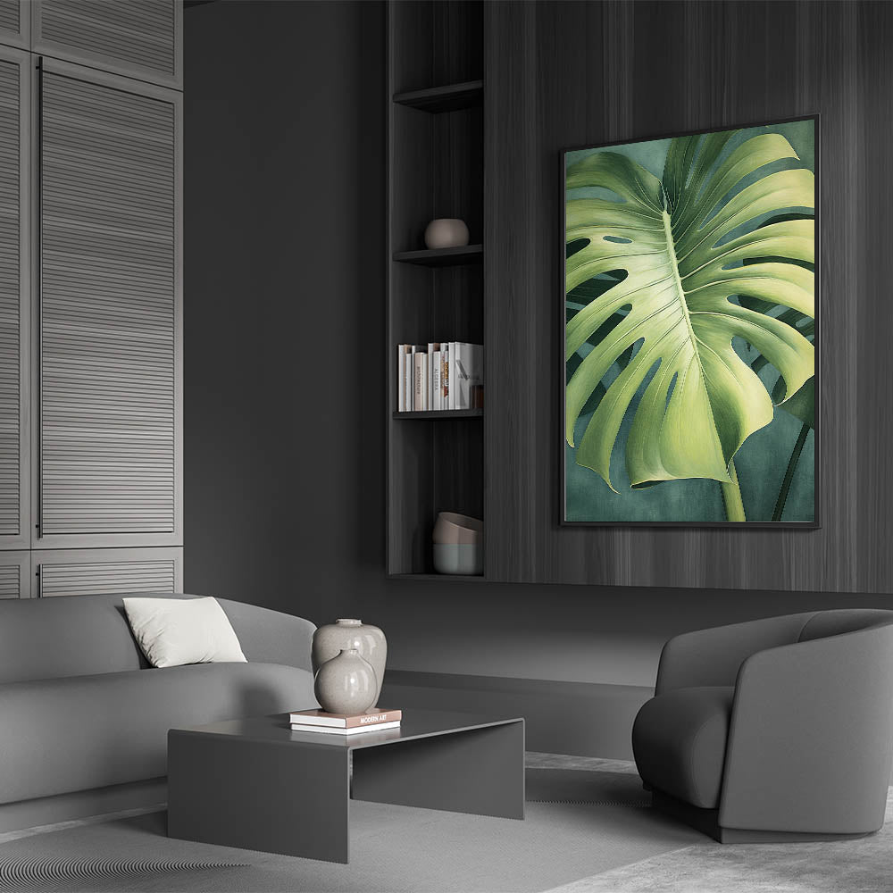 Elevate your space with this elegant monstera leaf art print, featuring a close-up view of a beautifully detailed leaf. The soft gradient green tones of the leaf create a calming and natural aesthetic, while the dark, muted background adds depth and contrast. The artwork captures the iconic cuts and intricate textures of the monstera leaf, making it a perfect choice for anyone who appreciates minimalist, nature-inspired decor.