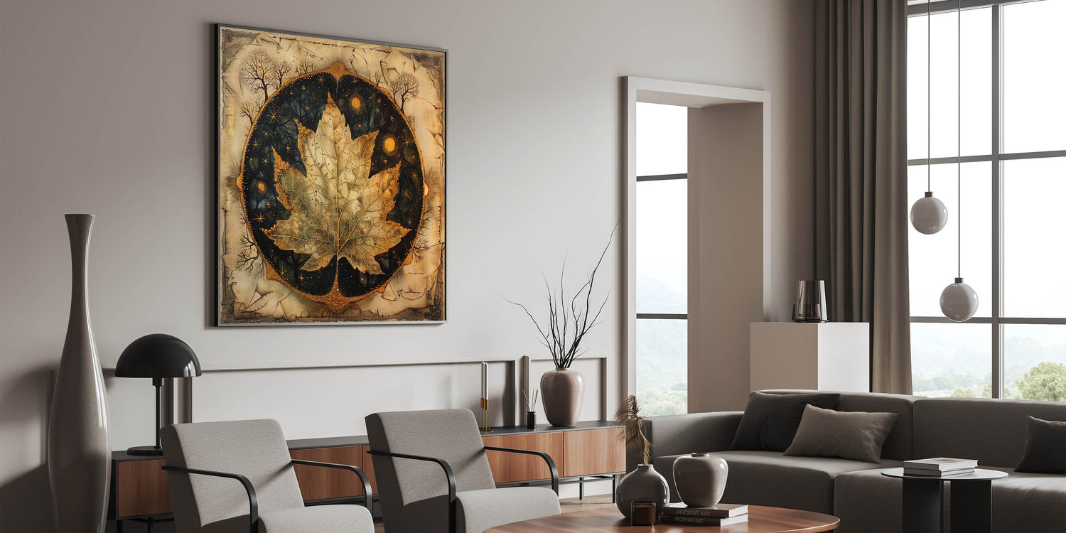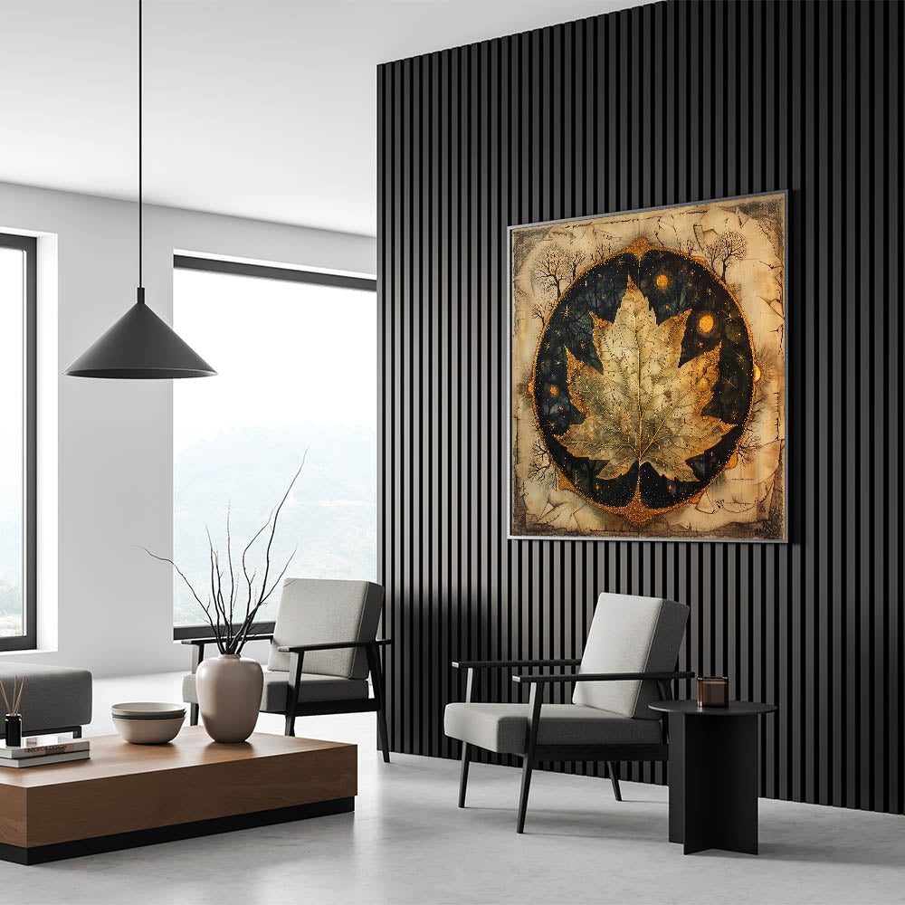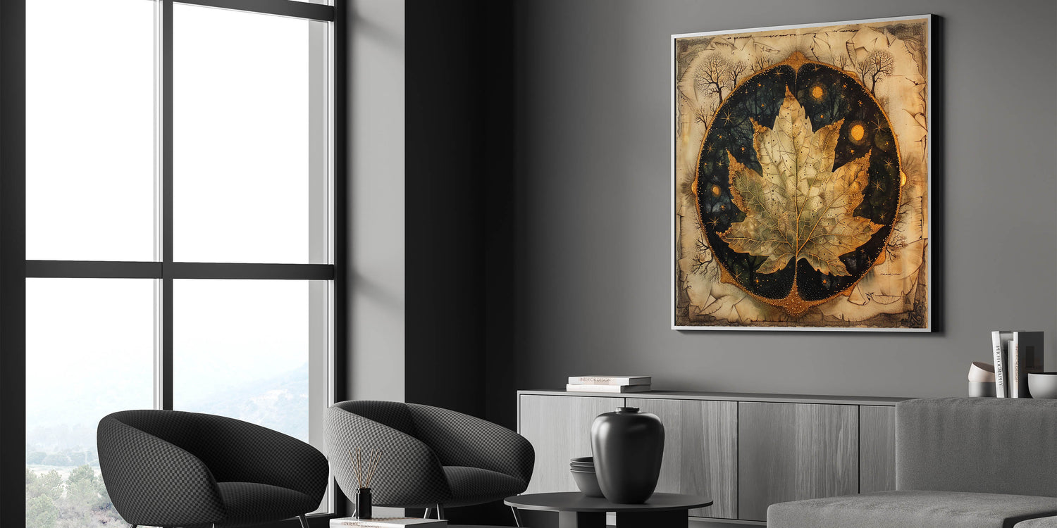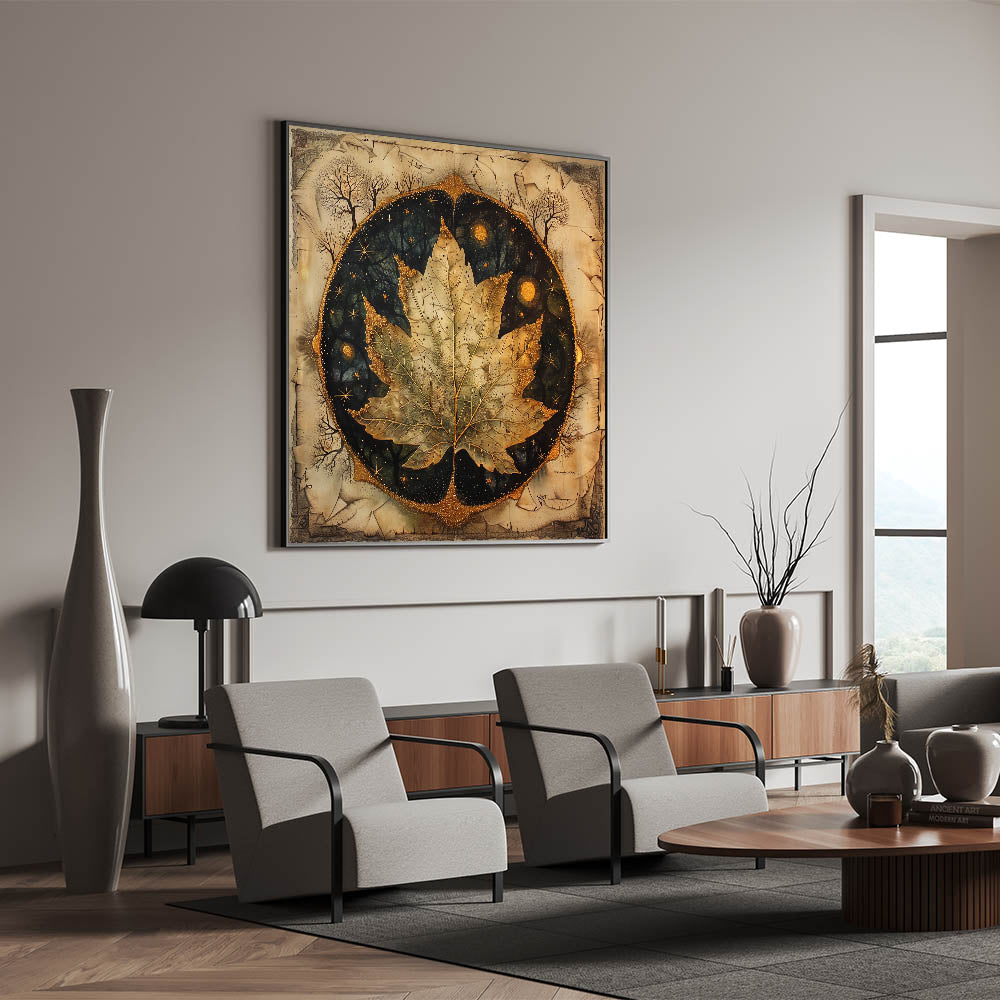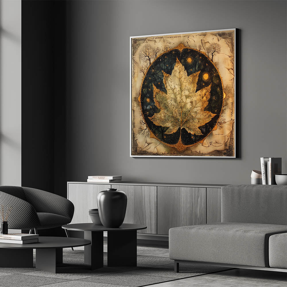Discover the enchanting beauty of this mystical maple leaf art print. The design features a large, detailed maple leaf highlighted with golden accents, set against a stunning cosmic night sky. The starry backdrop, combined with intricate tree silhouettes, creates a sense of wonder and serenity. The ornate, vintage-style frame adds an extra layer of elegance, making this piece a perfect choice for those who appreciate nature and celestial themes in their decor.