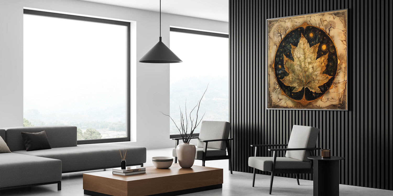 - Botanical leaf art featuring a maple leaf with golden highlights.