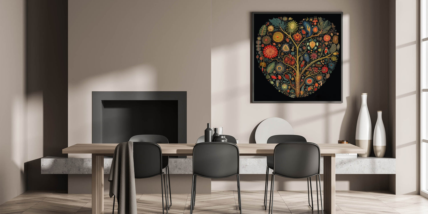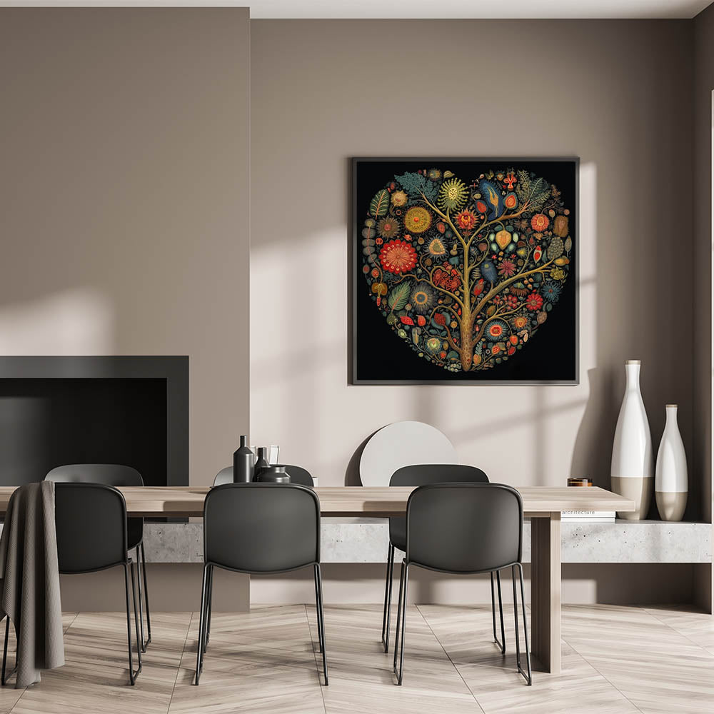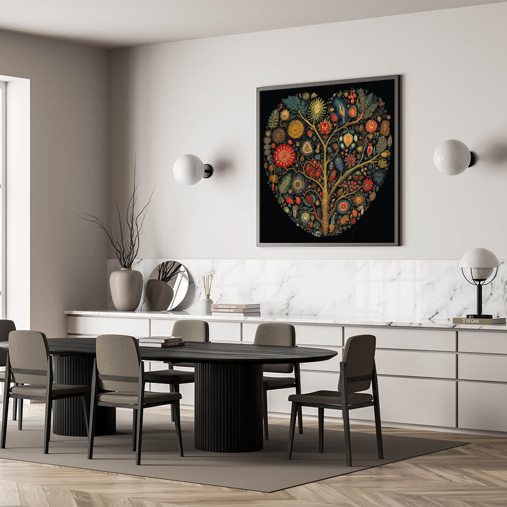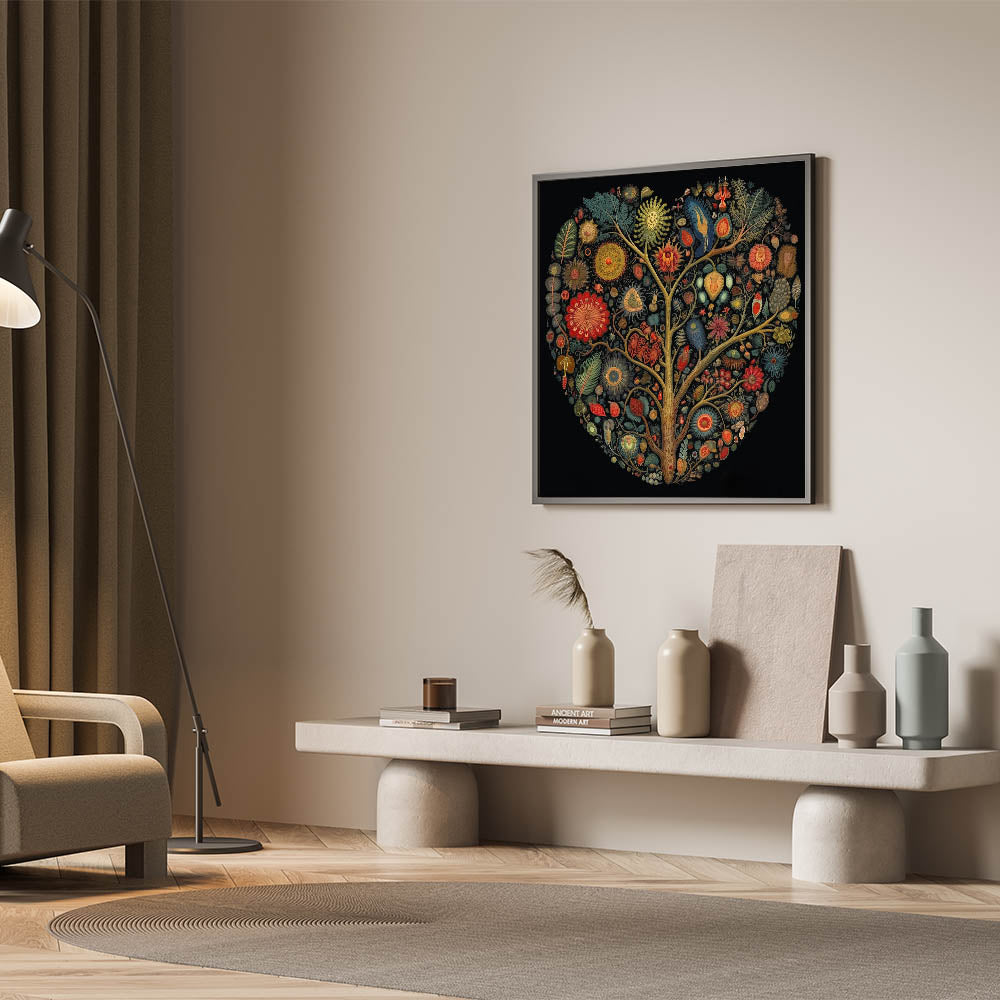 Discover the captivating beauty of this Tree of Life botanical leaf art. The heart-shaped design features a tree-like composition filled with intricately detailed leaves and flowers, bringing together a stunning array of colors and natural elements. This nature-inspired leaf art piece is perfect for those who appreciate the delicate beauty of close-up leaf photography and the elegance of botanical prints. Ideal for enhancing living spaces, it adds a unique and calming presence to any interior.