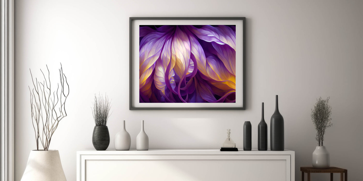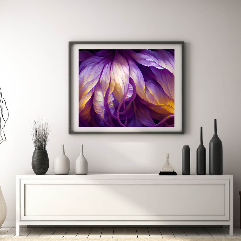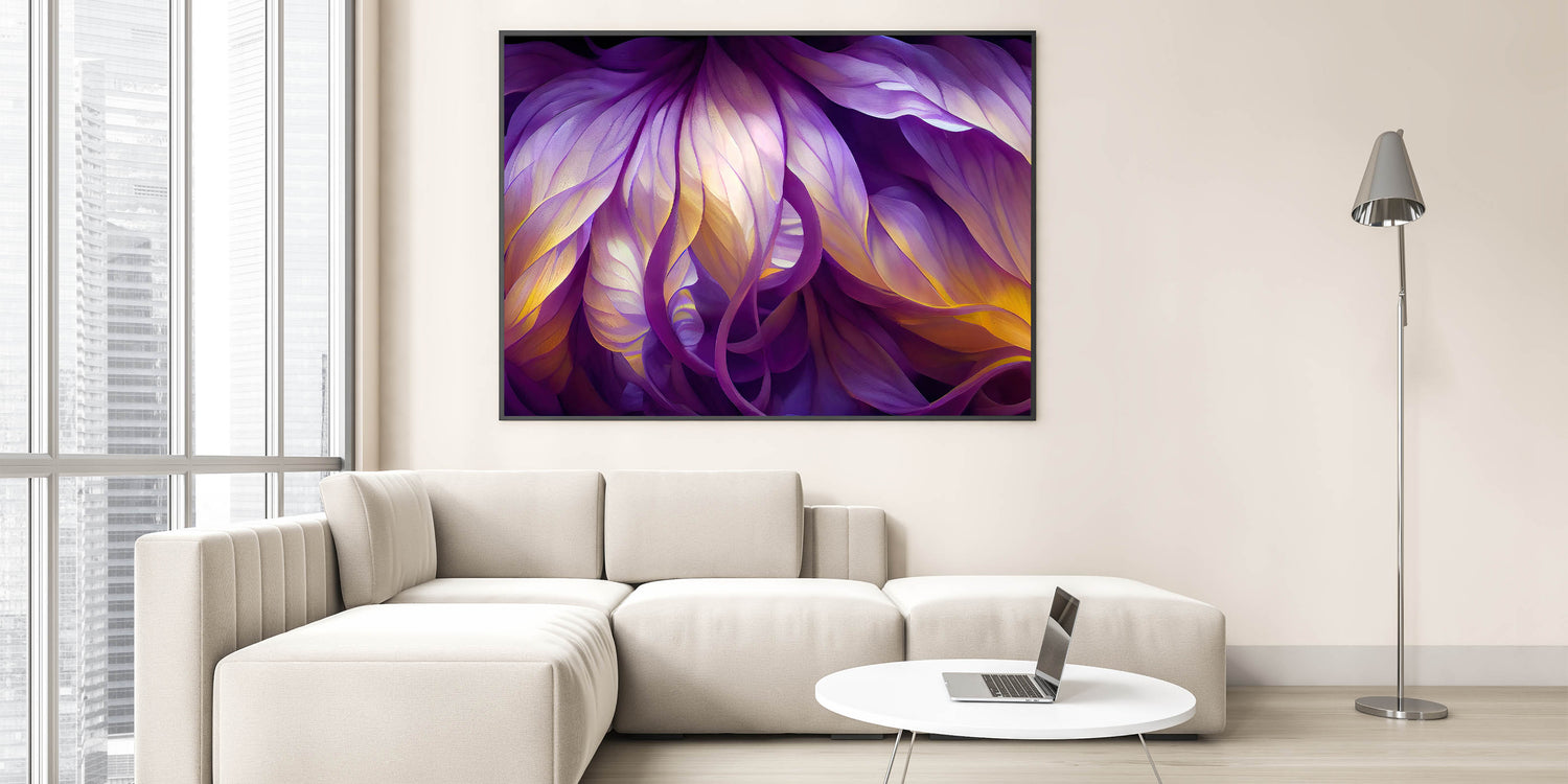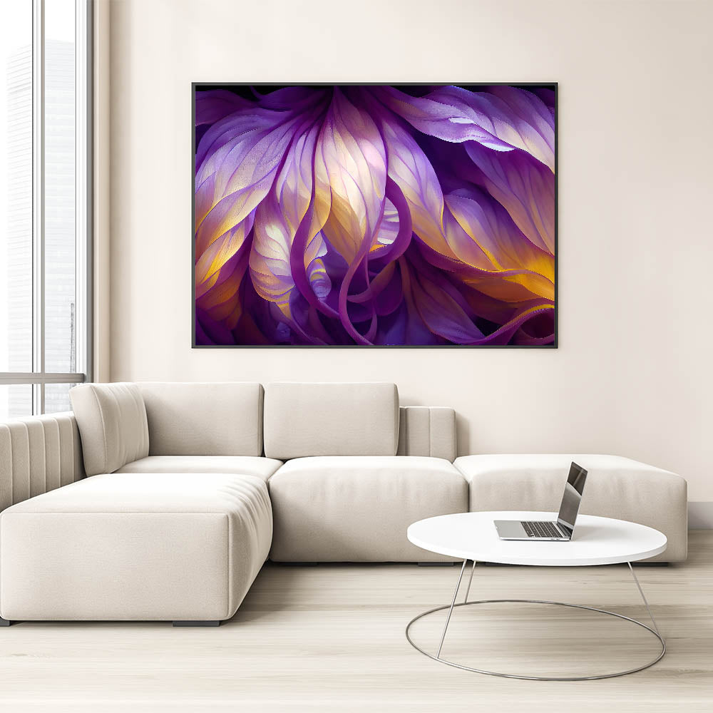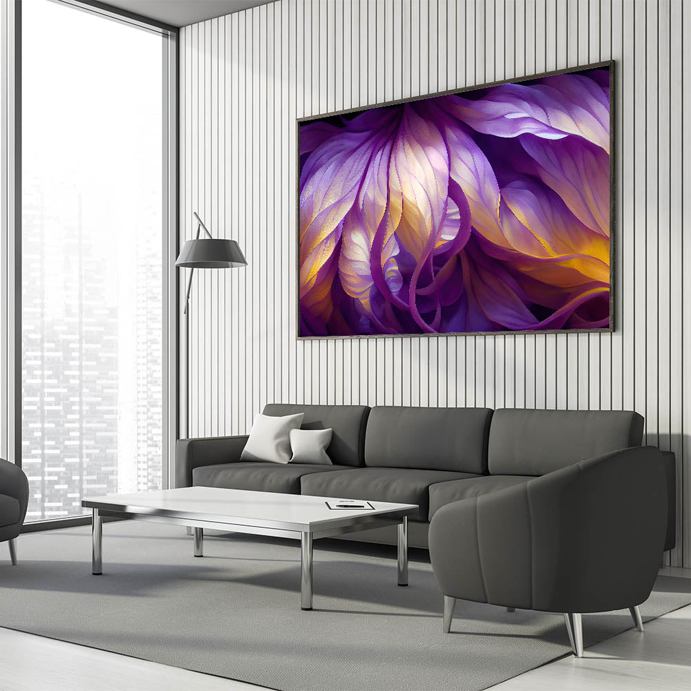 Infuse your home decor with elegance and sophistication using this striking leaf-themed wall art featuring vibrant purple and golden hues. This botanical leaf print showcases the flowing curves and rich colors of close-up leaf photography, adding a bold and artistic flair to any space. Whether you're decorating a living room, bedroom, or office, this leaf canvas print creates a visually stunning focal point.