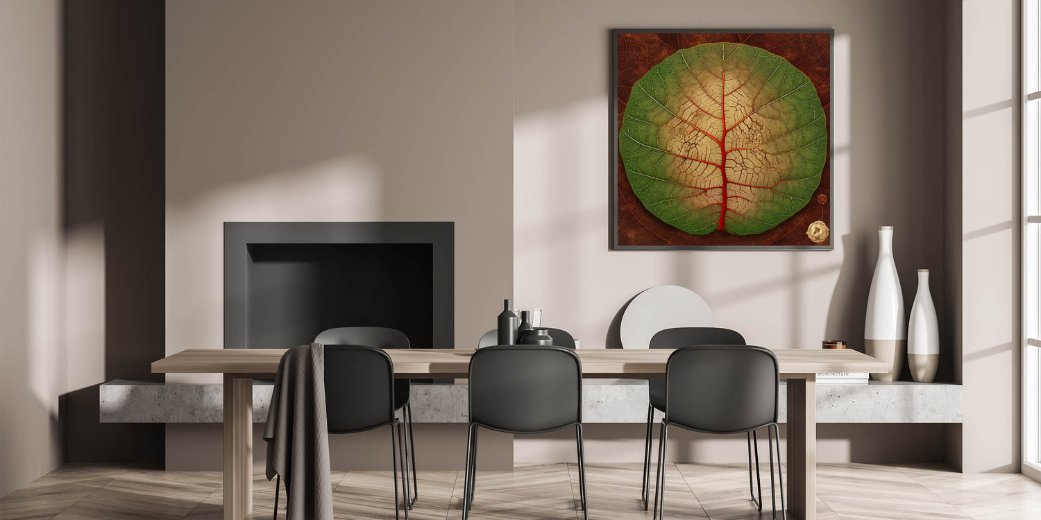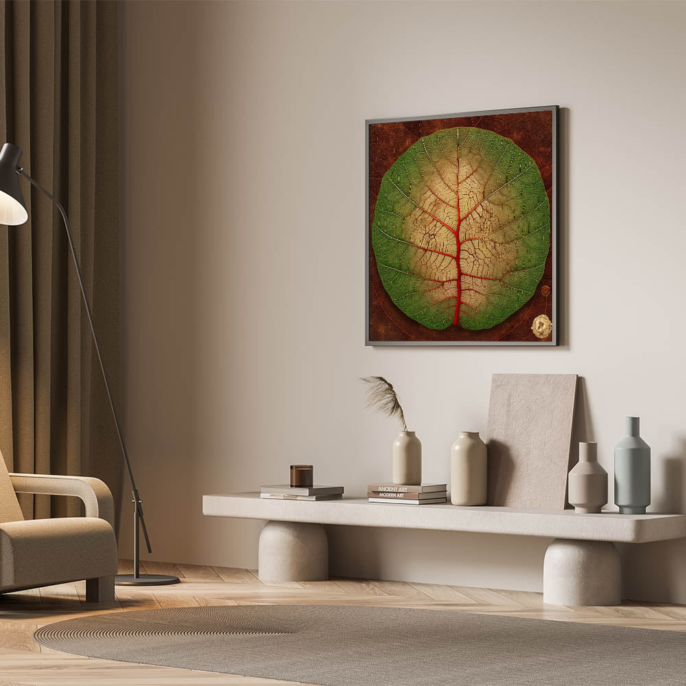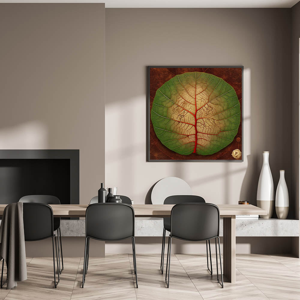 Transform your space with this vibrant close-up leaf art, showcasing the intricate beauty of nature. The circular leaf features a stunning gradient from lush green to soft beige, accentuated by bold red veins that draw the eye to its unique pattern. The detailed textures and rich earthy tones make this botanical print a perfect statement piece for any room. Whether you're a nature enthusiast or an art lover, this leaf-themed decor brings a touch of the outdoors inside.