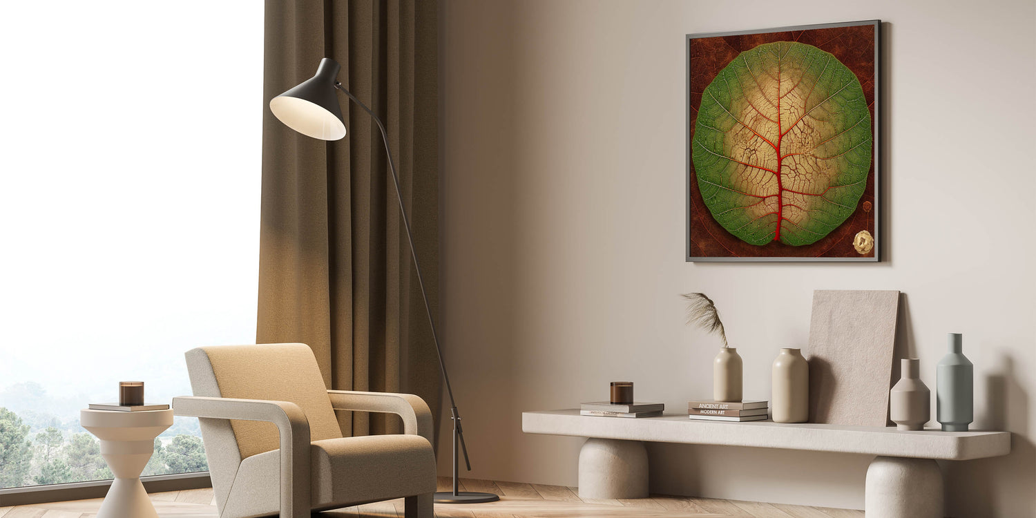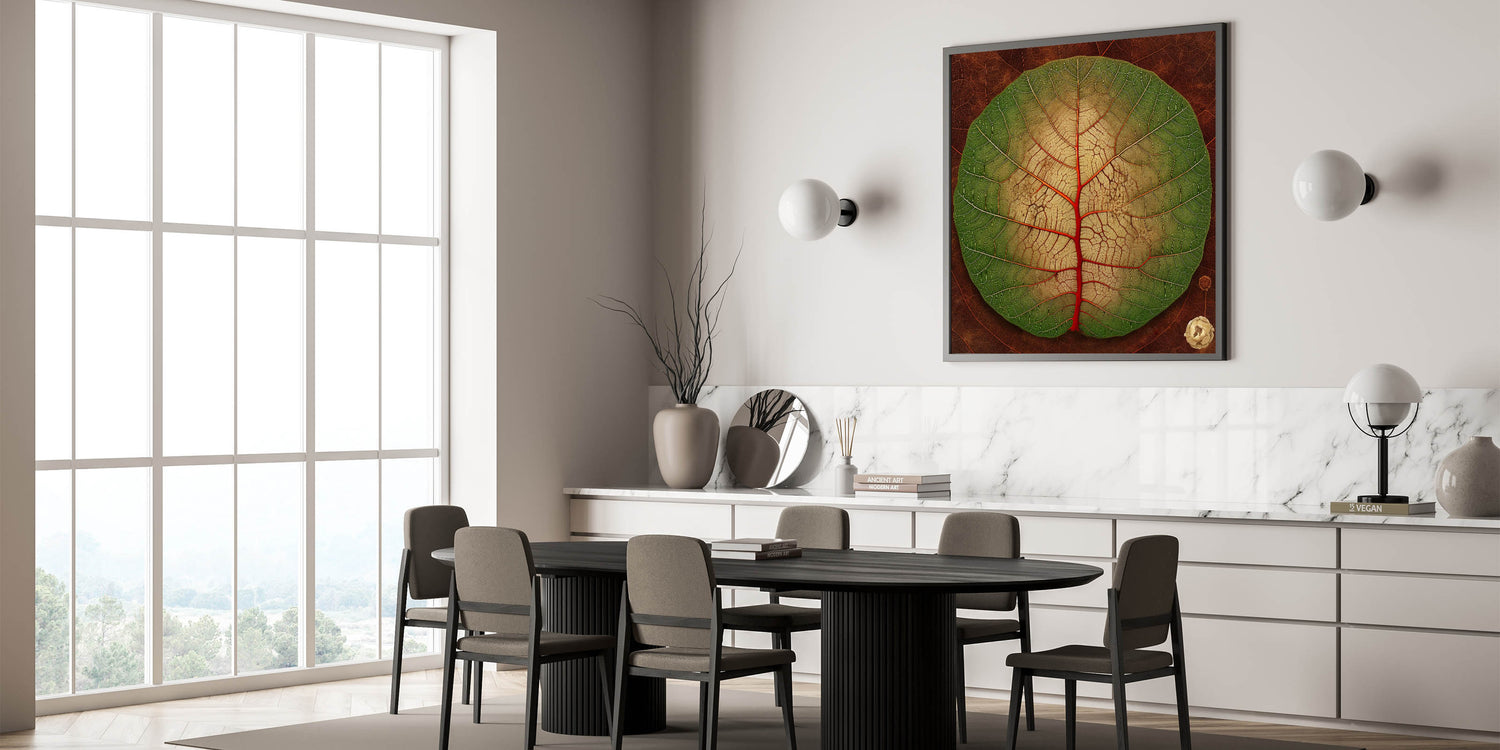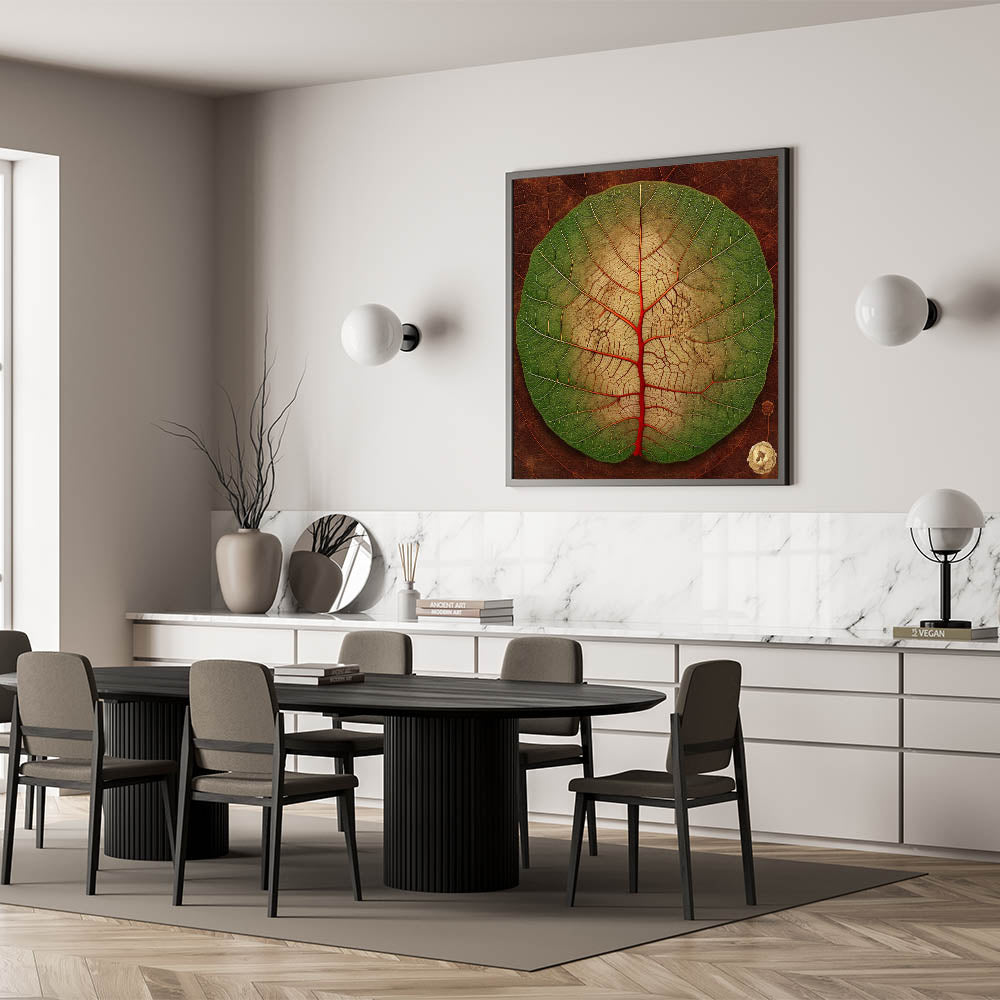 Transform your space with this vibrant close-up leaf art, showcasing the intricate beauty of nature. The circular leaf features a stunning gradient from lush green to soft beige, accentuated by bold red veins that draw the eye to its unique pattern. The detailed textures and rich earthy tones make this botanical print a perfect statement piece for any room. Whether you're a nature enthusiast or an art lover, this leaf-themed decor brings a touch of the outdoors inside.