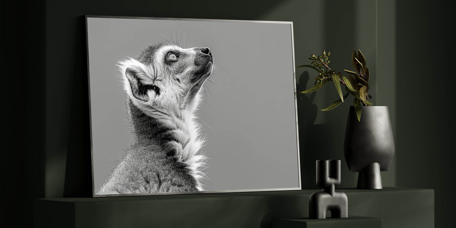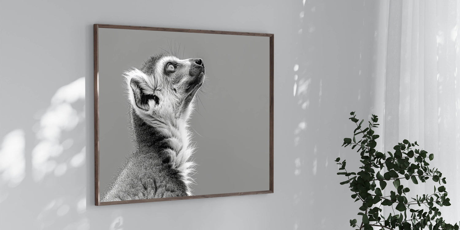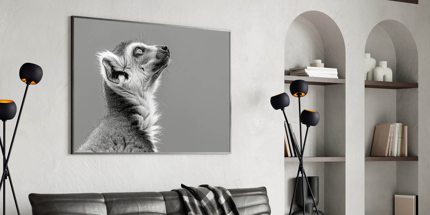 Ideal for living rooms, bedrooms, or offices, this lemur art print brings a calm and contemplative vibe to your decor. Its understated elegance and timeless appeal make it a versatile addition to any art collection.