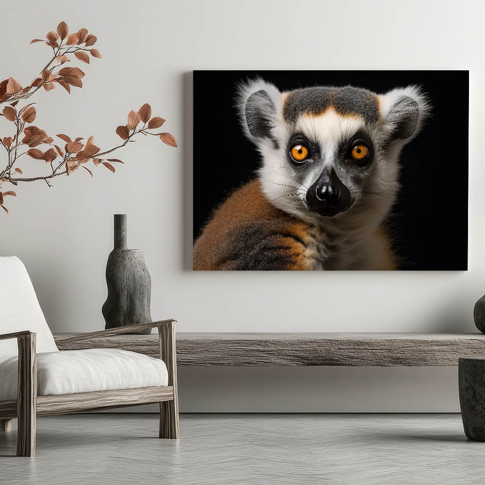 Capture the intensity and beauty of the wild with this Vivid Lemur Canvas Art. This striking piece features a lemur staring directly at the viewer, its bright golden eyes contrasting sharply against the dark background. The high-definition detail and rich color palette make this artwork a captivating centerpiece for any room, perfect for wildlife enthusiasts and art collectors alike.