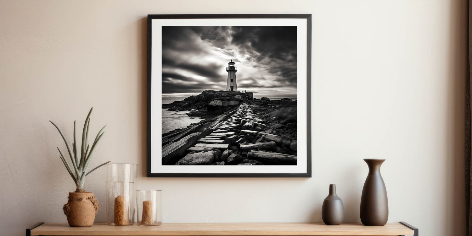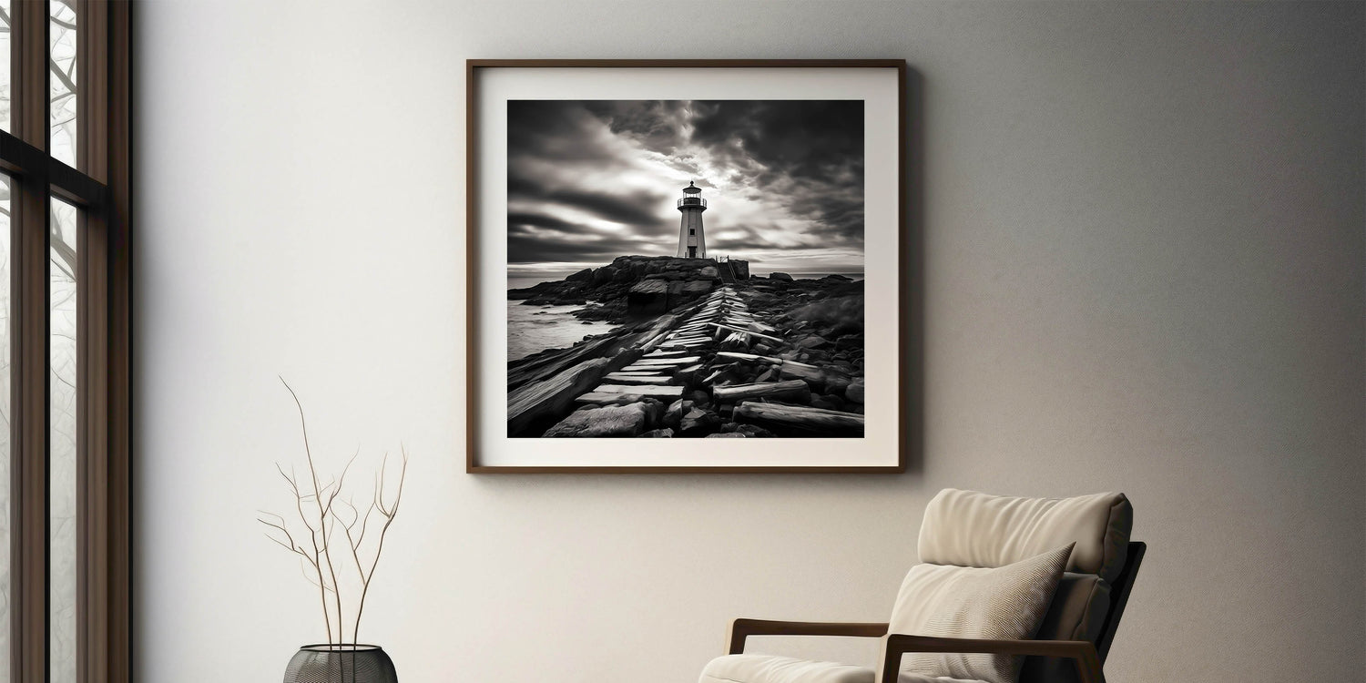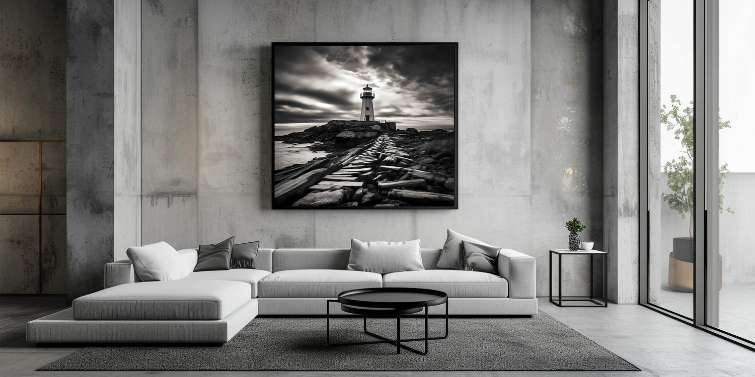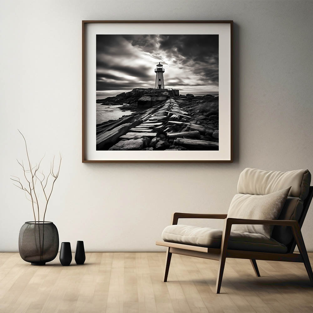 Transform your living space with this breathtaking Majestic Coastal Lighthouse Art. This stunning piece captures the timeless beauty of a seaside lighthouse standing tall against the dramatic sky. Perfect for those who love nautical themes, this art piece will bring a serene coastal vibe to your home.
