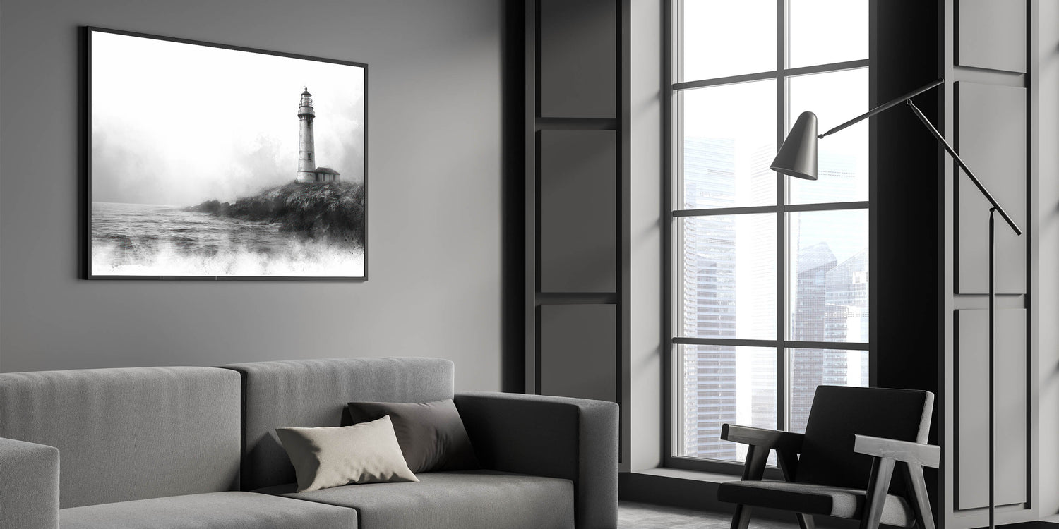 Embrace the mysterious beauty of the coast with this Moody Lighthouse in Fog wall art. This striking piece captures the haunting allure of a lighthouse shrouded in fog, standing as a solitary guardian on a rugged shore. The high-contrast design with its muted tones creates a powerful and evocative image that draws you into the misty, atmospheric scene. Perfect for those who appreciate the drama and mystery of the sea, this artwork will add a unique and captivating touch to any room.